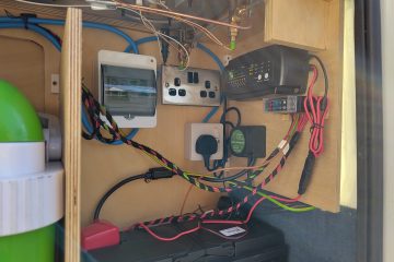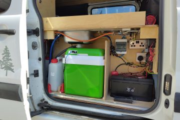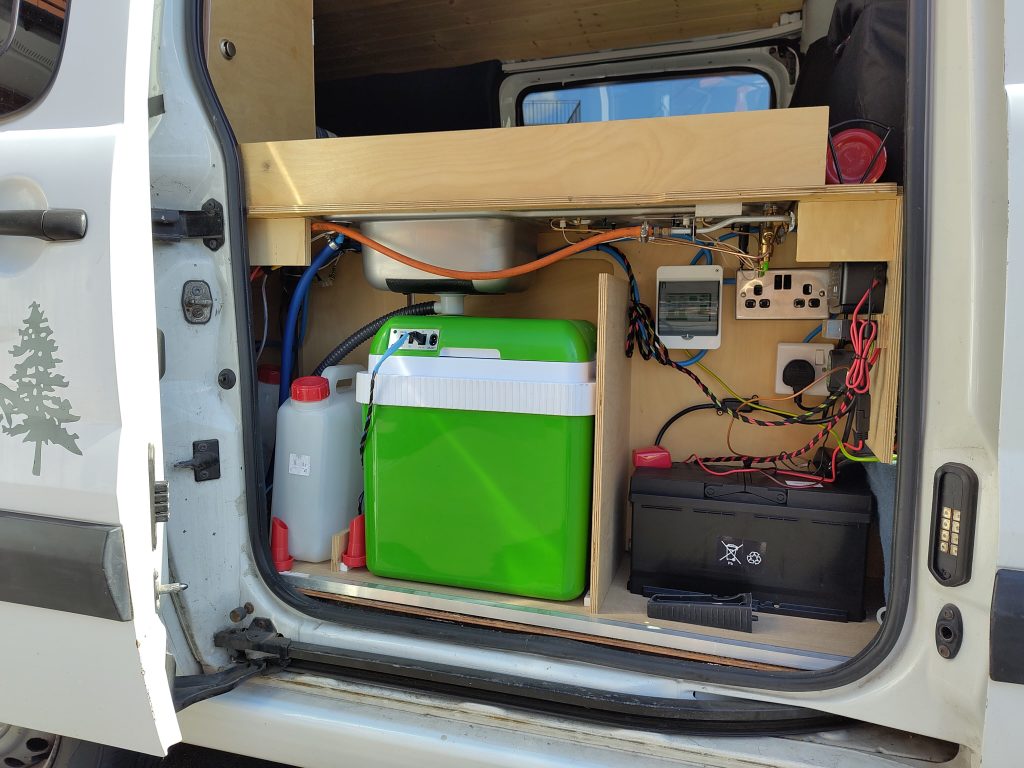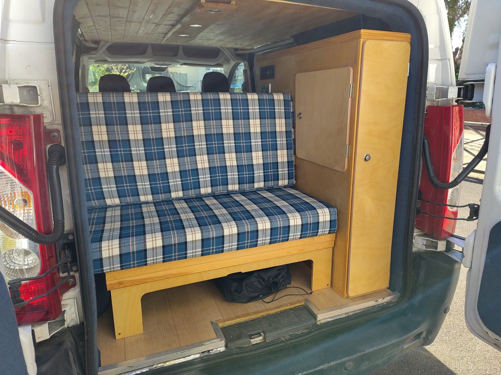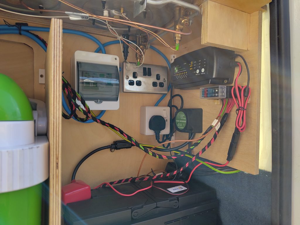 The leisure battery is nearly new, with a 95Ah capacity, and can be charged while driving or when connected to a 240V mains supply. The van is equipped with an external camping mains site plug, and comes with a cable to easily hook it up at campgrounds. There is a 12v control panel, which itself includes 6 switches, 2 USB sockets and one 12v socket. The 240v supplies power to 4 standard plug sockets.