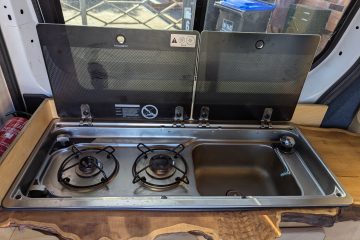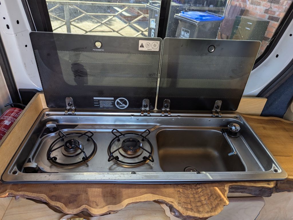 Adding a touch of character, the kitchen worktop is made from a live edge slab of yew, housing a Smev 1922 sink with a double gas hob. There’s a convenient fold-up table that provides enough space for meal prep and dining, right next to the cooker. The tap, connected to a 12V control panel, pumps fresh water from a 10L tank, draining into a matching 10L grey water tank. Both tanks are neatly stored under the sink, alongside a 25L plug-in cool box, which runs on either the 12V system or 240V mains. A 6KG Calor gas bottle supplies the cooker, securely fastened in a dedicated gas cupboard.