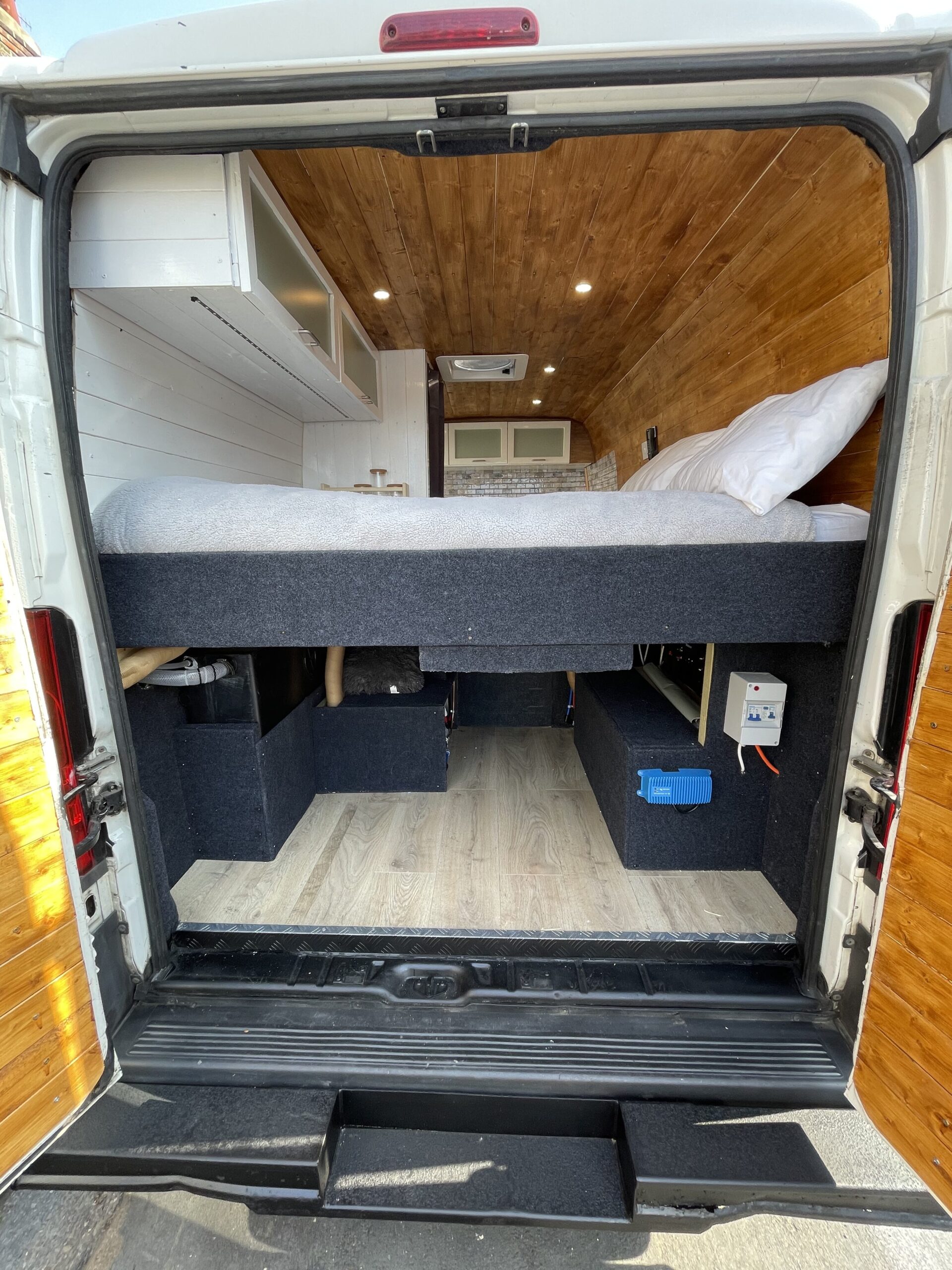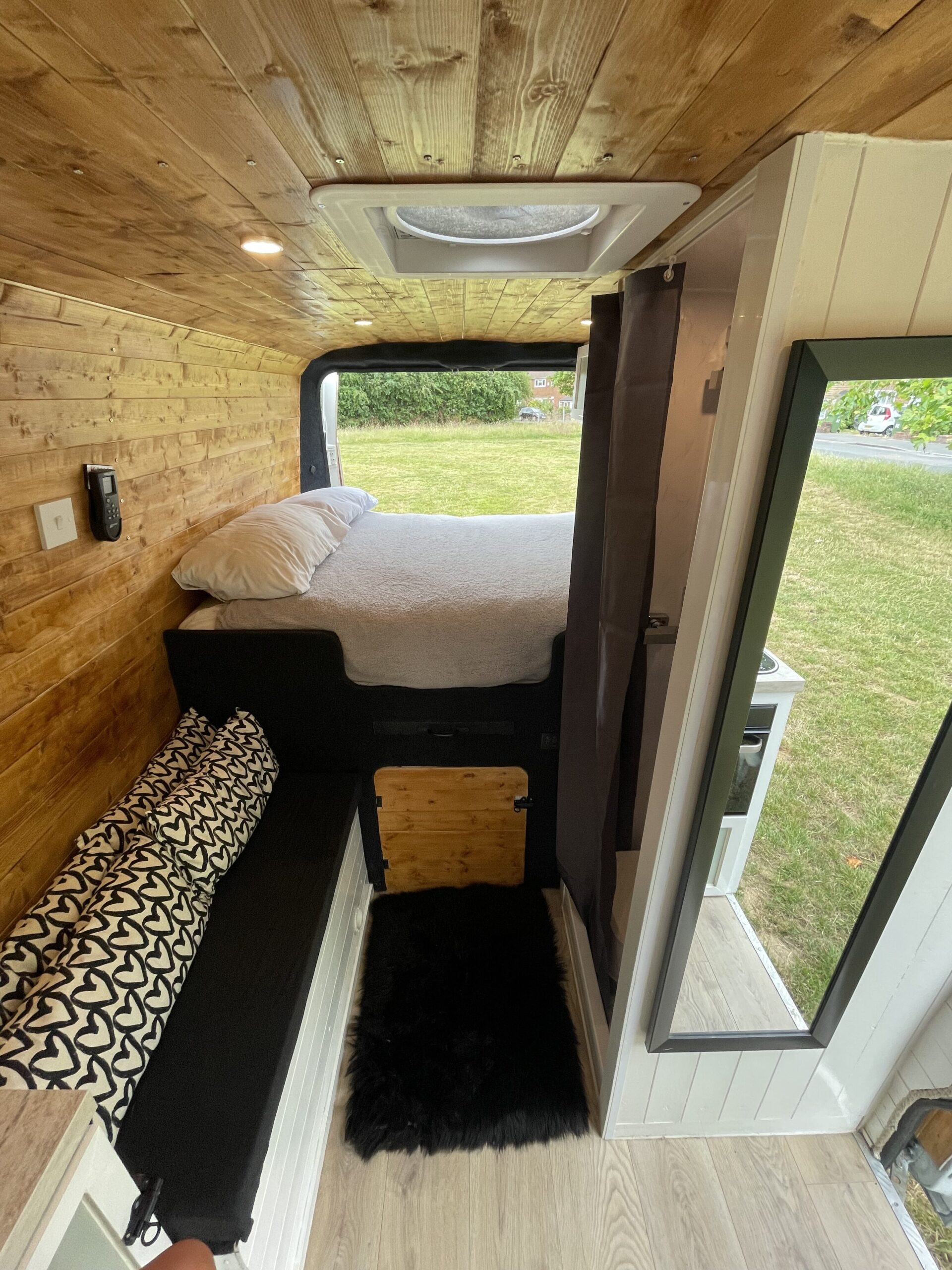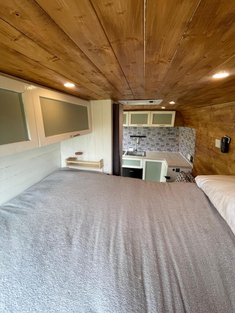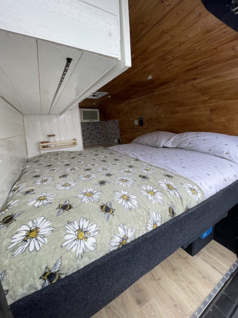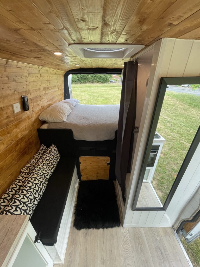 This van has a fixed standard double size bed (135 x 190cm) There’s a door that opens up into the garage space, this can be opened in the event you have a dog travelling with you too!