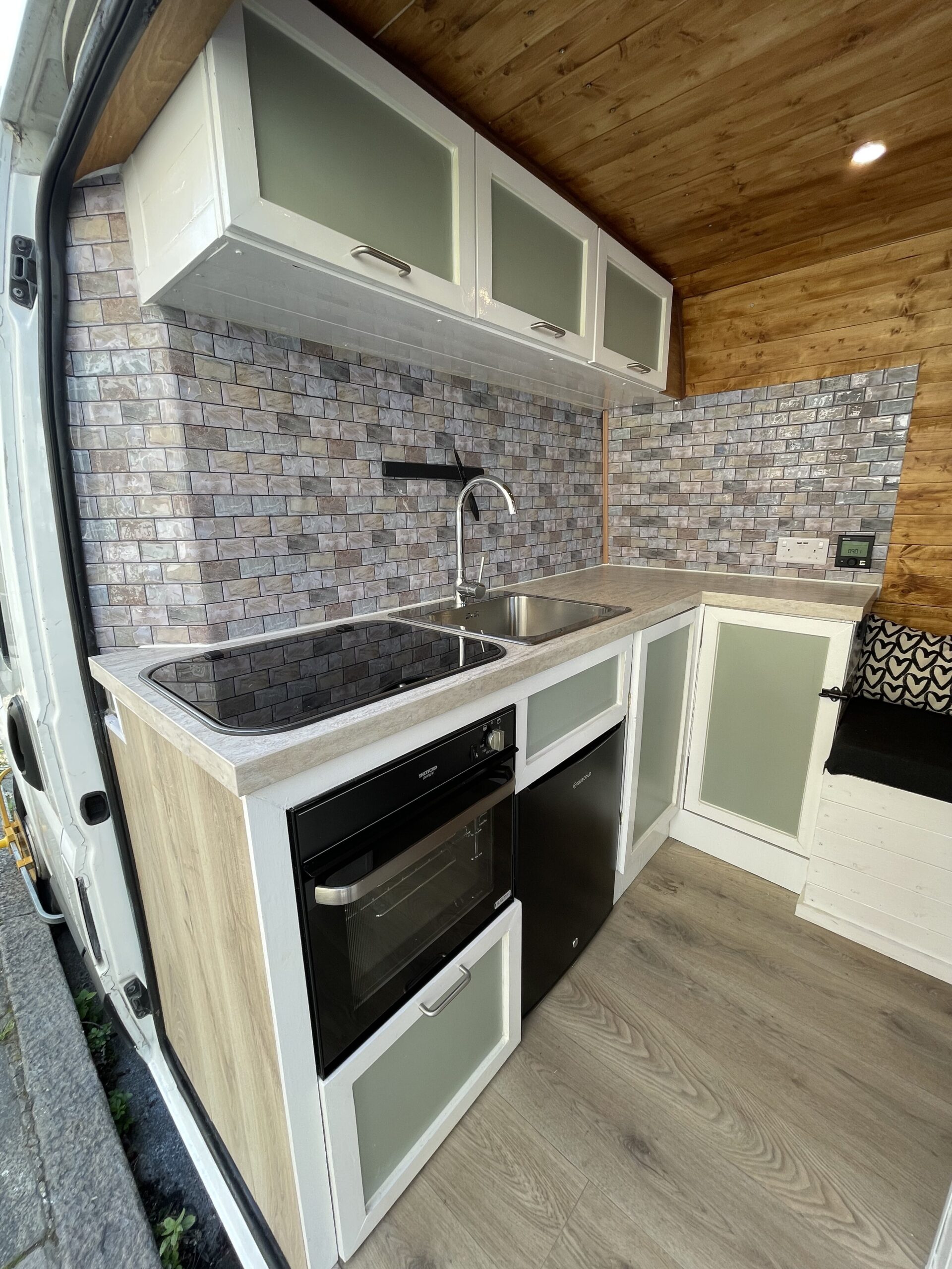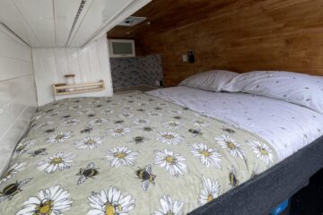 The Solar Panels and the Vans alternator charge the leisure batteries. The solar panels alone are great and keep the batteries constantly charged – even with the fridge constantly on, 24 hrs a day, along with the 240v plug sockets charging our phones and laptop. We were away for weeks without having to worry about what we were using. We had the gas hob running for teas/coffees, lunches/dinner. We had a hot water shower. We found a number of places with fresh water taps allowing us to refill for free. The heater only takes a few minutes to heat up the space! It’s the perfect off grid van, for holidays or to live in.