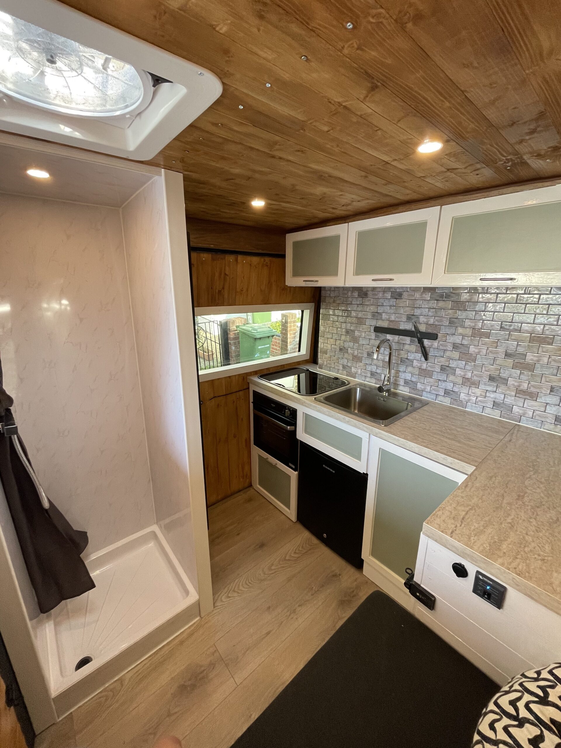 240v fridge is run off the inverter, I had the fridge running for 24hrs a day for 2 weeks and the batteries remained on 90%. She is fitted with a LPG Thetford 3 burner hob and a Thetford oven & grill that’s run off of the gas. She has hot water, and heating, along with an indoor shower. The heating can be set to a desired temperature, and it will keep the van at that temperature – which works wonders during the night, so you can wake up to a toasty van. The maxxair fan works wonders, its fitted in the middle of the van, just above the kitchen area and just next to the shower so is perfect for getting rid of smells and condensation. It’s also a great source of aircon – all you need to do is press a button to turn the fan the opposite way to push air into the van.