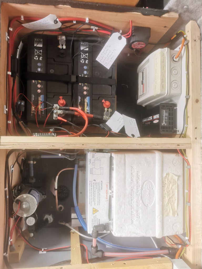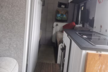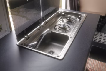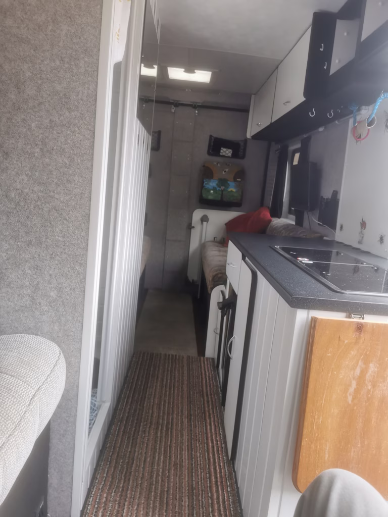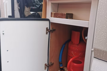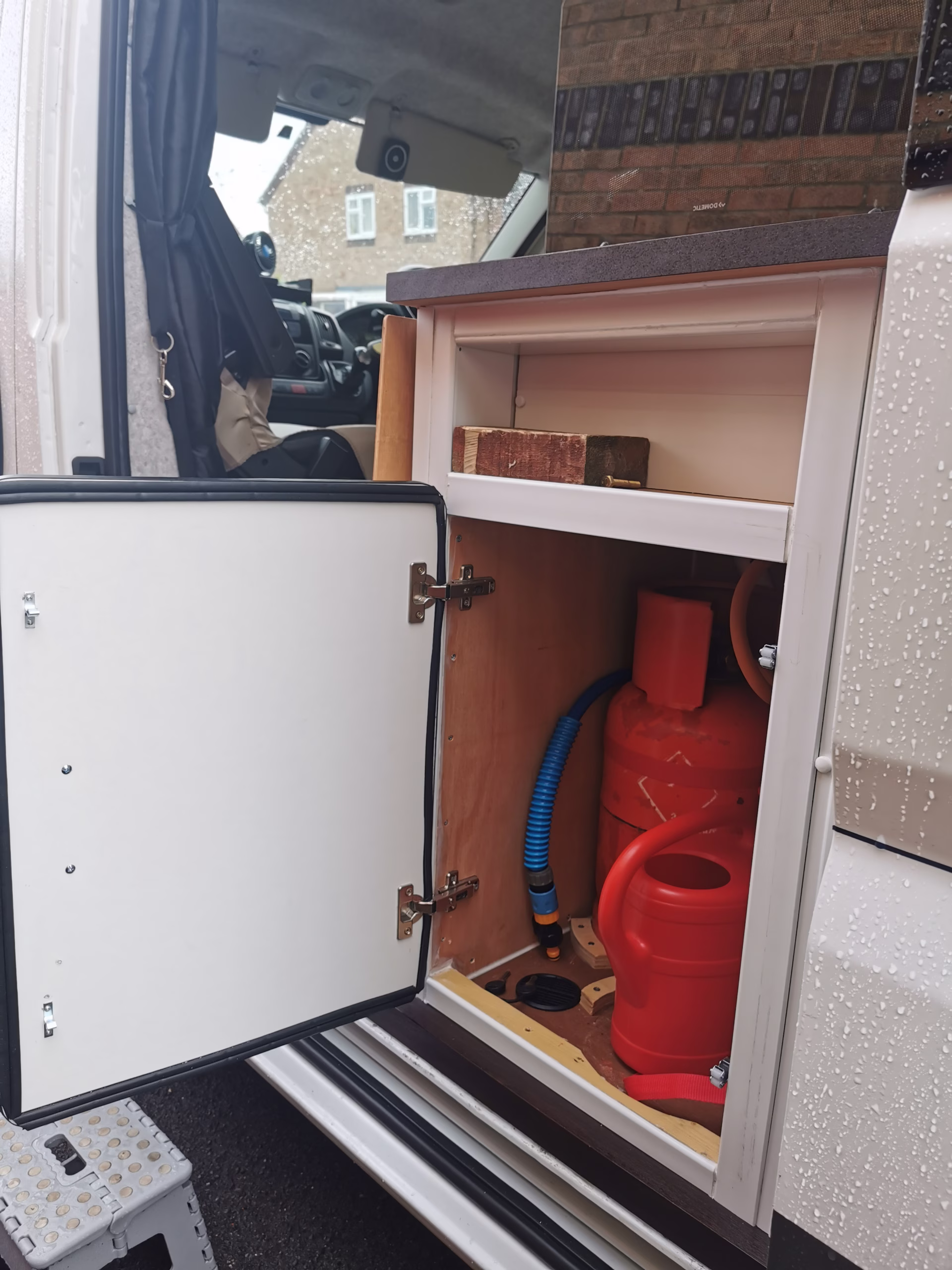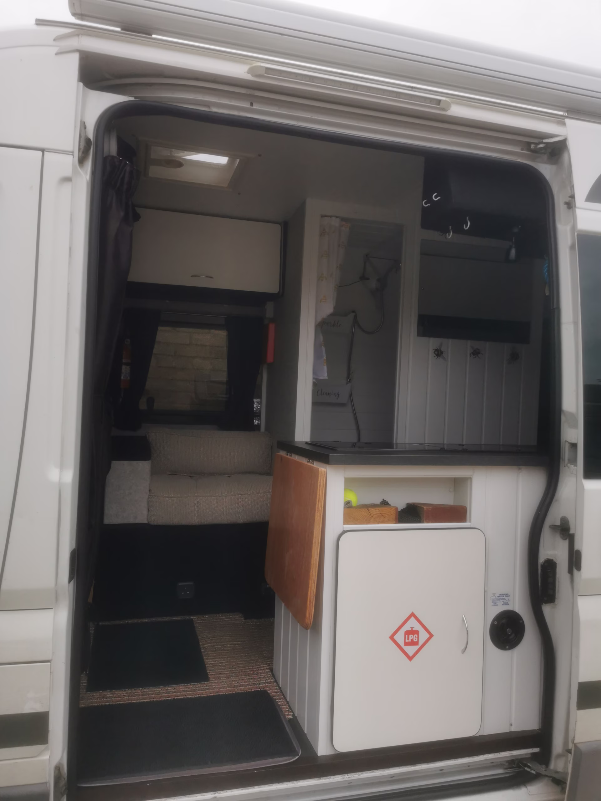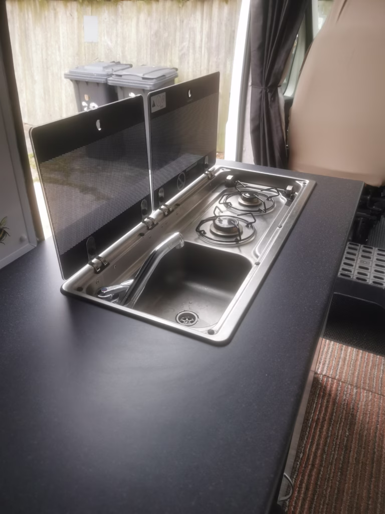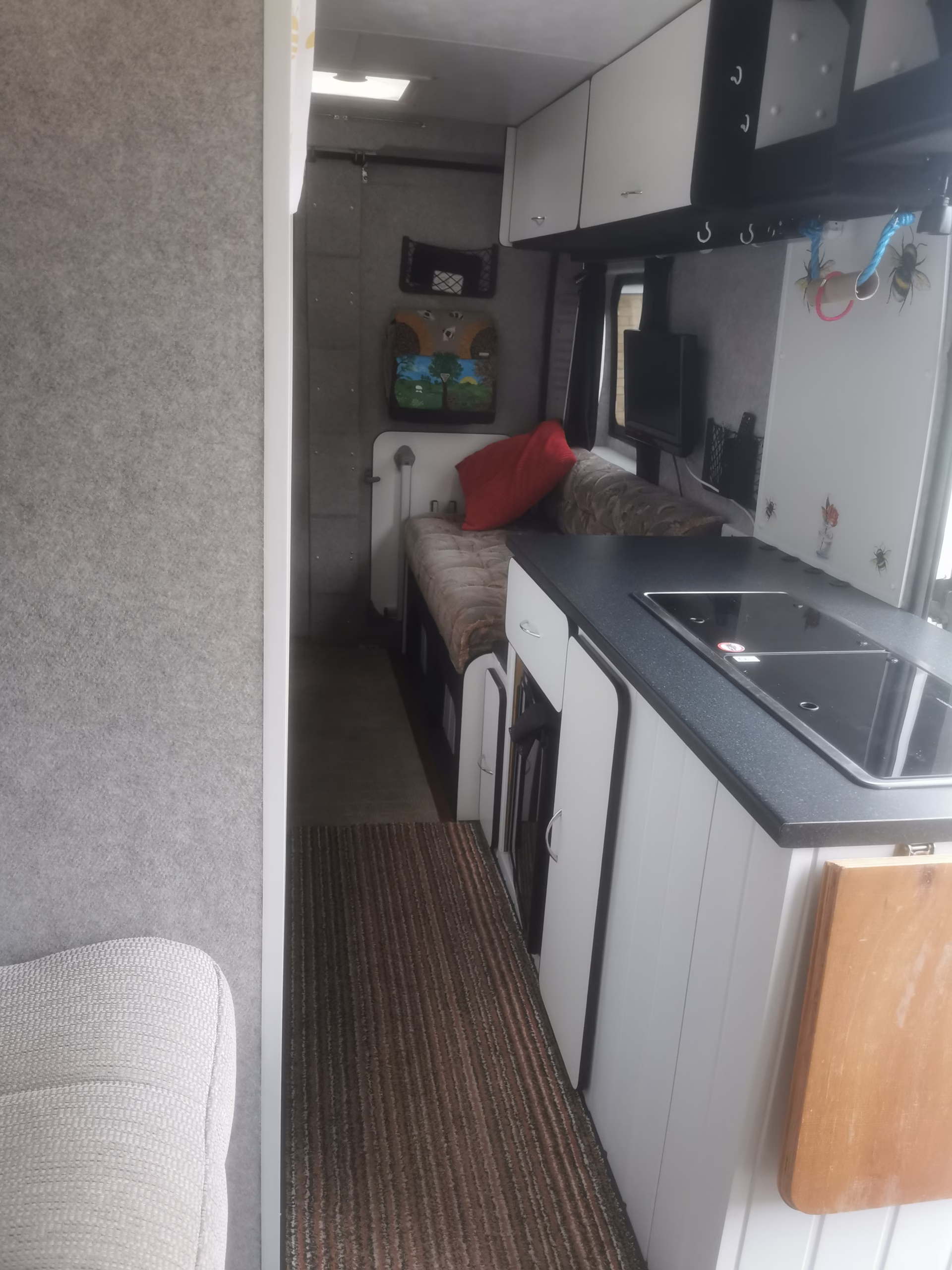 • Kitchenette sink alongside 2 burner gas hob runs from 2x 6 kg Butane bottle housed in secured cupboard from side door