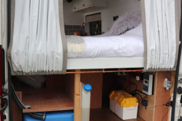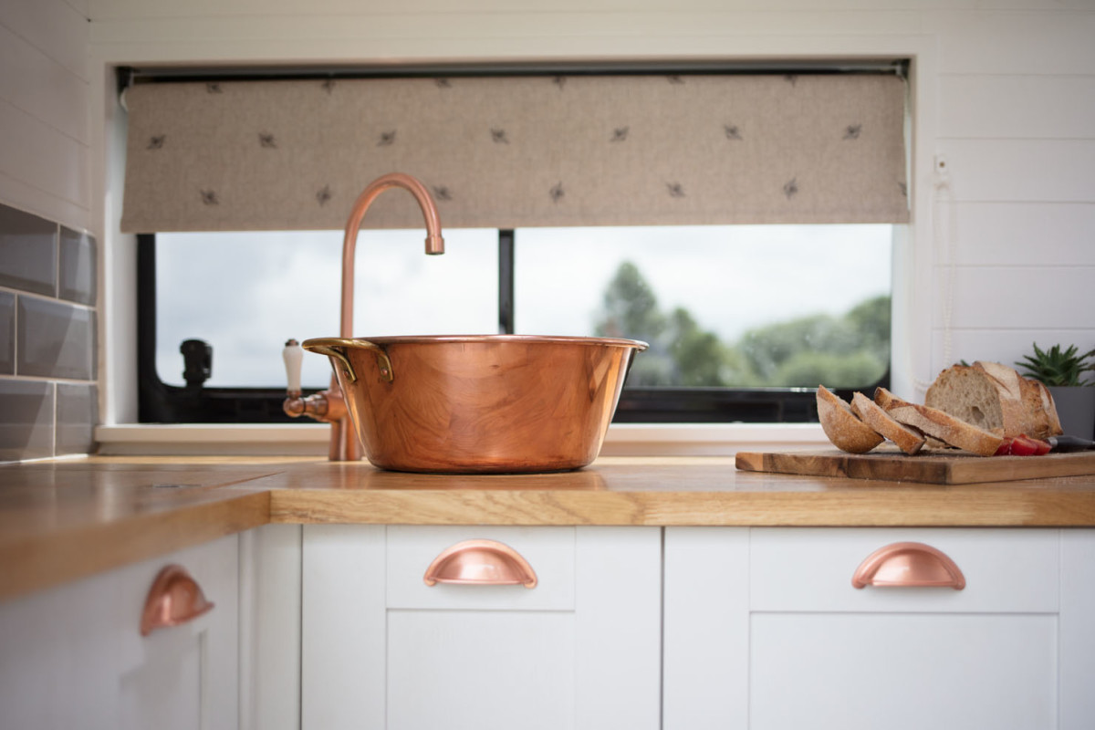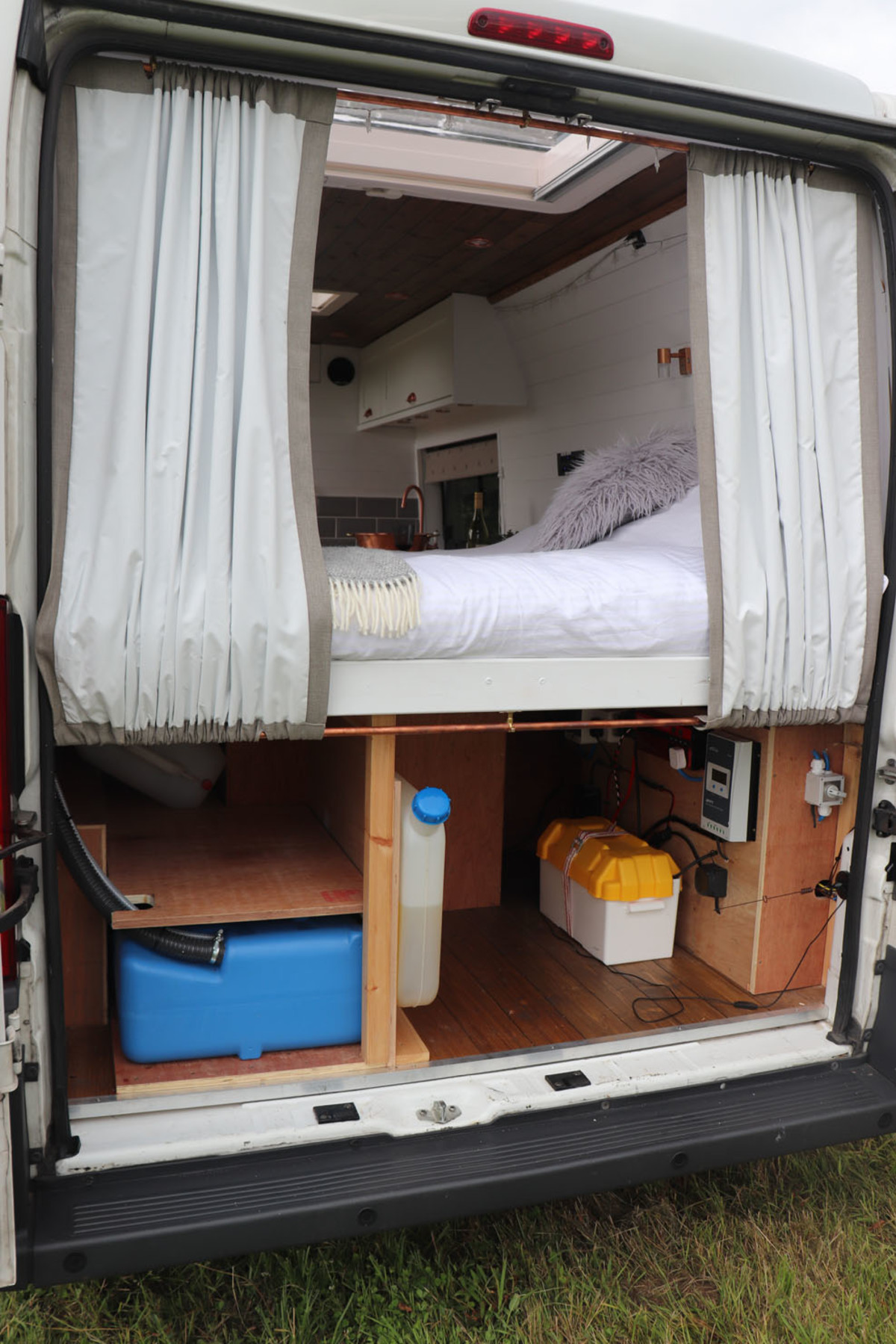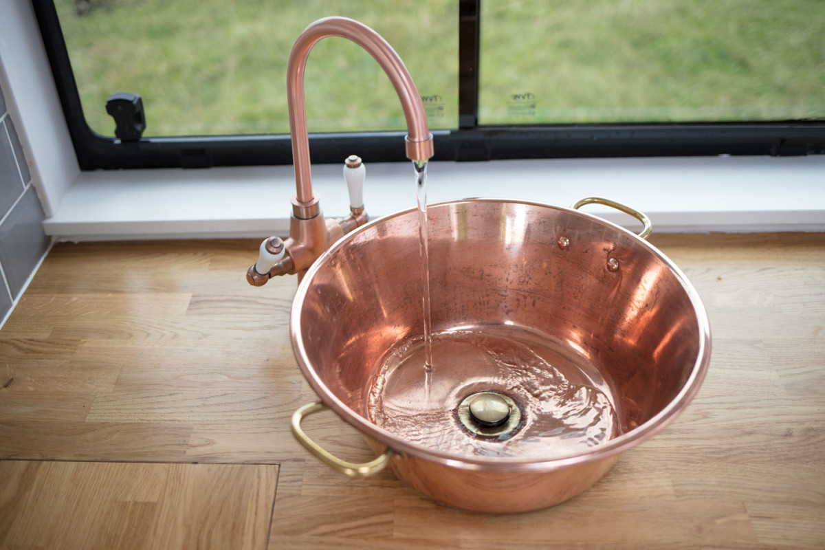 Cooper is a beautiful high spec professional conversion done by the talented Studley Campers. Fully set up for offgrid adventures with solar power this van is well loved and set out. A calming interior space with white, copper and grey with lots of mod cons like top loading fridge, radio, diesel heater, hot water shower, a stunning feature sink and hot water pump which works on gas or electricity. You can charge your lap top via the inverter when you are on the go, use full electricity at camp sites or go off grid adventuring and not lose out on any home comforts. Lots of storage space for kit in the boot and within the van alongside a clever space for your dog to come adventuring too. I have loved adventuring in all seasons in Cooper, cosy with the heater even in winter months.