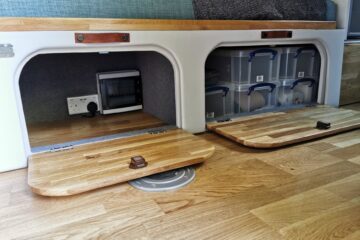 – Cooker/sink unit fitted with accessible, certified gas box (includes gas bottle); 20L water bottle with water pump and tap switch on sink installed; 10L waste water bottle for drainage; dual gas burner hobs with glass covering that acts as a splash back; and a small cutlery drawer under hobs (removed to access isolation switch)