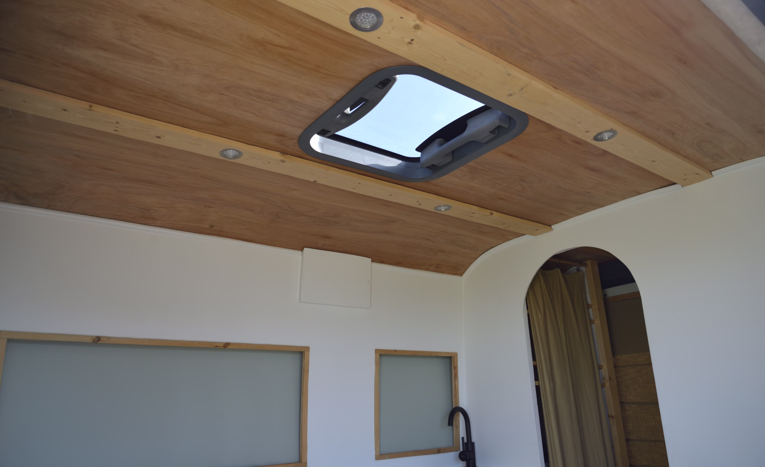 An opening skylight provides lots of natural light and ventilation when it’s too cold/wet to have the doors open!
