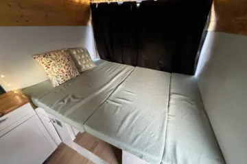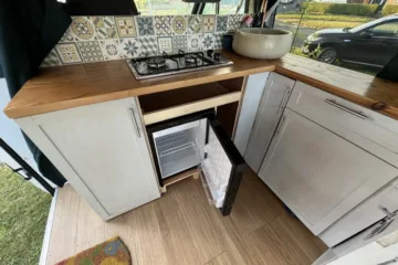 Simple and elegant conversion that is easy to maintain. Unique kitchen tiles and Scandinavian sink design. Simple water pump system that makes washing up easy. Spacious living quarters with hand crafted bespoke sofa cushions and easy convertible double bed. Smart wood panelling with LED overhead lights and fairy lights. Brand new fridge-freezer and rear windows professionally installed. Light and airy, even when the doors are closed. Leisure battery and electrical wiring easily accessible under seat.
