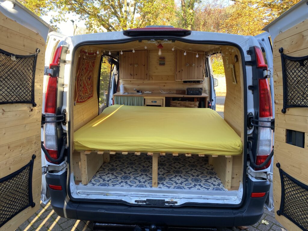 The bed is big enough to lounge on during the day without needing to put away the bedding every morning. It pulls out another couple of feet for sleeping and comfortably sleeps one (and a dog) even if you’re tall as you can sleep diagonally. I’ve also travelled with a friend for a couple of weeks and it was comfortable but maybe not for two if you’re much taller than me (5’9). The mattress is made from 4 Ikea children’s modular mattress pieces that fit together to make a short but wide double (160 x 170cm).