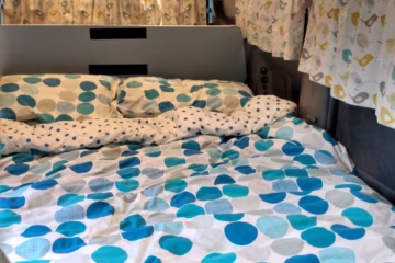 Rear area converts into a small double bed – memory foam mattress parts with removable covers for easy washing (add measurements)