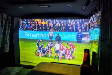 Projector screen at front of the vehicle – can watch via memory stick or stream internet