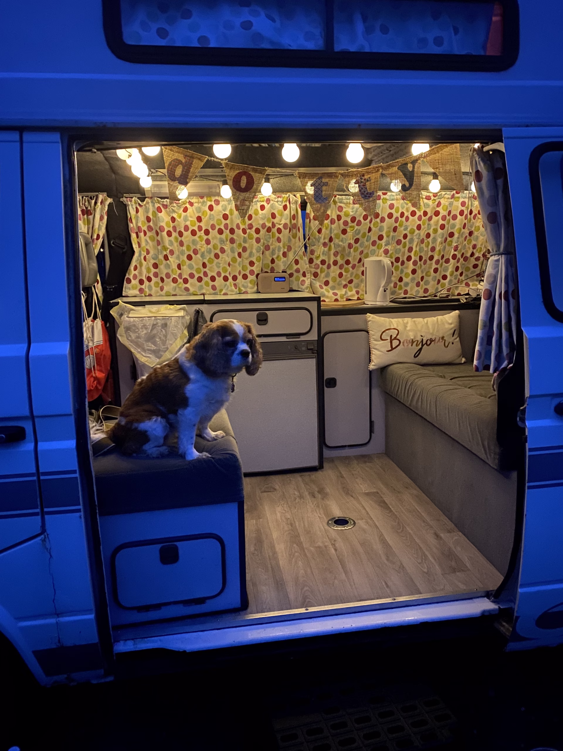 Dotty, solid little van. Owned by me for 4 years. Regularly used. MOT and serviced annually. Tidy and dry/ clean inside. Sleeps 4. Rock and roll bed and bunk bed above. Running cold water, 3 way fridge, 2 gas hob. Passenger front seat turns round. Portable table. Plenty of storage.