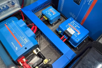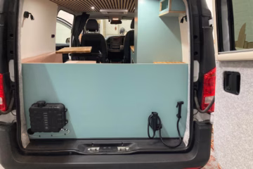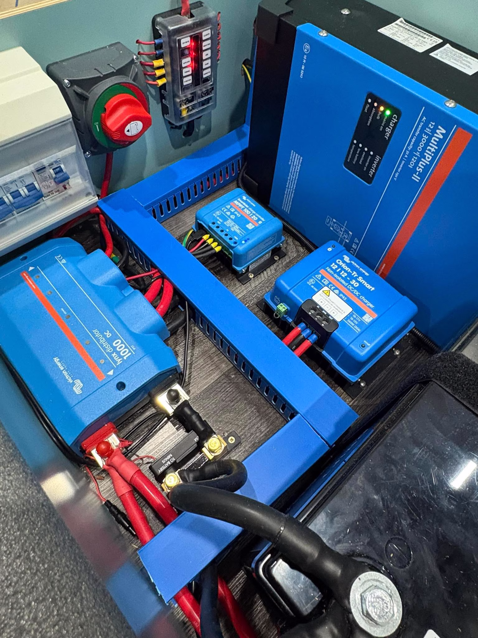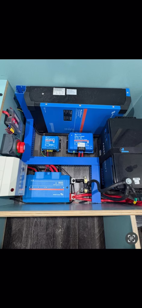 Electric system includes 240V hook up, protected with consumer unit. A 300ah Fogstar, lithium battery provides 12v power. 3000 watt inverter provides power 240v outlets from the 12v system. The dc-dc 30a charger charges the leisure battery when on the move. There are various electrial sockets and USB charger points available. Dimmable spotlights and reading lights.