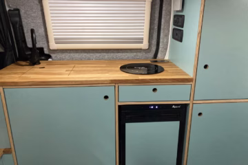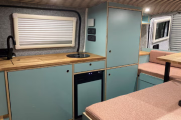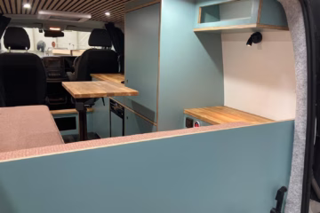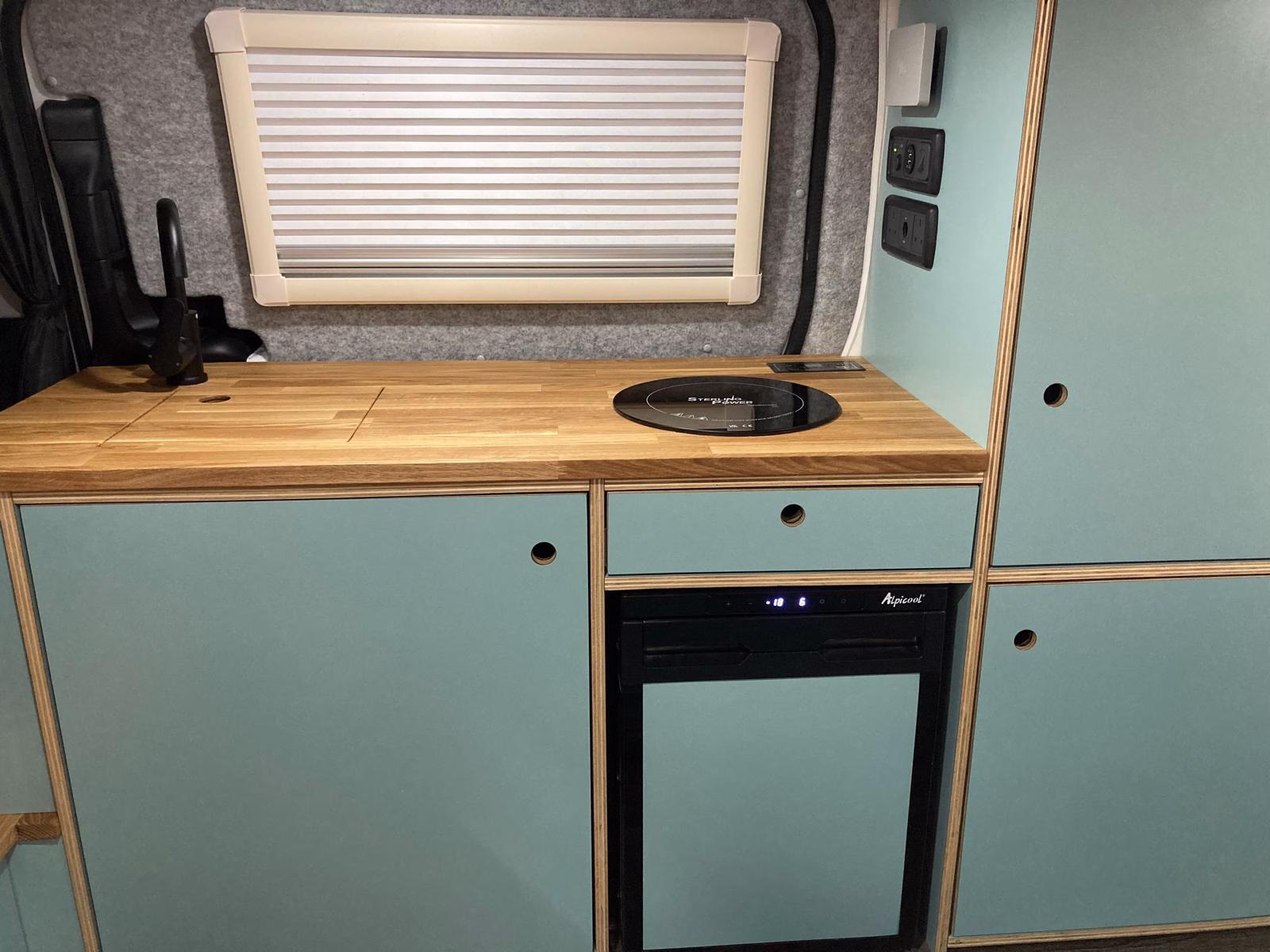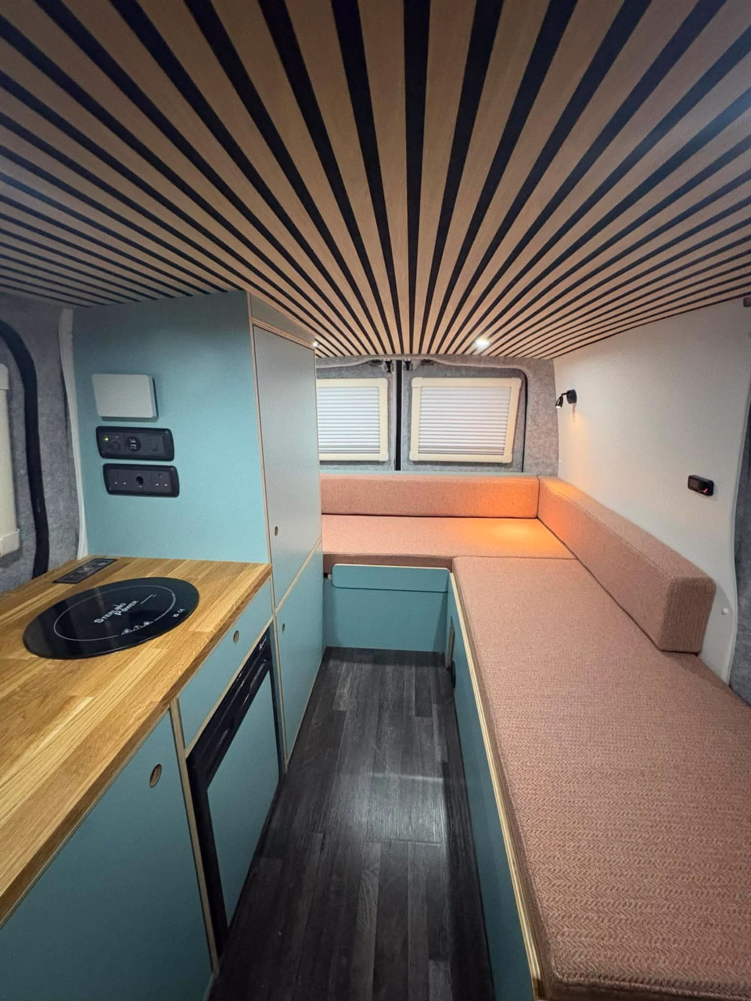 Professionally converted by Northstar Campers in 2025. Fully insulated, with a remote controlled Maxx Air fan and 215 Watt solar panel on the roof. Both sliding side doors fitted with opening windows. Windows have also been fitted to rear barn doors. Bespoke unit houses sink and 1000W induction hob. Cupboard under sink holds grey water tank. 50L fridge/freezer situated under the induction hob. Large full height shelved storage unit comes next. L-shaped seating area, provides further underseat storage. Composting toilet stored under seating, with easy access.