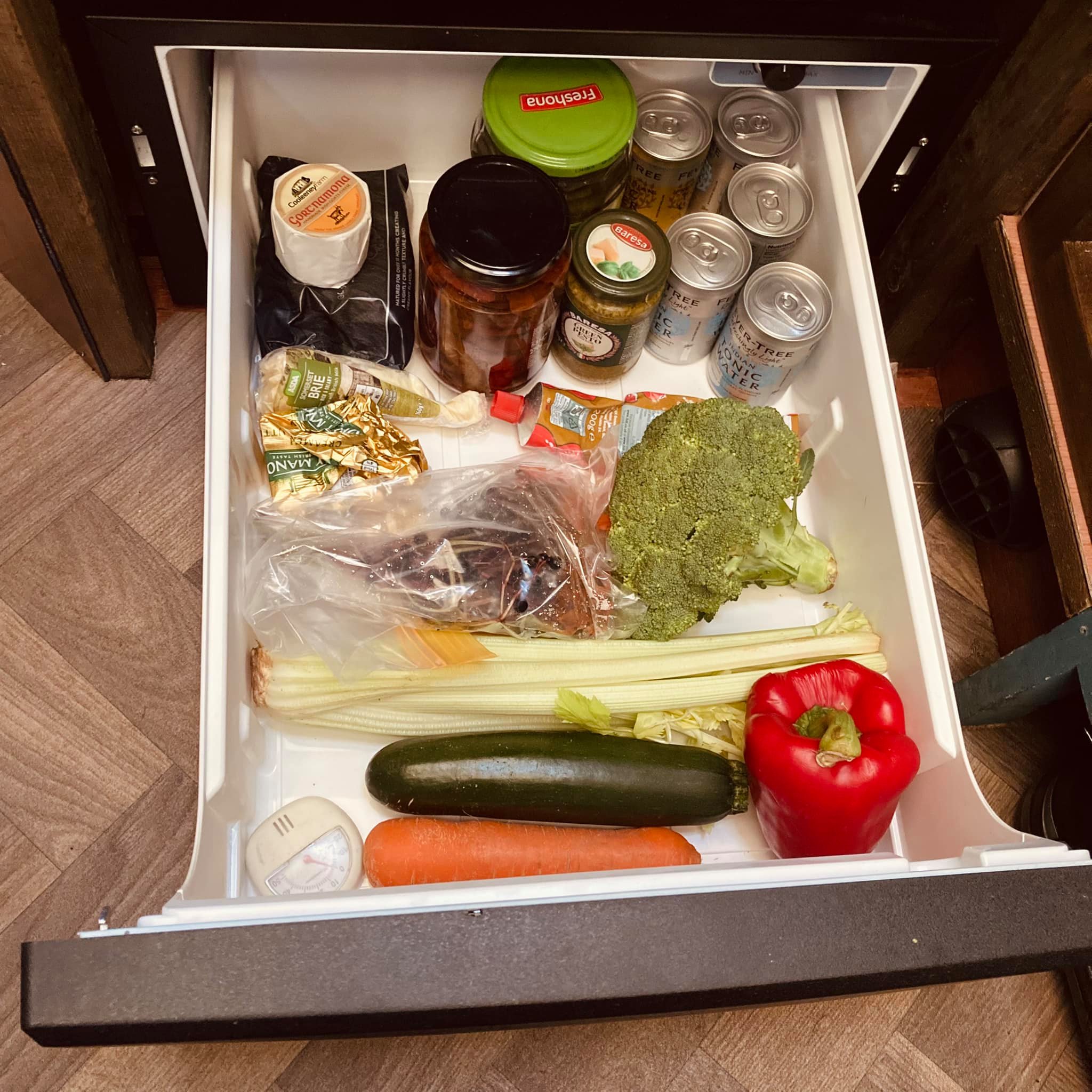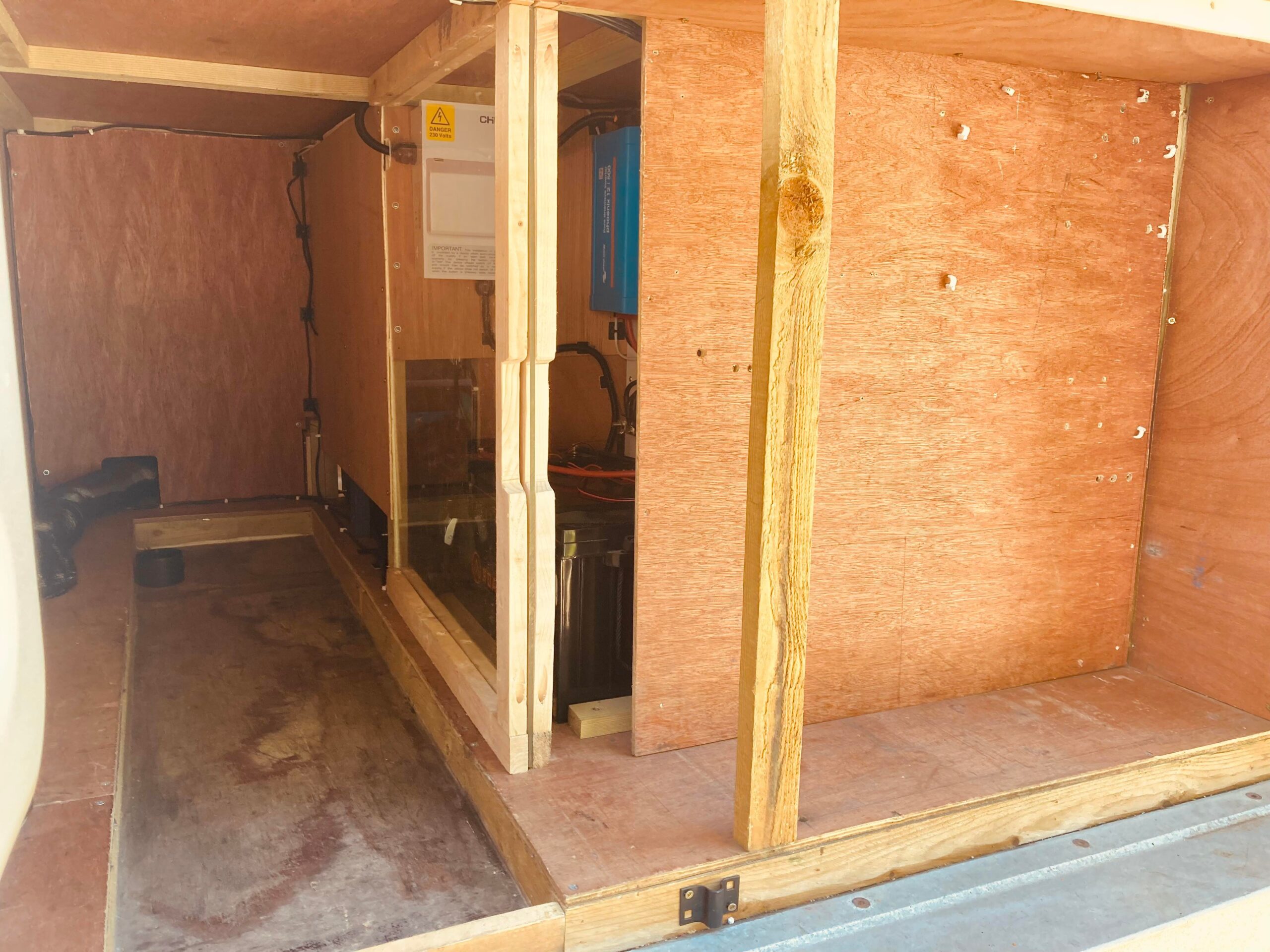 10L fresh and 10L grey water storage underneath. Extra 10L bottles can be stored. We decided against fitting water tanks as found our fill up spots weren’t suitable for filling a large tank. Plenty of space to add these if needed