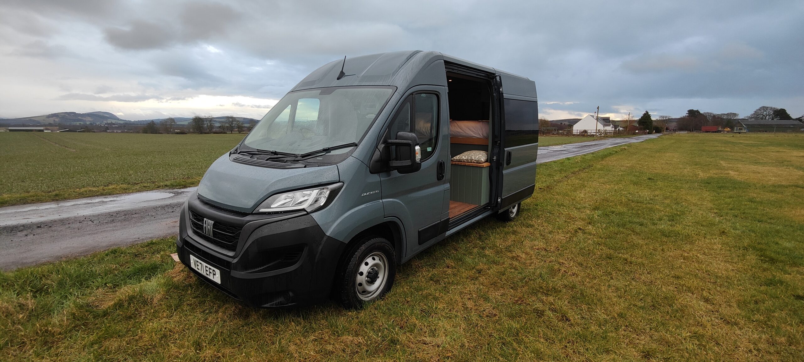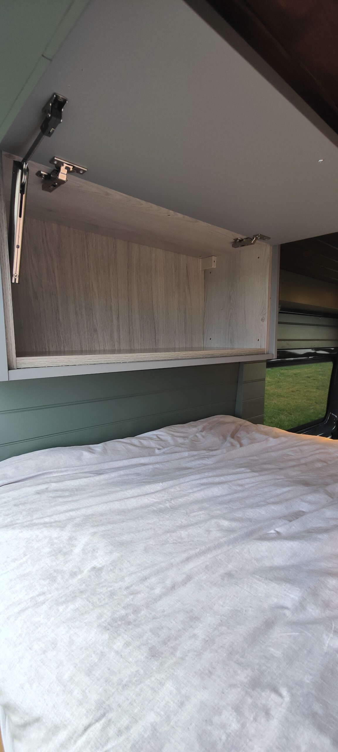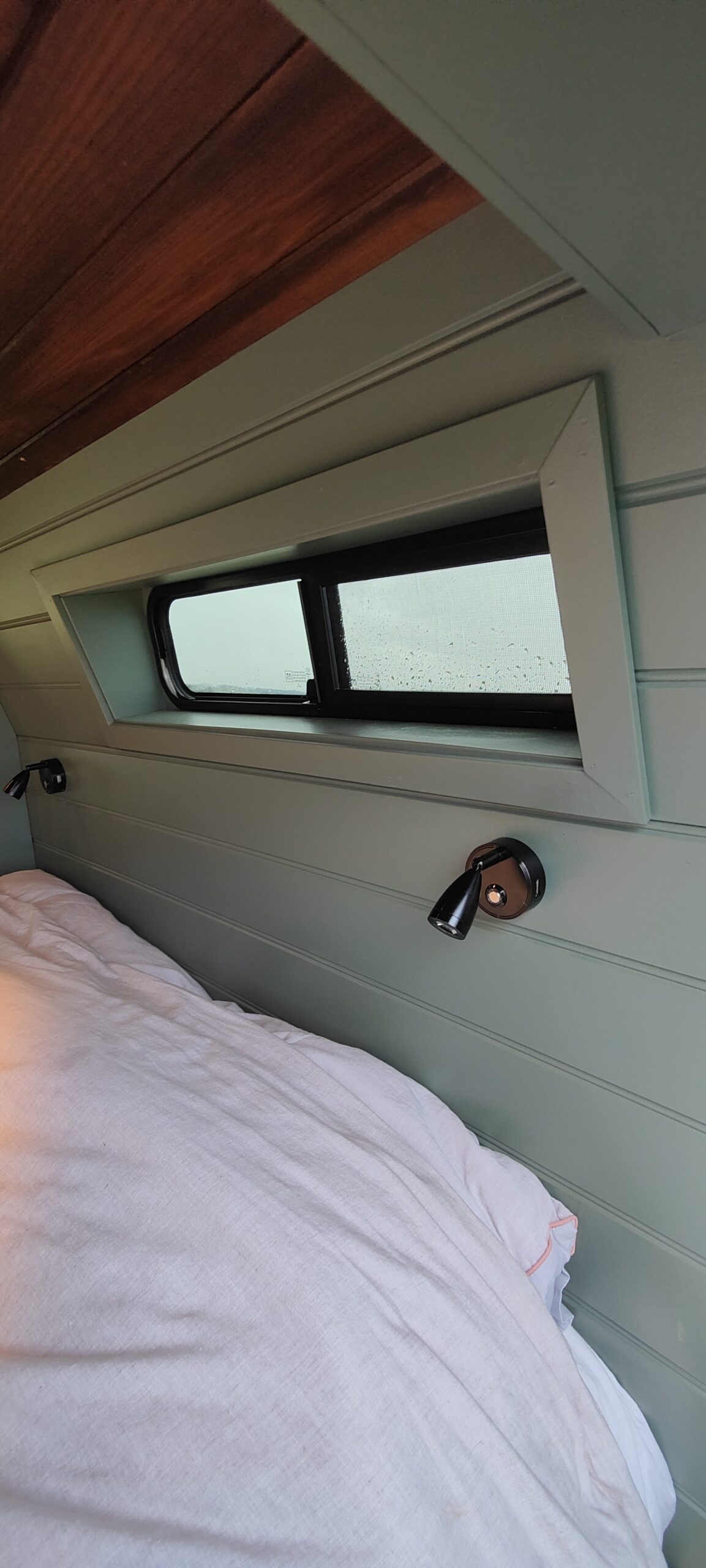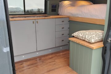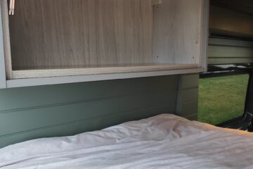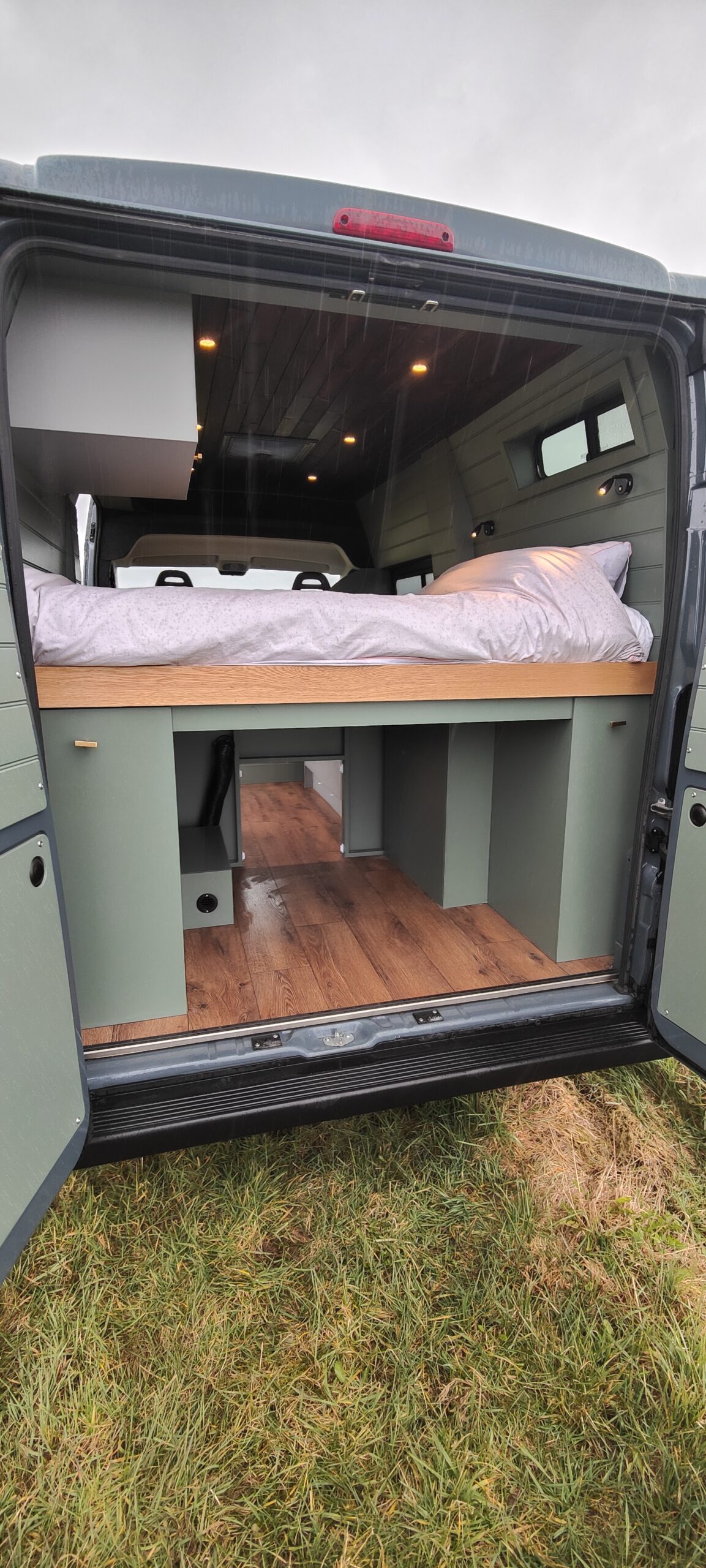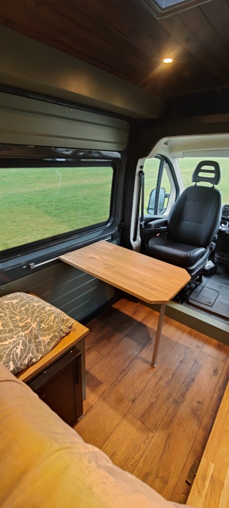 We styled the van to feel really homely with Farrow and ball ‘Green Smoke’ walls and a dark walnut stain on the ceiling.
