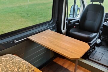 • 2 person table that folds up and clips onto a rail on the sliding door of he van