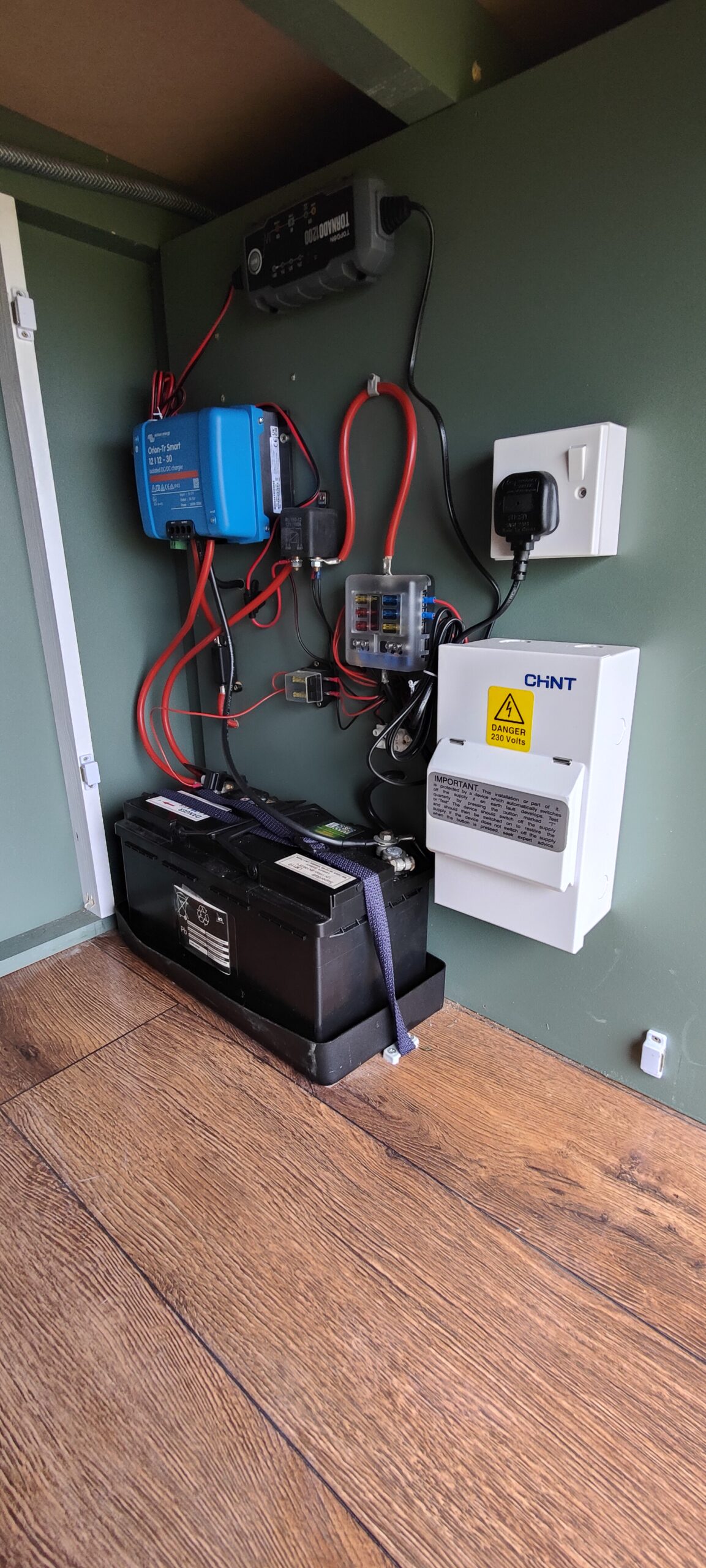 The battery can be charged from either the split charge system that includes a heavy duty smart relay or will charge from the battery charger when on mains hookup. There is an LED display voltmeter so you can keep a close eye on your power consumption and never have to worry whether you are running low on charge or not. There is also a switch panel which controls power to the fridge and water pump. Everything has been individually fused for ease of maintenance.