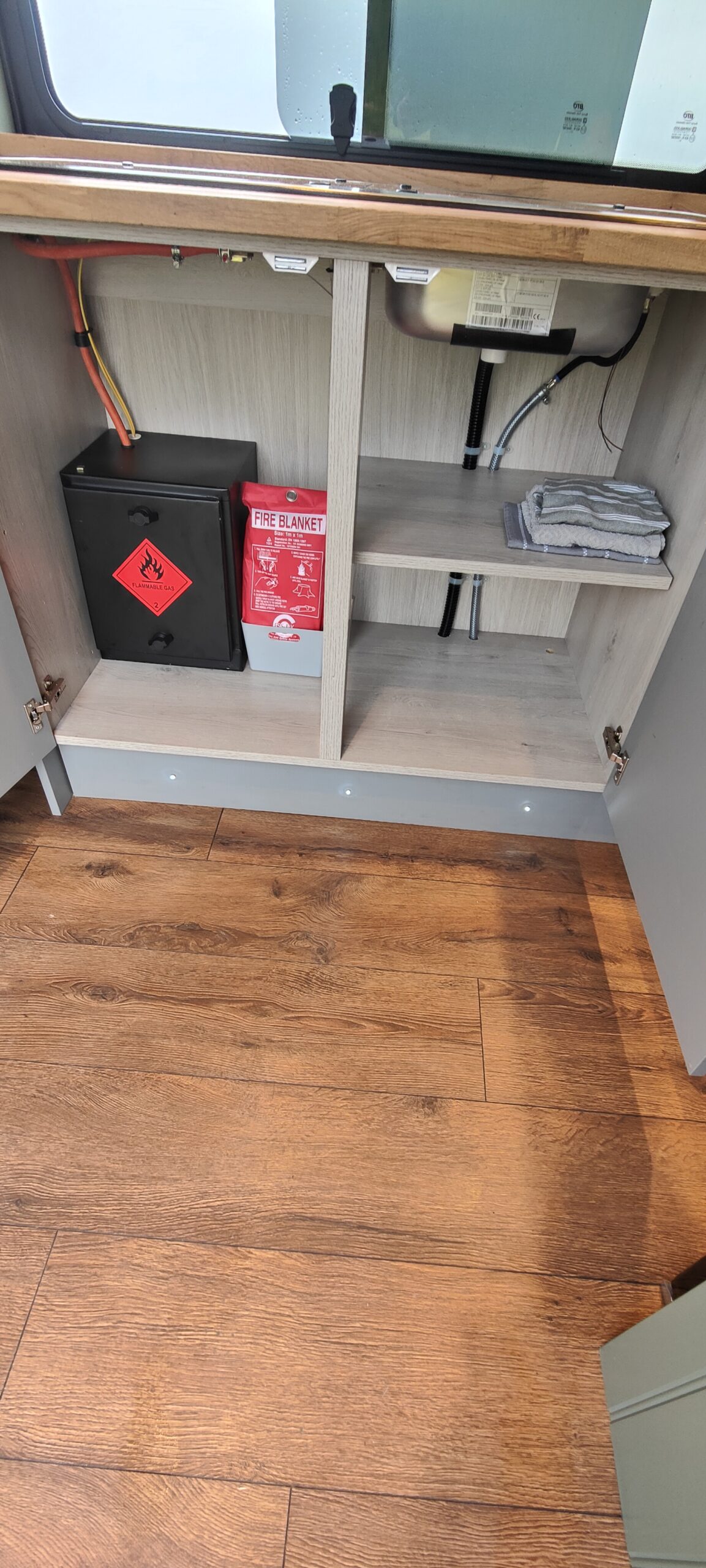 • Black metal gas box – vented outside the van
