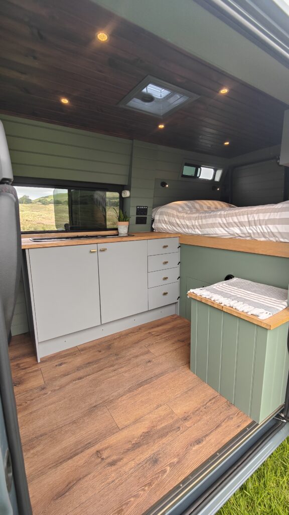 Second, 25 mm Kingspan insulation board is fitted to the walls and ceilings and any gaps, we then silver foil tape around the sheets and any gaps to sure you van is warming toasty. Before the final layer we leave a moisture barrier gap so there is no moisture transfer.