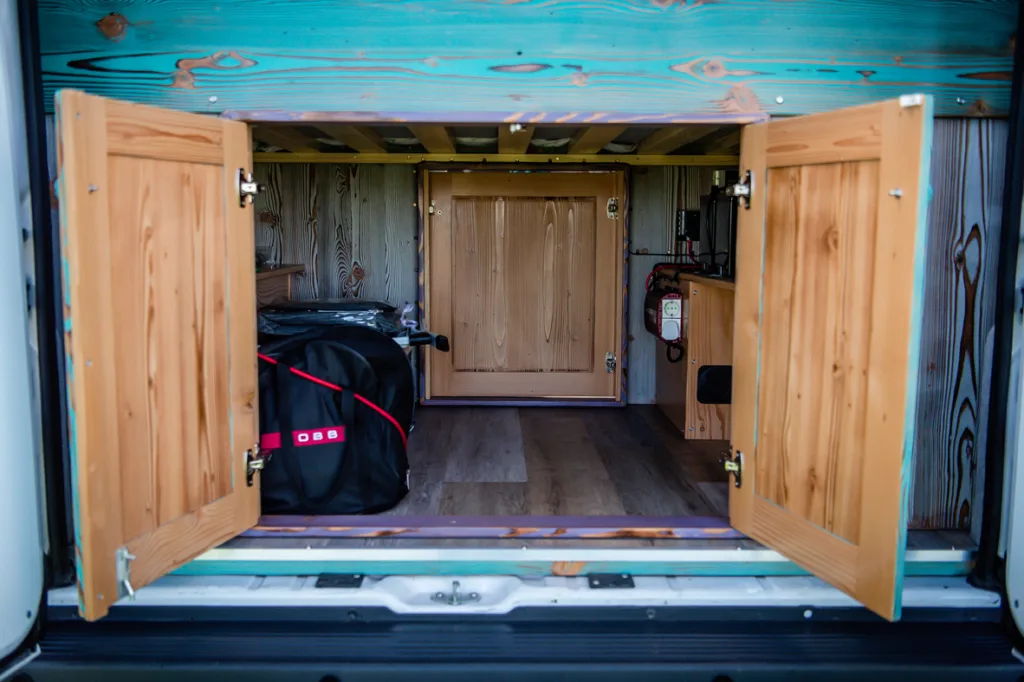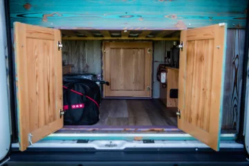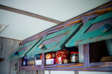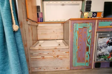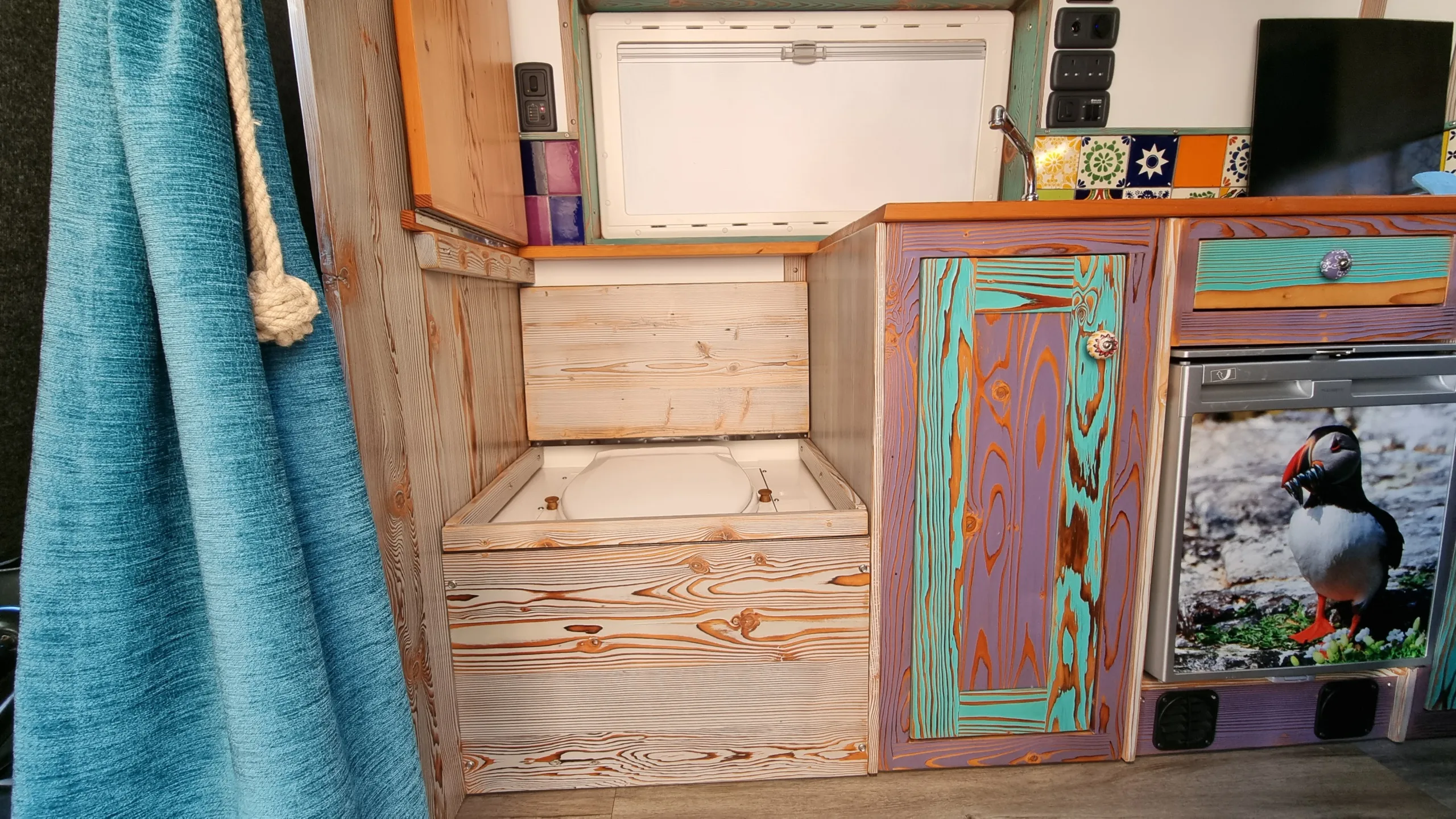 We had our camper converted by an original Quirky Campers approved installer…Off Grid campers at Ramsey near Huntingdon. [Although no longer trading Off Grid Campers continues to have a Facebook page to view]. The wood used for our conversion was recycled Pine using the Shou Sugi Ban method to preserve the wood. It is painted in Purple and Teal.