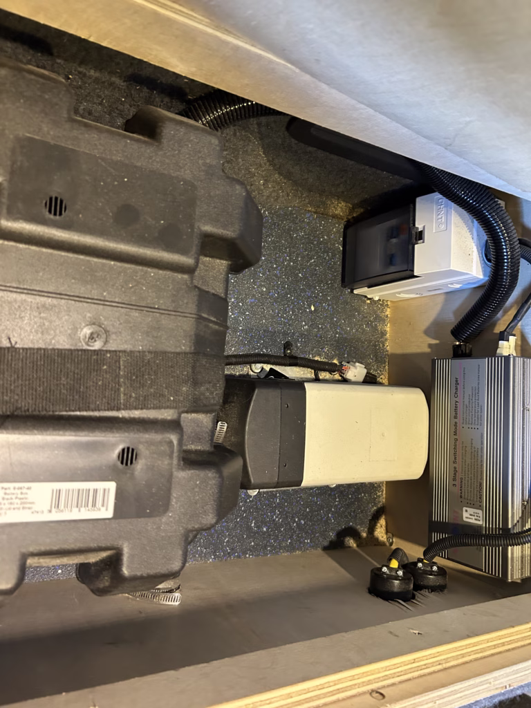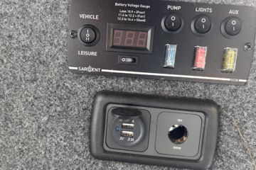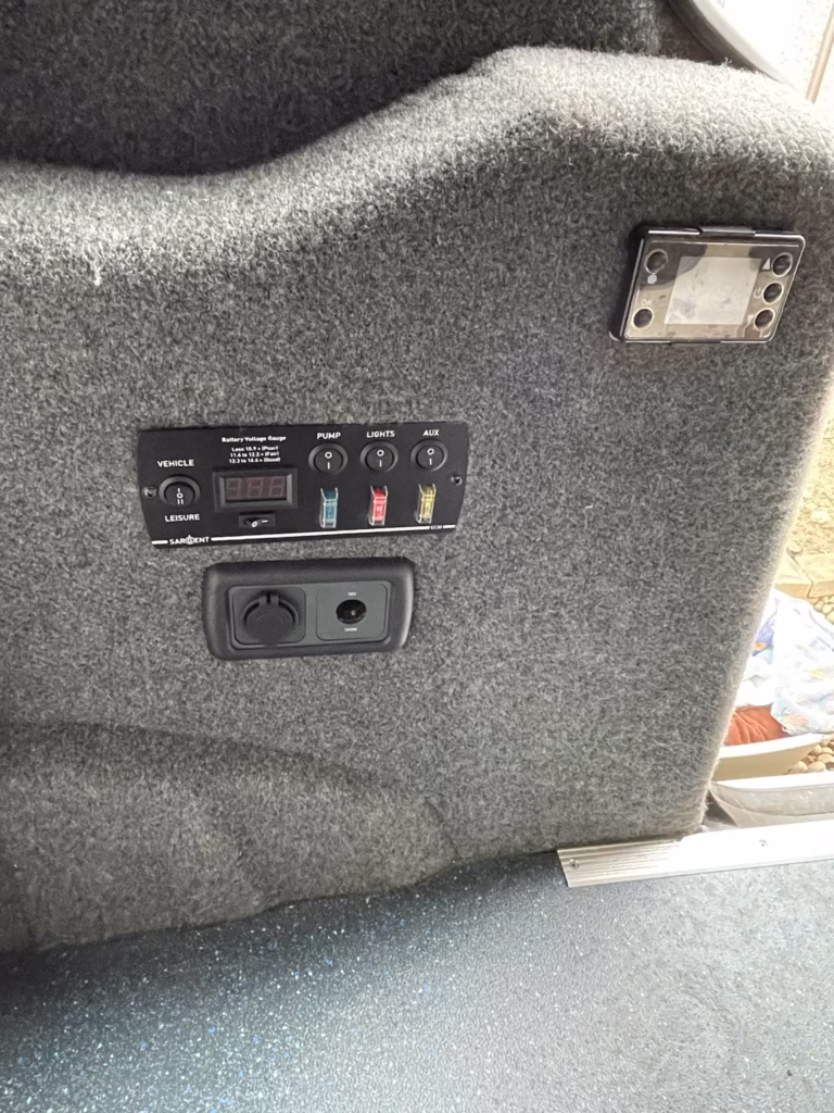 Inside it is fitted with a leisure battery, hook up, lights, 240 socket, usb sockets, sink with water pump, a gas ring and diesel heater. There is also a fire extinguisher, cooler and iPad holder included. A bespoke unit as built with a hinged table to house the sink and gas ring.