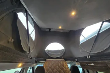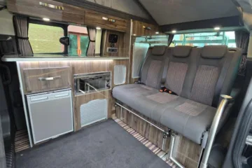 Terrier 1 side conversion, driver and passenger swivel seats with fly off handbrake, German SCA elevating roof, Reimo sliding seat system with 3 x rear seatbelts, glass top hob & sink, fresh & wastewater tanks, electric water pump, mains hook up, leisure battery, solar panel, compressor fridge, porty potty, Eberspacher 2KW blown air heating.