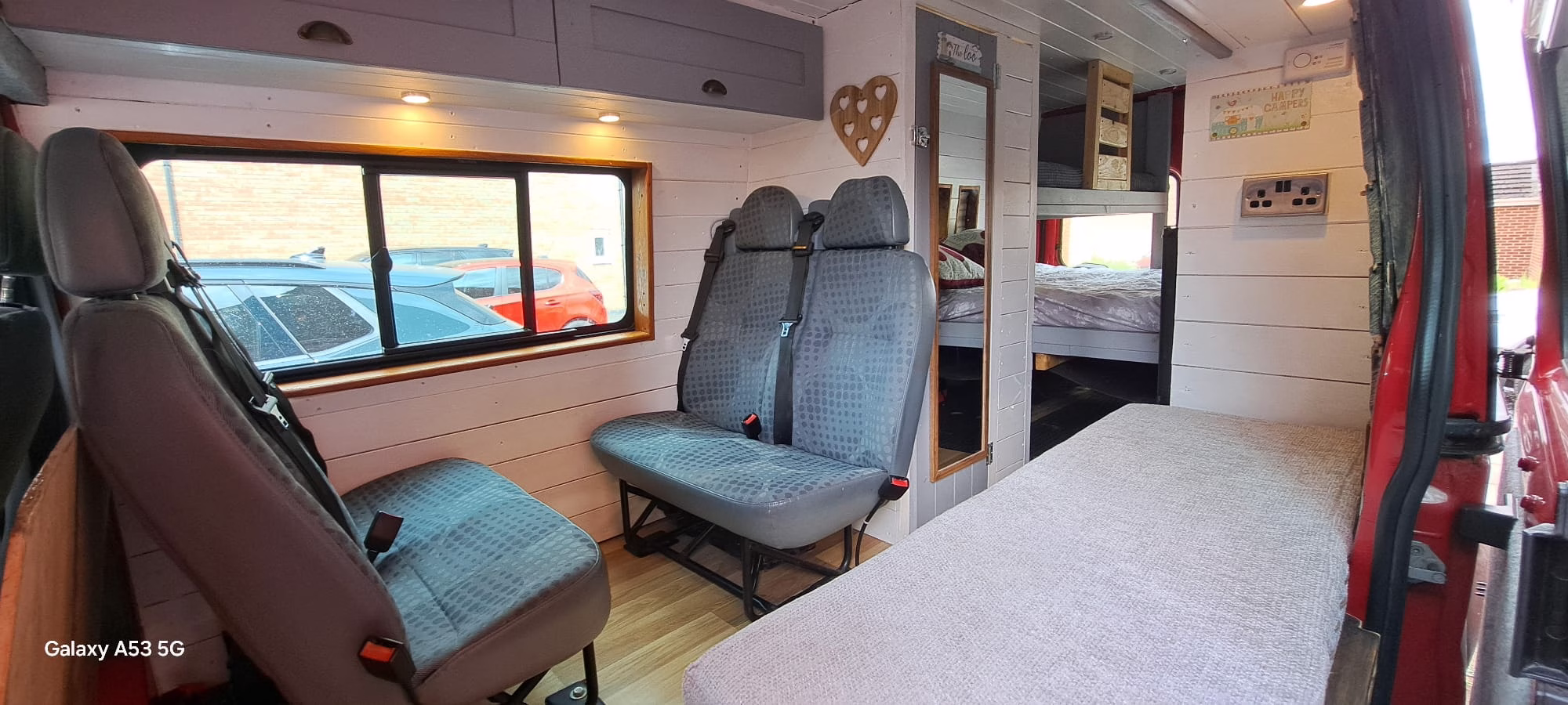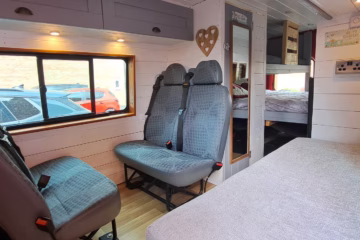 Here we have for sale our much loved campervan, engine and bodywork in excellent condition. 5 Berth, fixed double bed to rear, above is a single bunk bed. Front dining area seating converts to bed, sky light to roof. Loads of storage cupboards and additional storage above cab. Toilet room with thetford toilet. Smad 2 way fridge. Fully insulated. Solar panels for off grid living. Inverter and two leisure batteries with a sterling dc to dc charger. 240 hook up. Diesel heater. Swivelling passenger seat. Awning rail. Led lighting throughout which is dimmable. Made to measure window blinds which are thermal. Bench seat with plenty of storage for cooking equipment and water storage. Excellent campervan which has never let us down, very sadly for sale as we as a family have outgrown it.