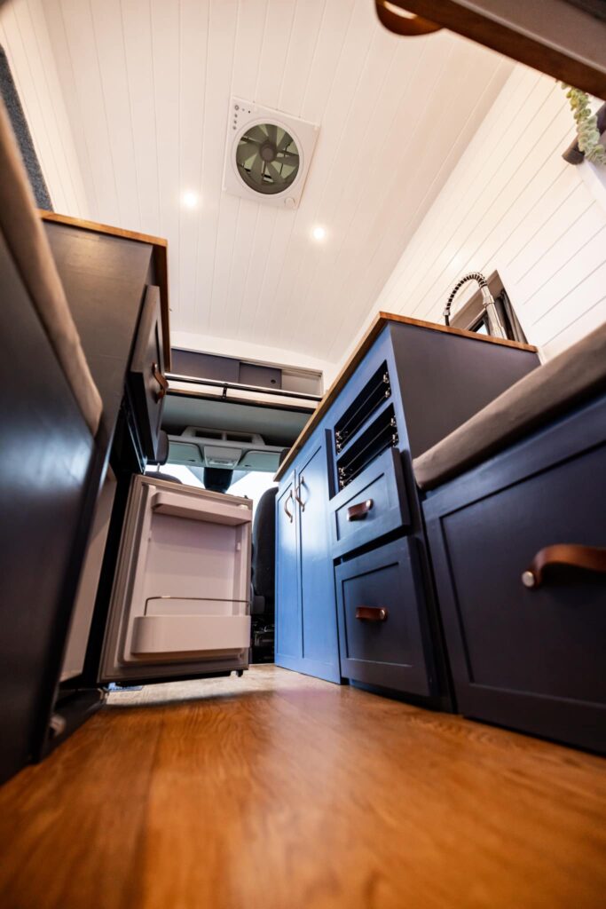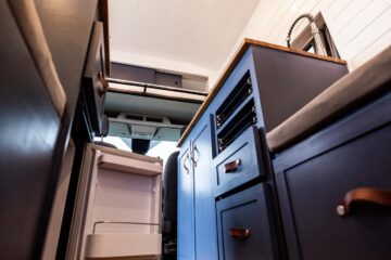– Alpicool CR50X Campervan 12v Compressor Fridge with digital controls and display, freezer compartment, battery protection, quiet, van be run off 150w solar panel on overcast day, bi-directional opening door.