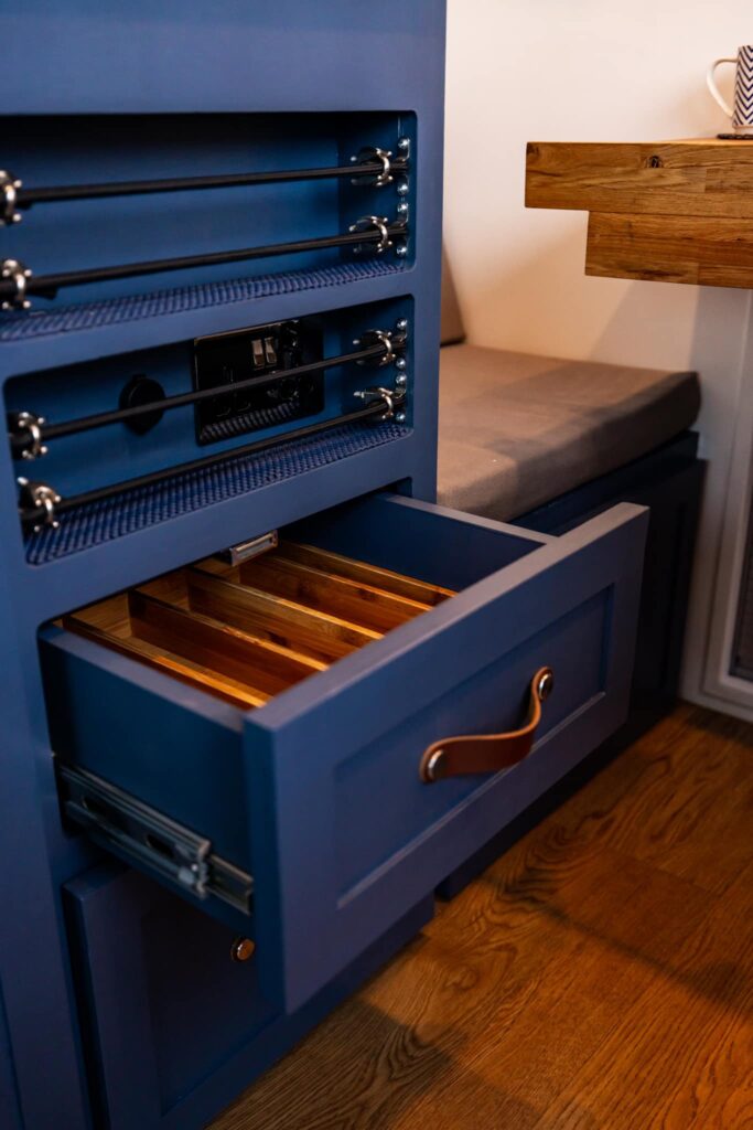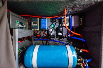 – Separate 12v Leisure battery and solar power, and 240v ac electrical systems and circuits with various RCBs