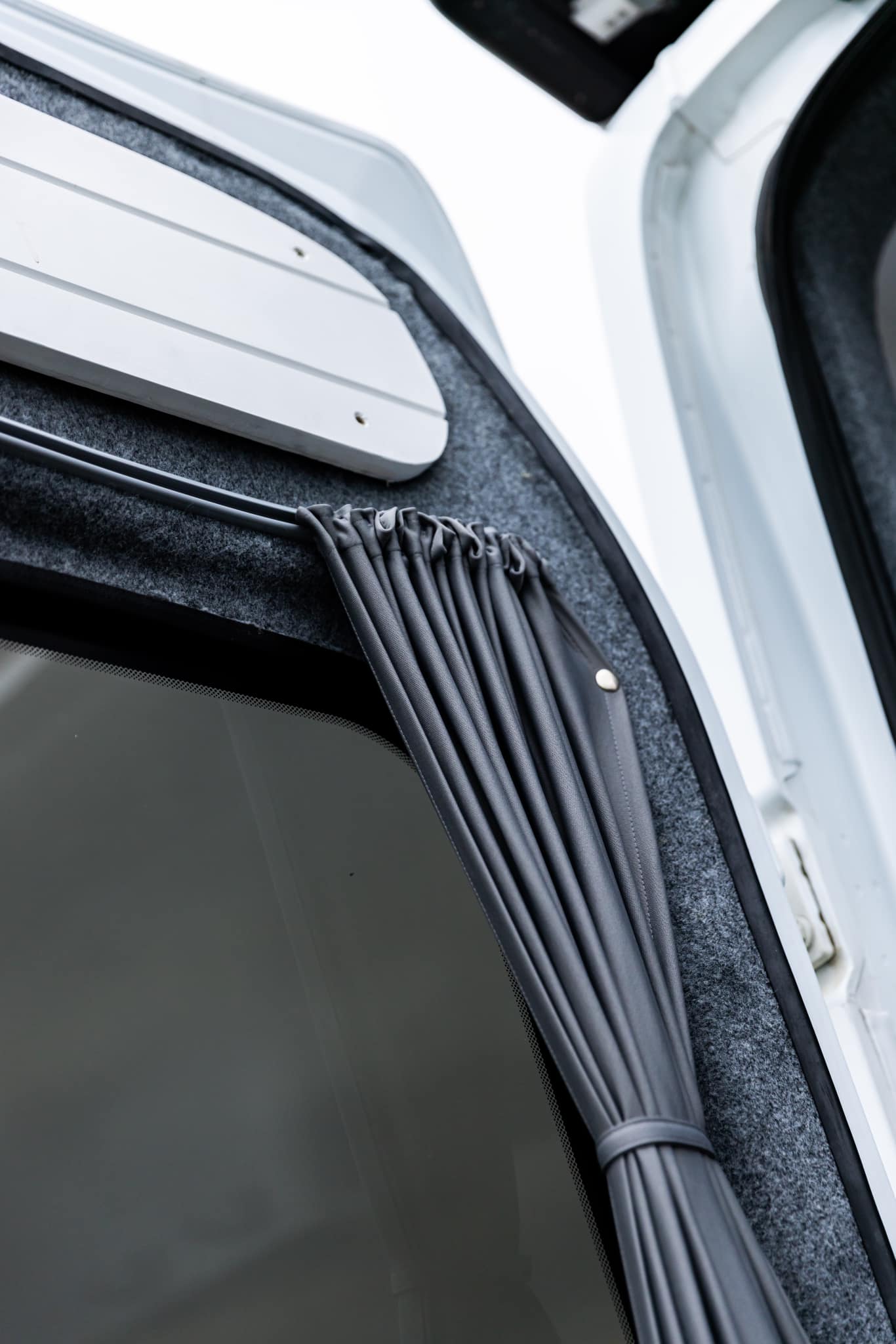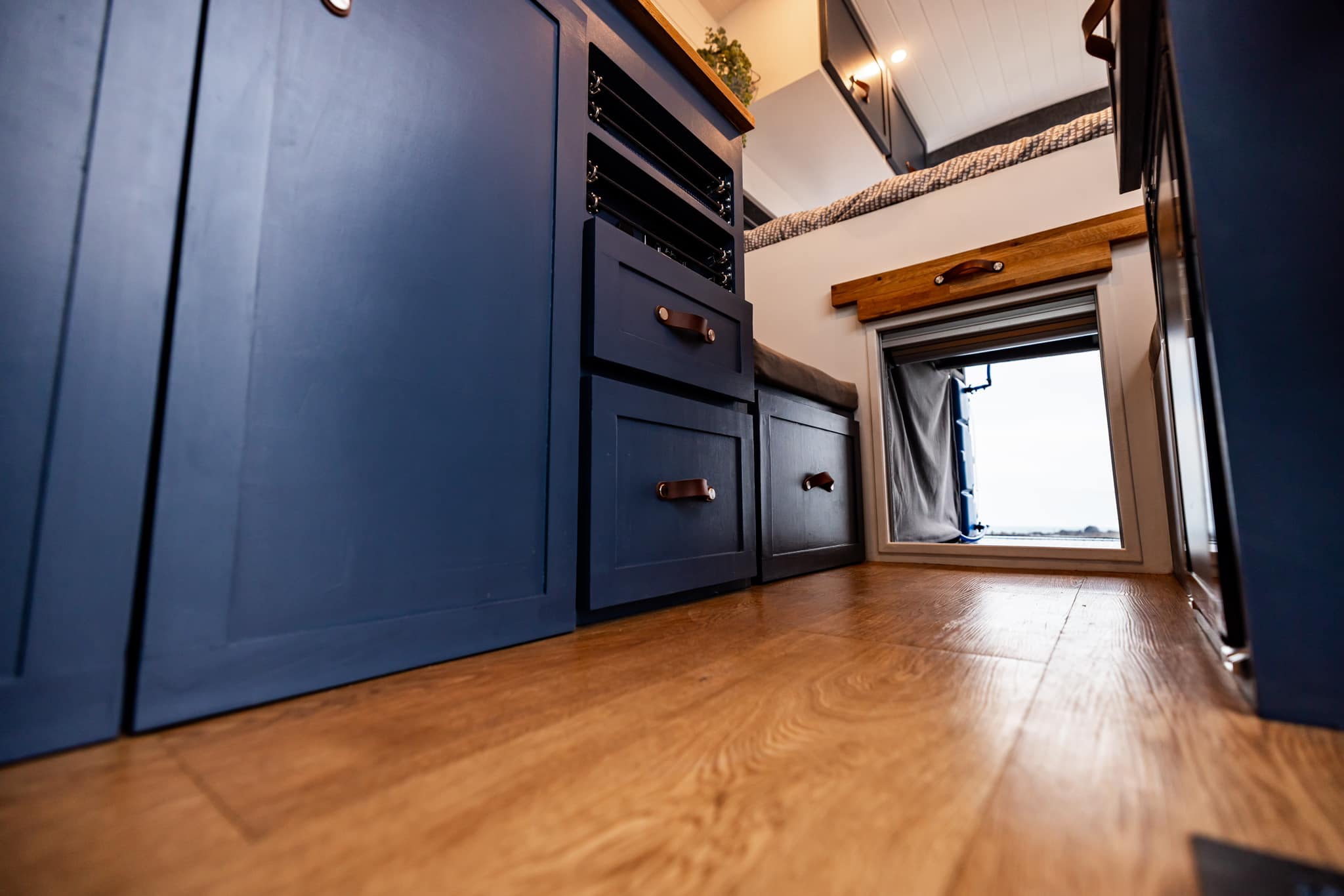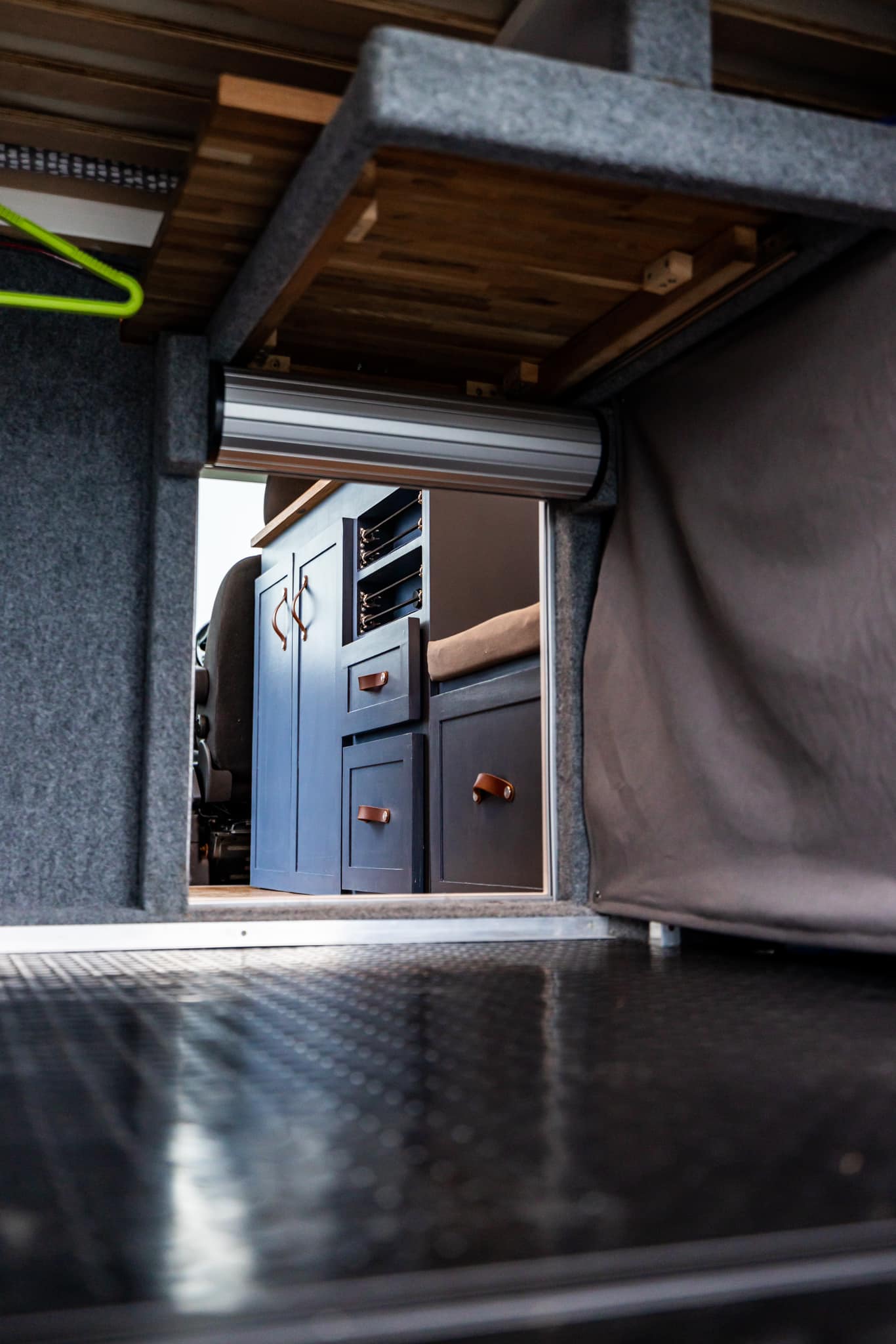 – Under-bed garage (storage for bikes, skis, or surf boards) accessed from rear Barn doors and via tambour door from living area. Garage area floored with non-slip industrial rubber dot flooring. Hanging rail.