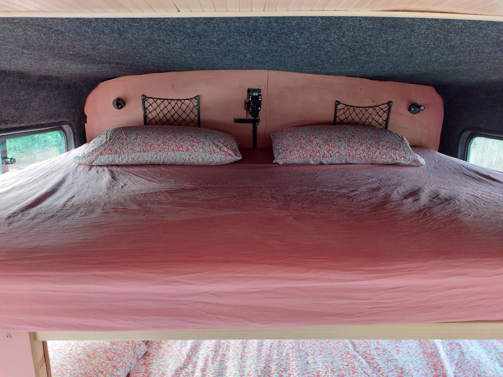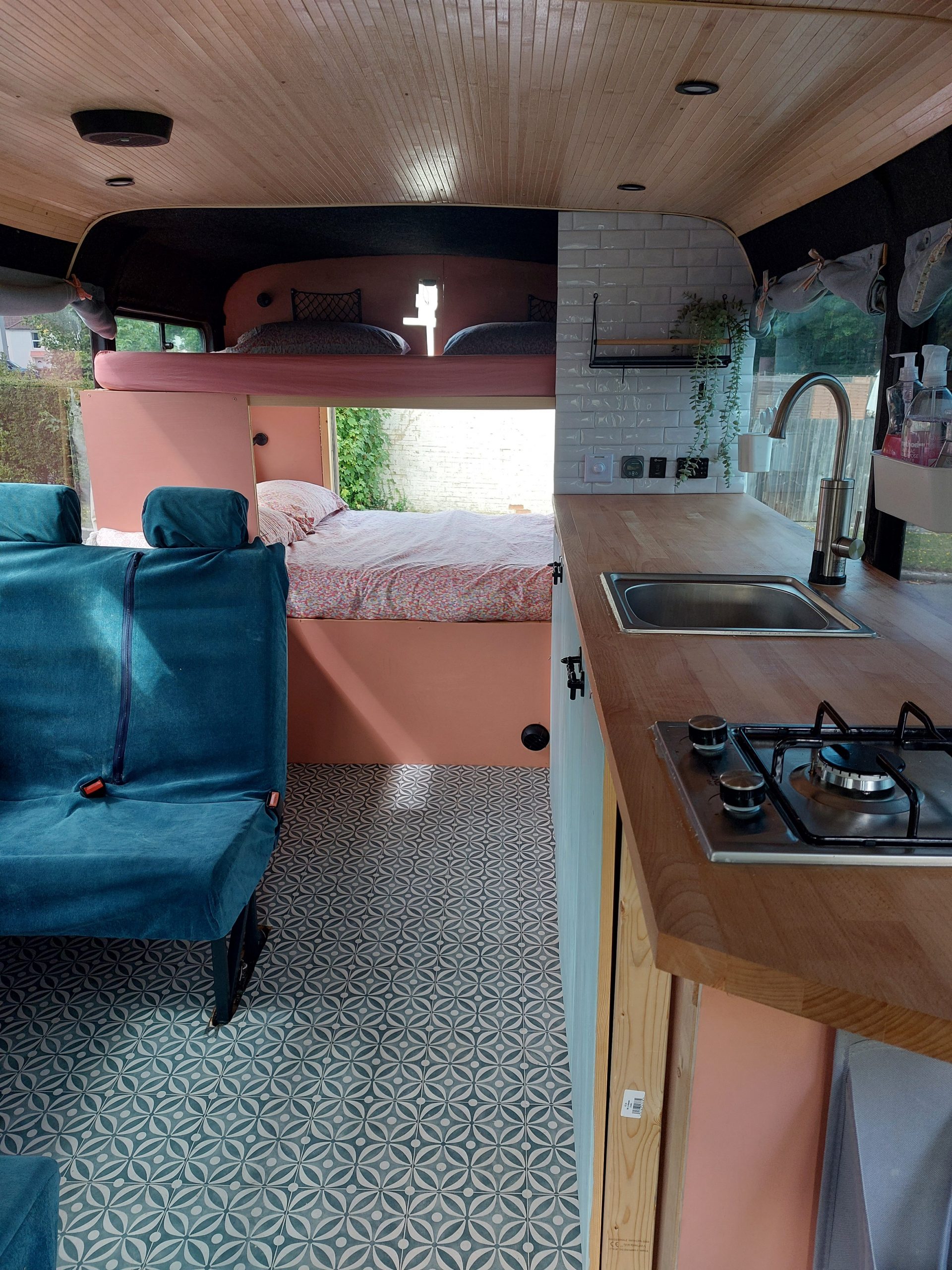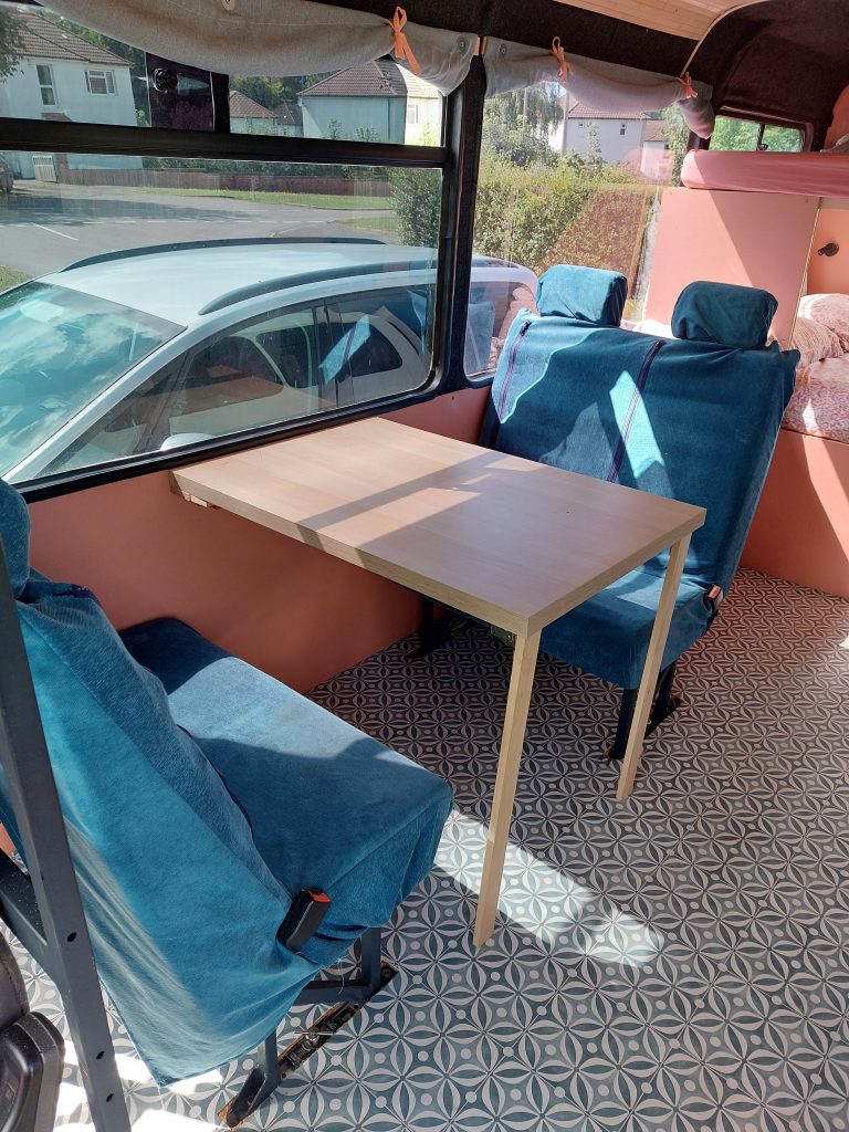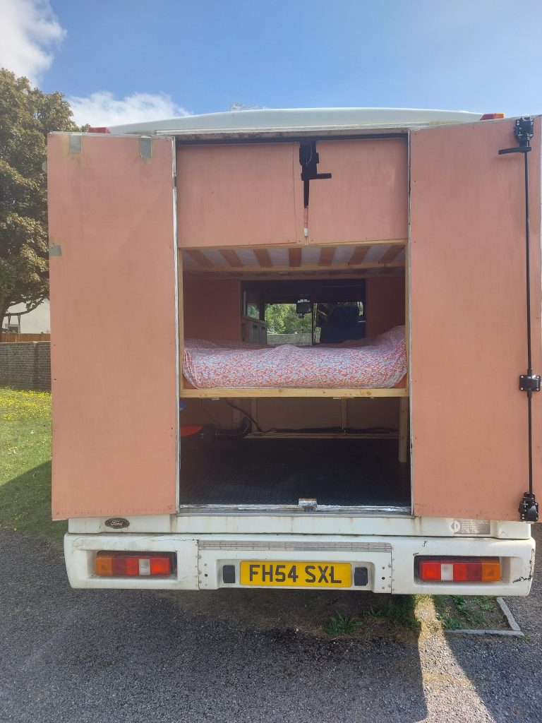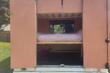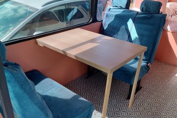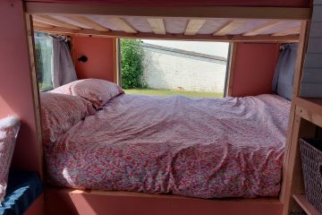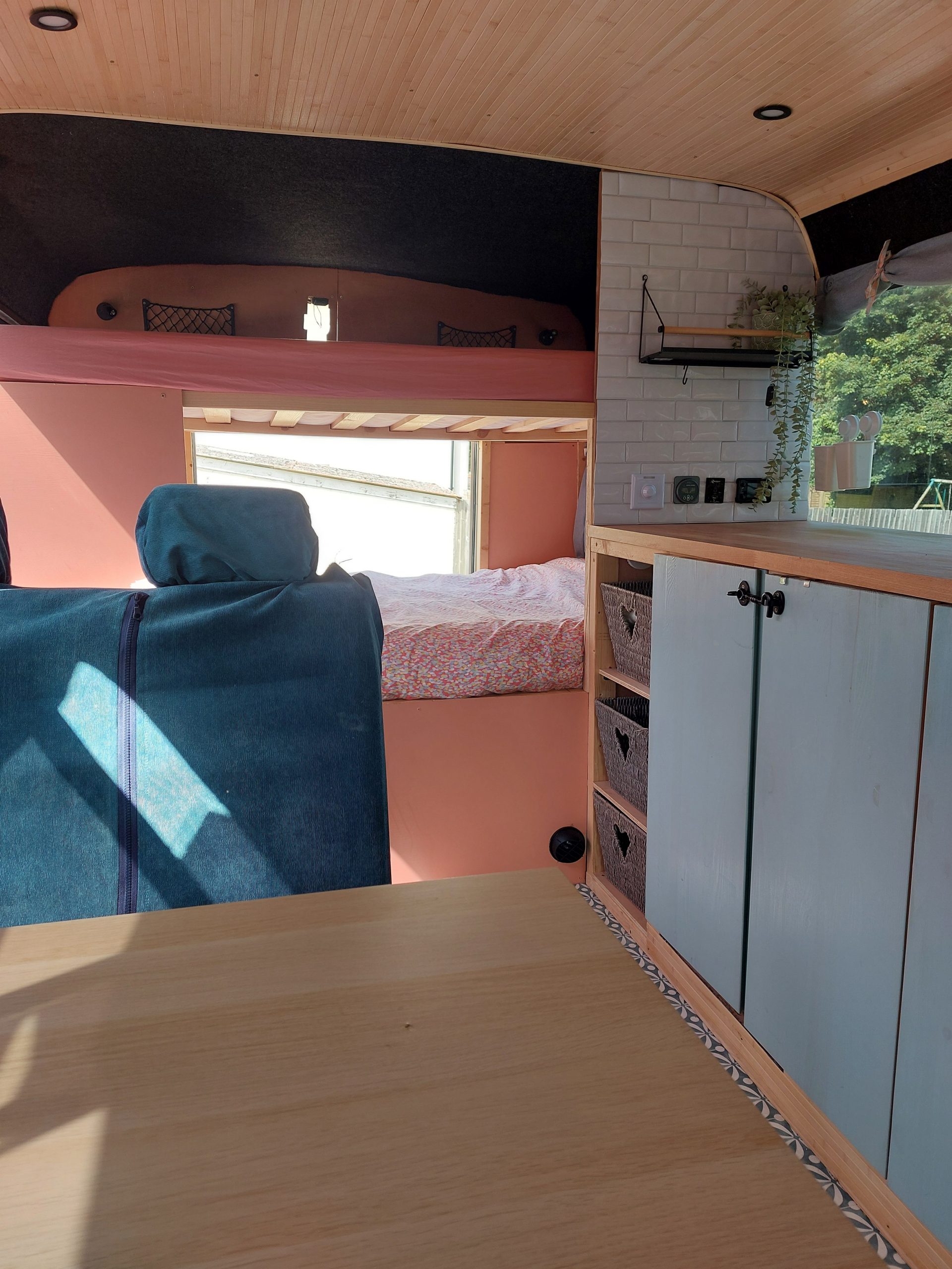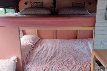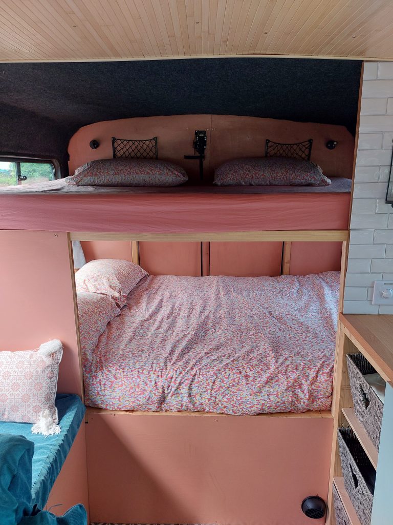 4/5 berth Camper van self-build, double bunk bed (top bunk king, bottom bunk European double) and 4 belted seats in the back, it can comfortably be used for a family of 5 with small children, by utilising the seating area for a travel cot/toddler mattress (not included) or having three children sleeping width way on the top bunk. Large amounts of storage across bus make it ideal for longer adventures.
