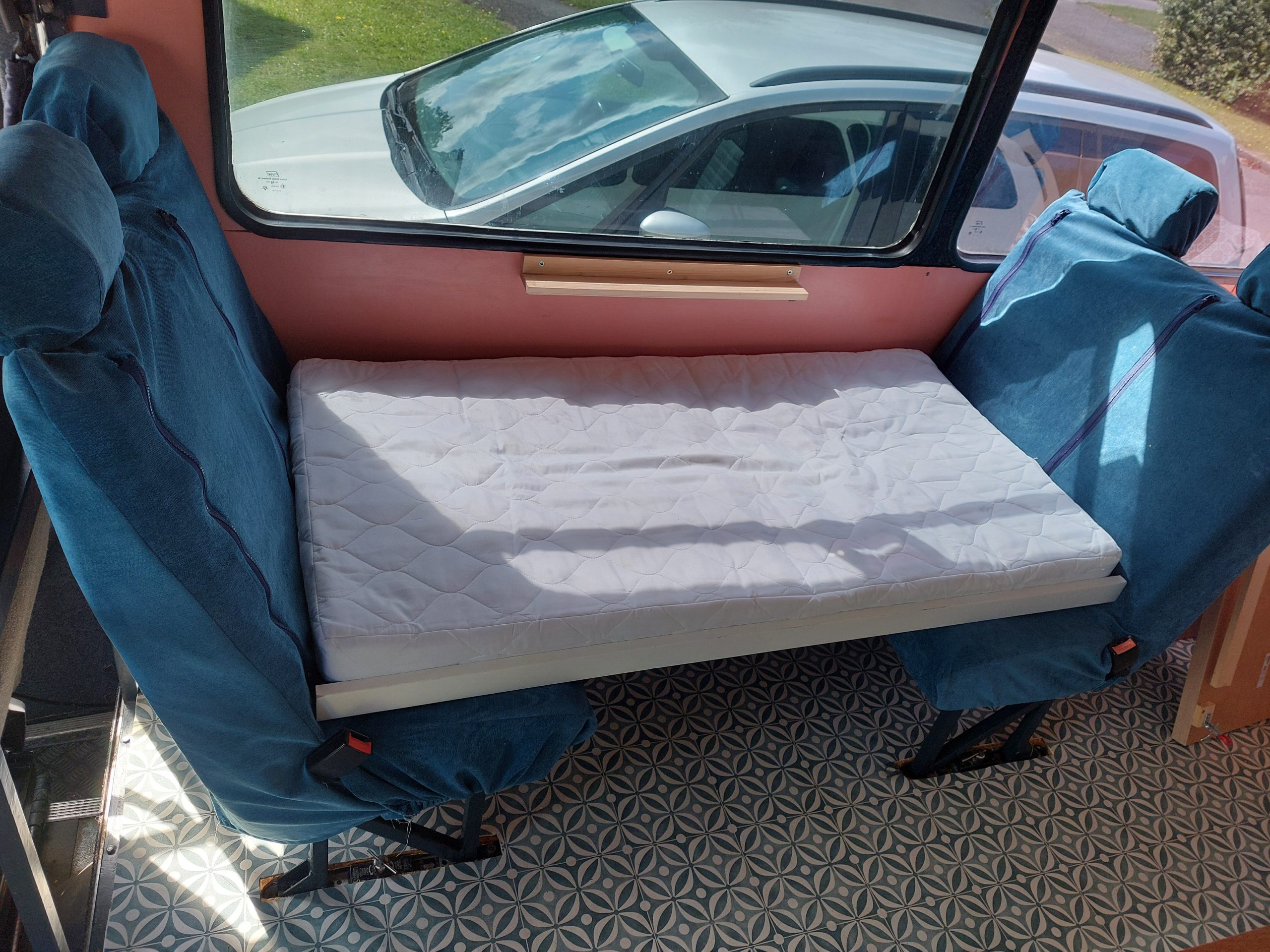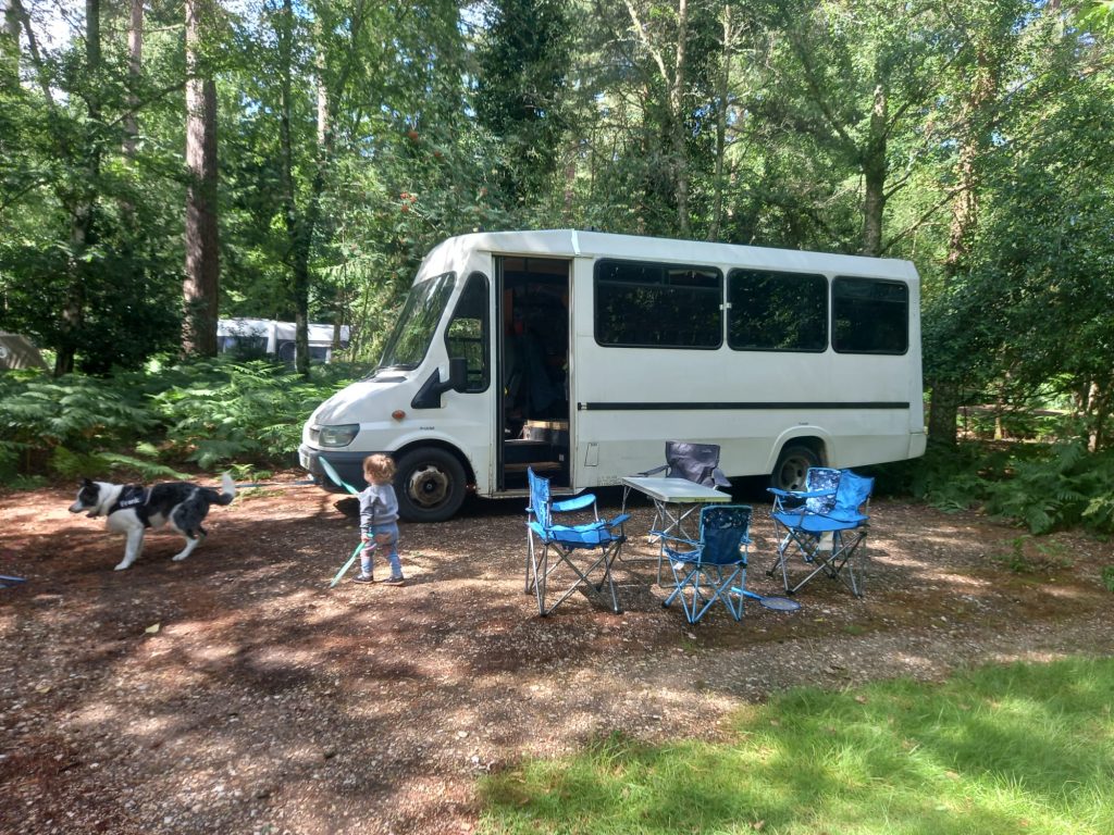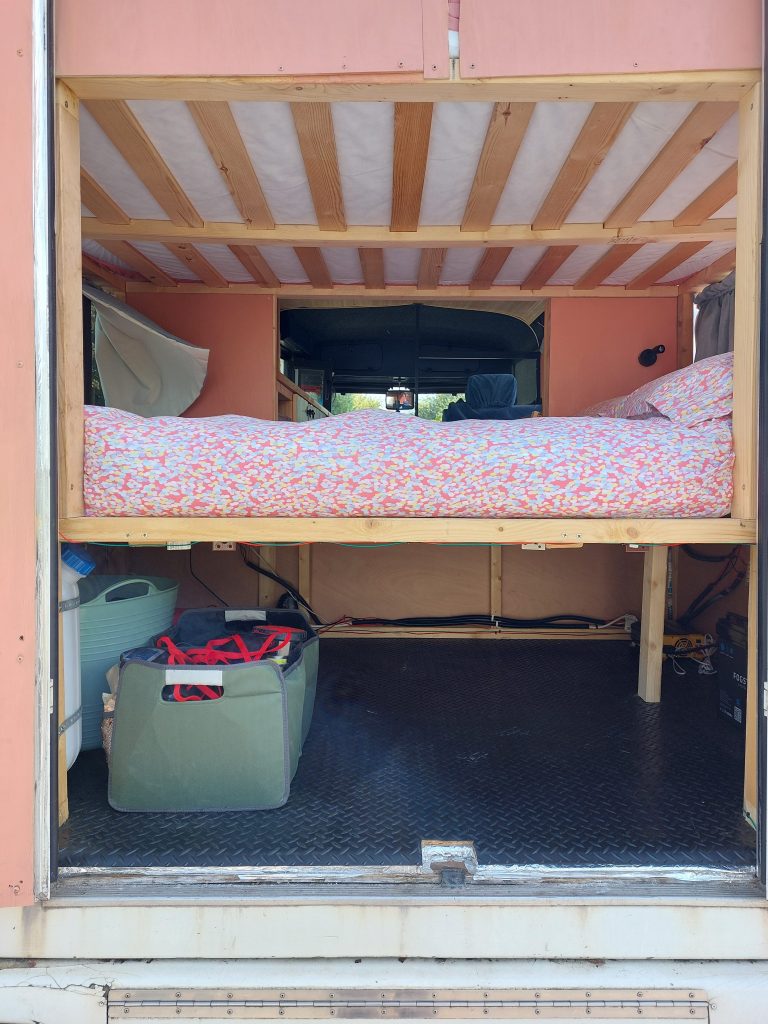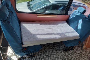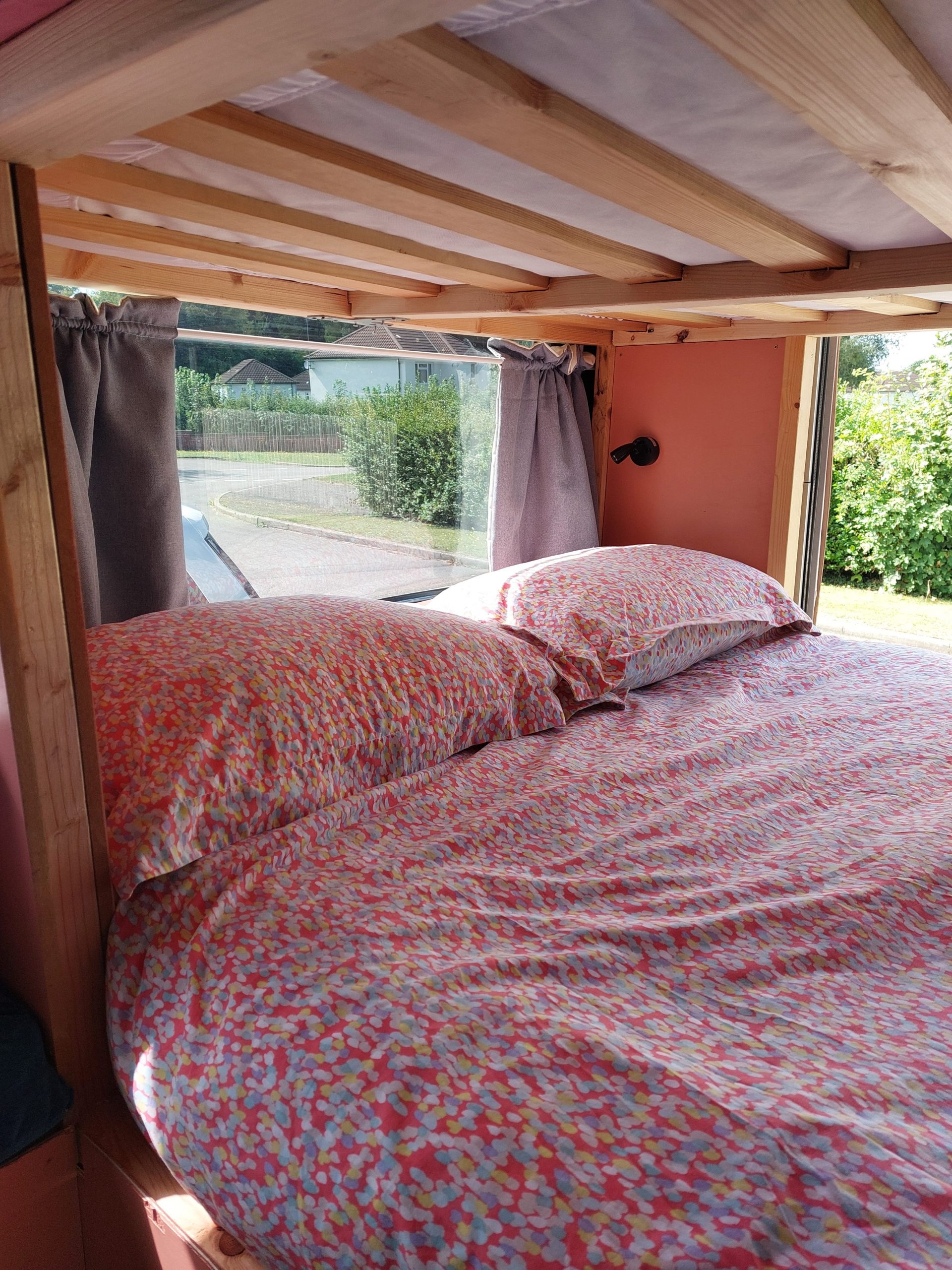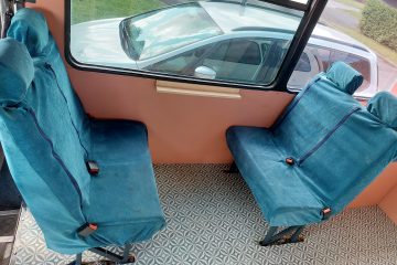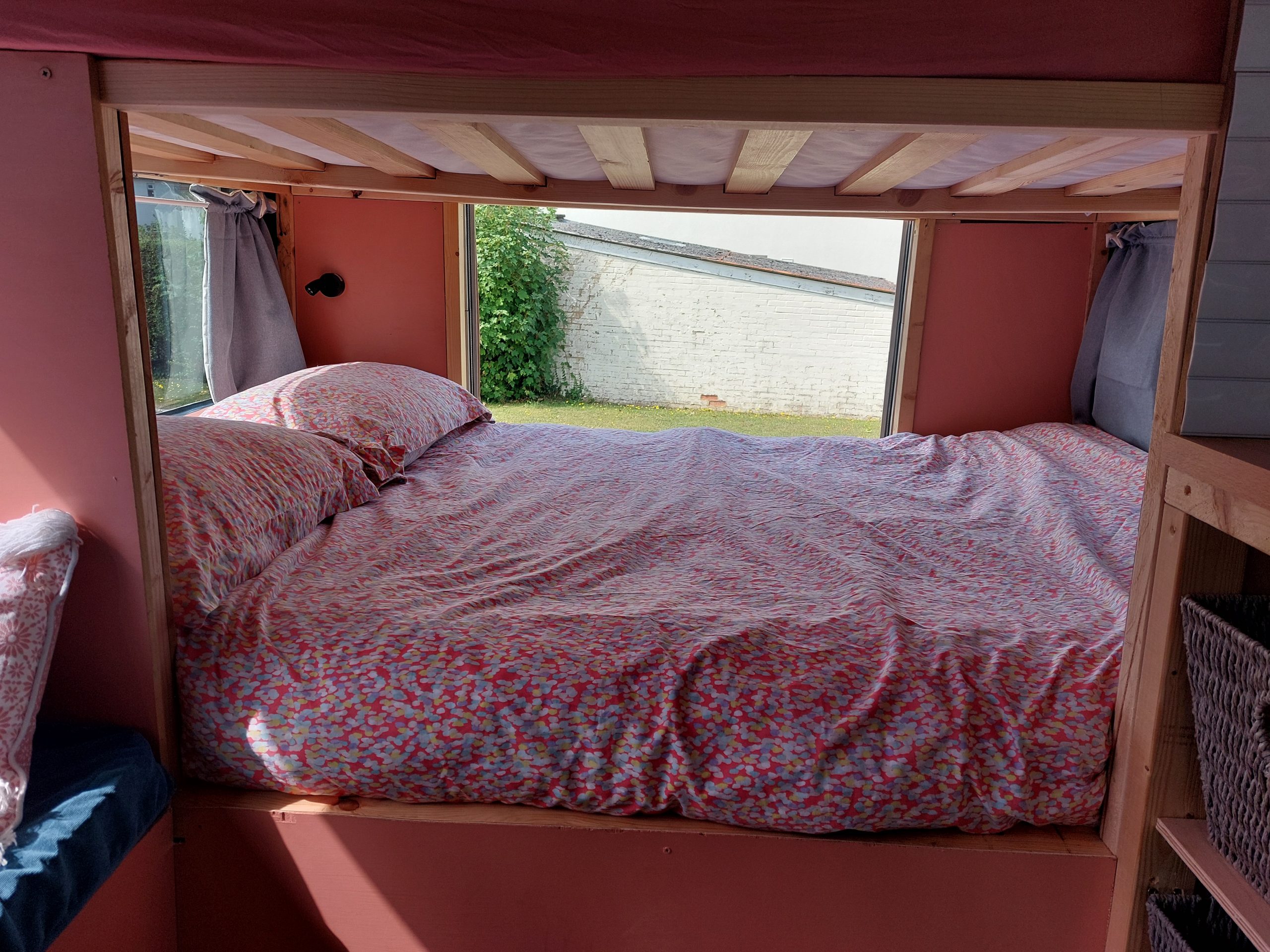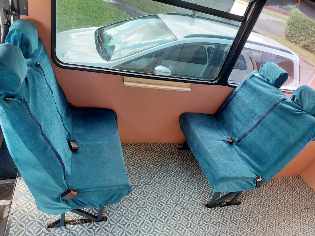 4/5 berth Camper van self-build, double bunk bed (top bunk king, bottom bunk European double) and 4 belted seats in the back, it can comfortably be used for a family of 5 with small children, by utilising the seating area for a travel cot/toddler mattress (not included) or having three children sleeping width way on the top bunk. Large amounts of storage across bus make it ideal for longer adventures.