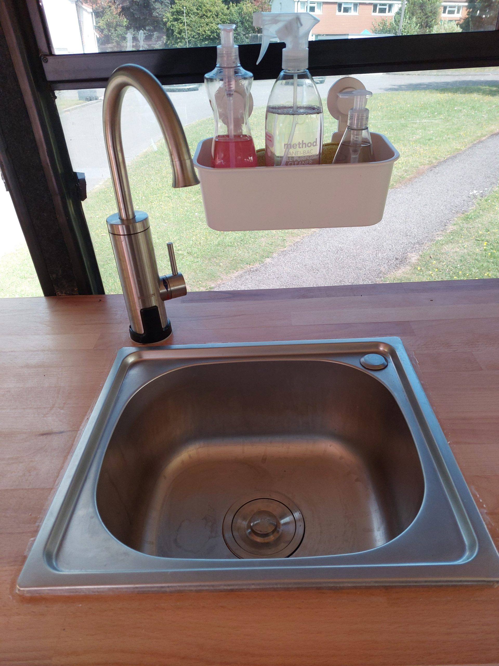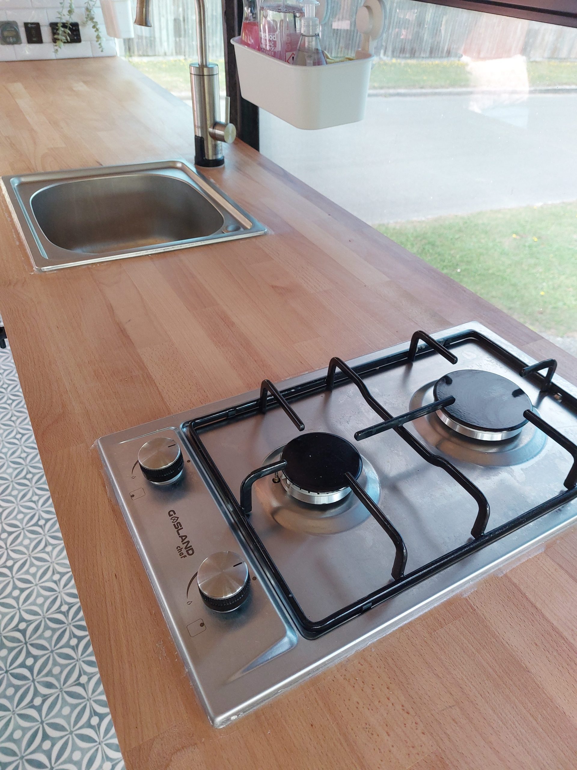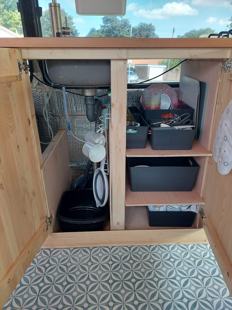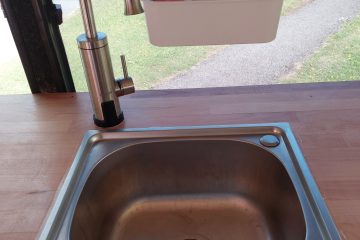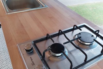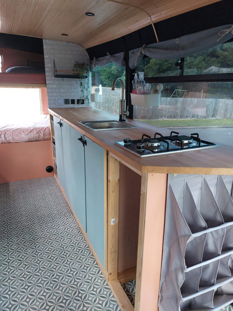 Full kitchen work top with intergated sink running from underslung water tank and run off to grey tank. Gas hob connected to Butane botel in locker. 12v fridge and large amount of storage under counter with built-in shelving. 240v power also available under counter top.