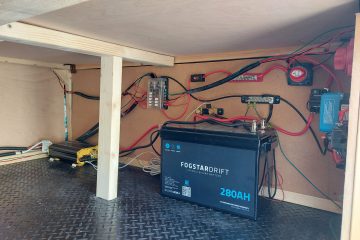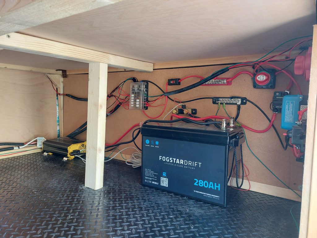 Power provided by 2x PVs mounted to roof and generous 280Ah Fogstar Drift leisure battery with Bluetooth connectivity. 1100W Kreiger inverter also provides 240w outlets where needed. Reading lights with integrated USB chargers in bed areas and additional USB port in living area. Toilet is a cassette located near front when driving.
