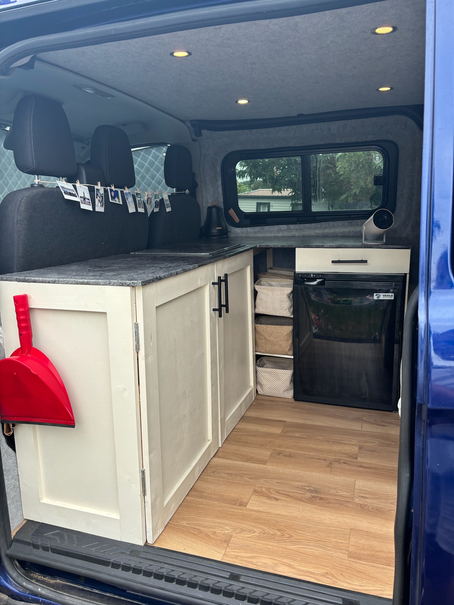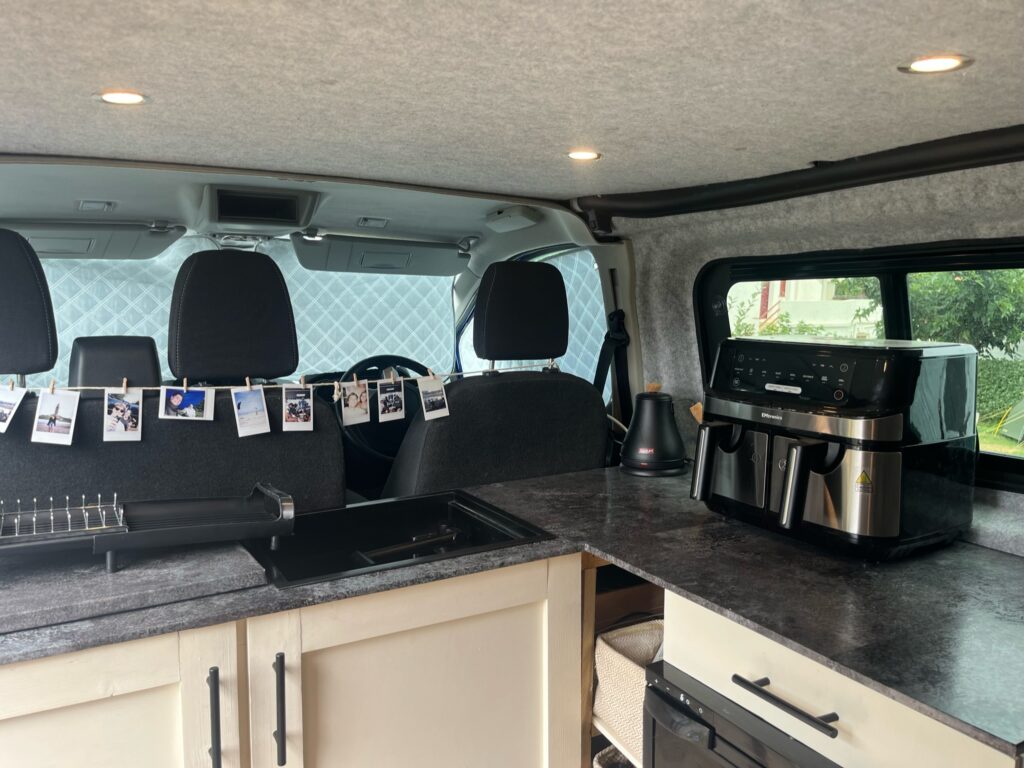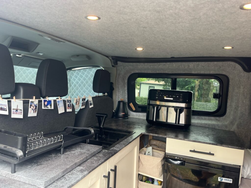 L shaped worktop with 65L fridge freezer, storage shelves with storage baskets included, hidden sink with water pump and 2 x 15L removable water containers (waste + fresh) all hidden in cupboards. Shelved storage cupboard which fits double air fryer (included in sale).