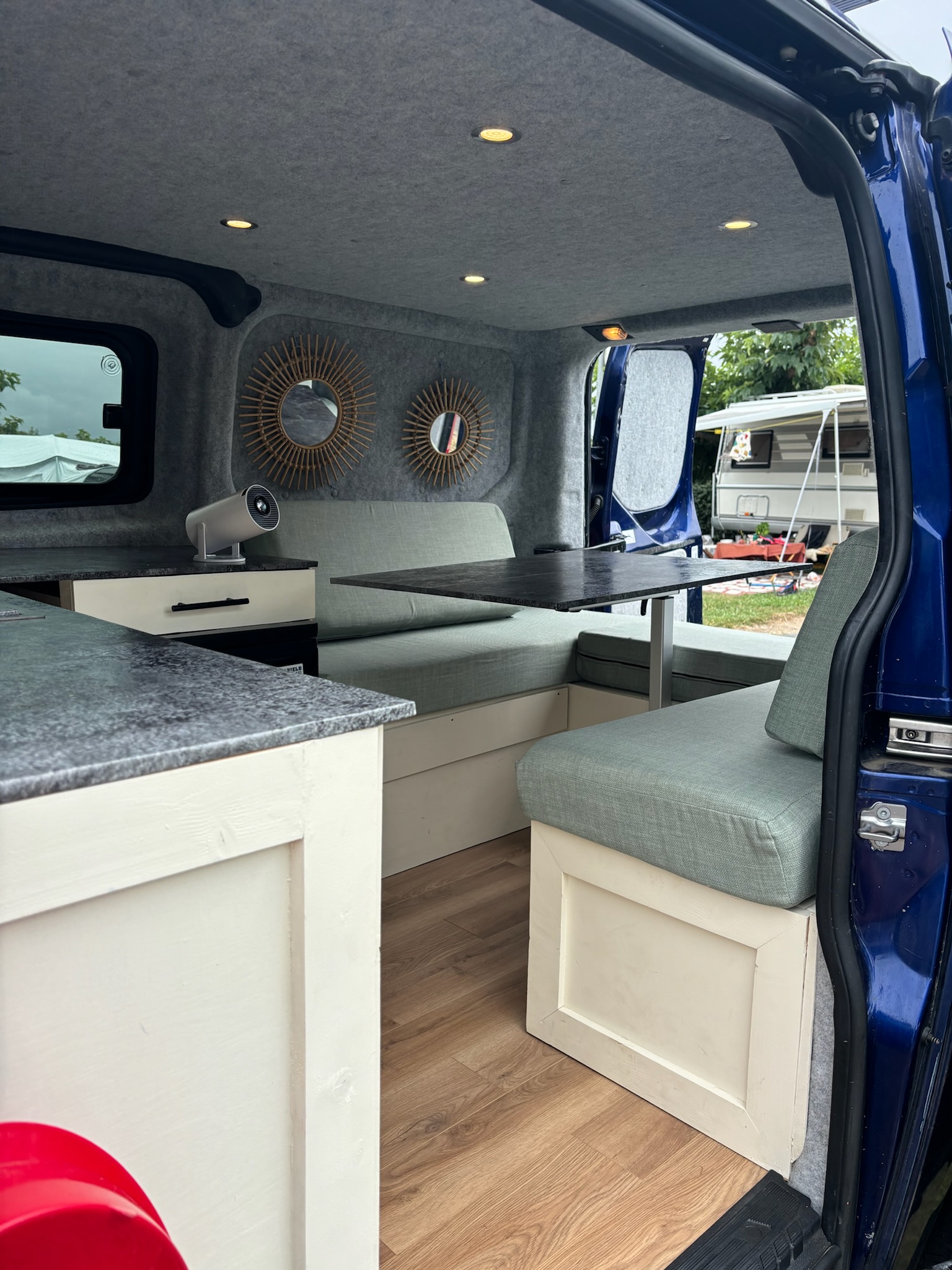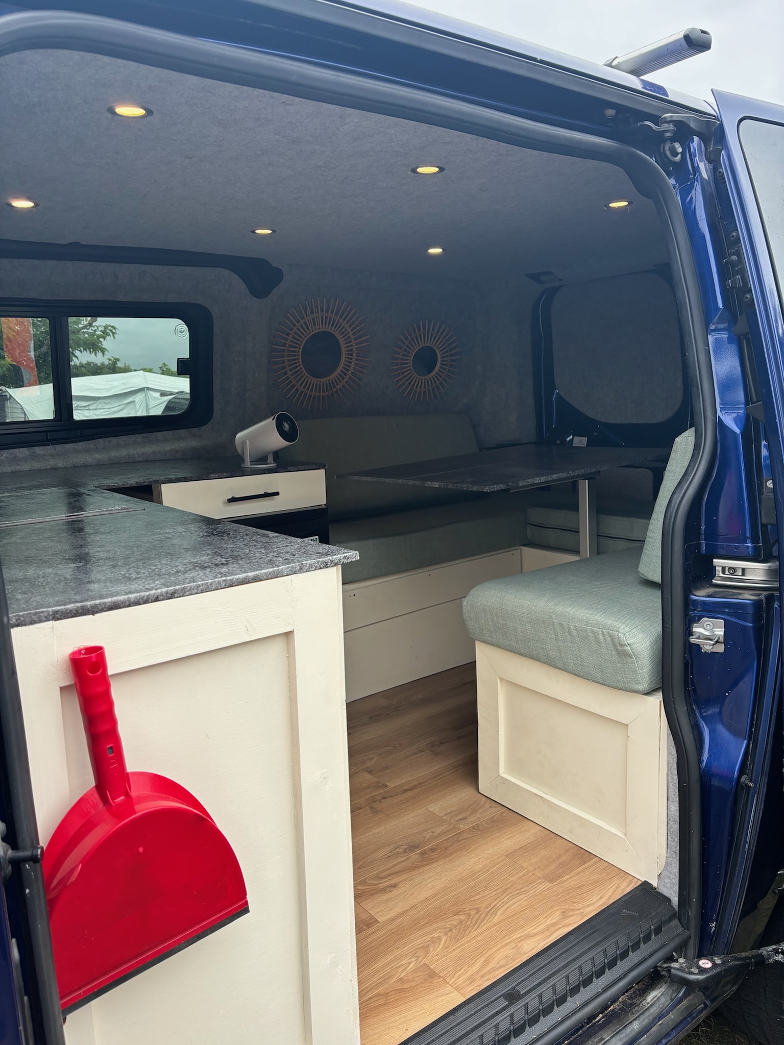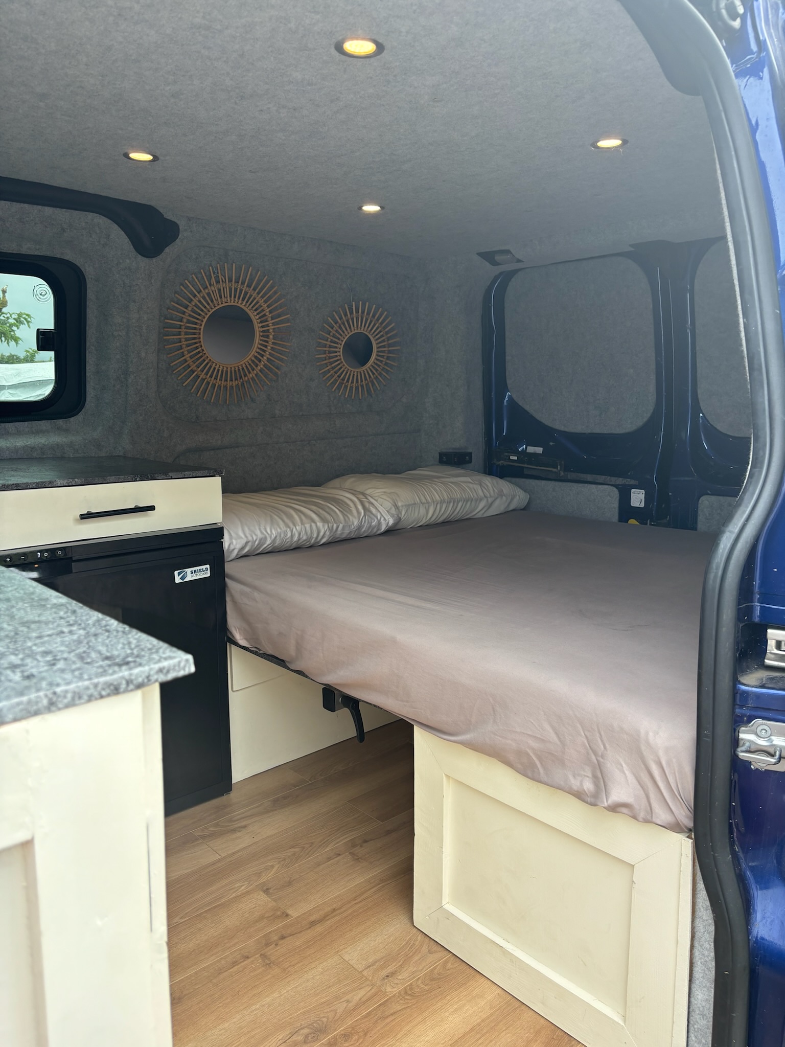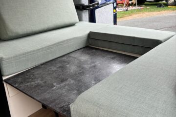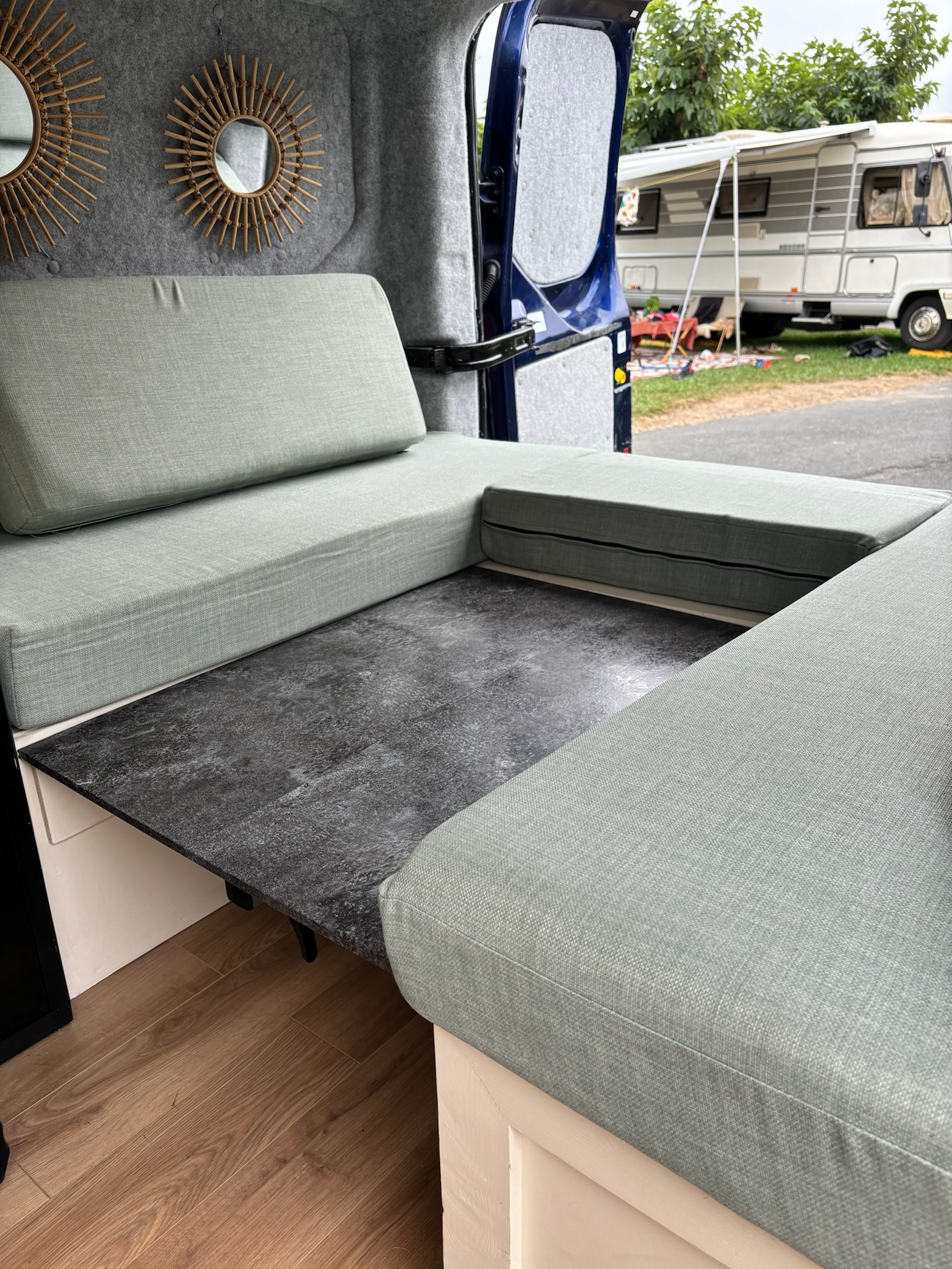 Stone styled work top with oak styled flooring. Mint bed/seat covers which are removable and washable.