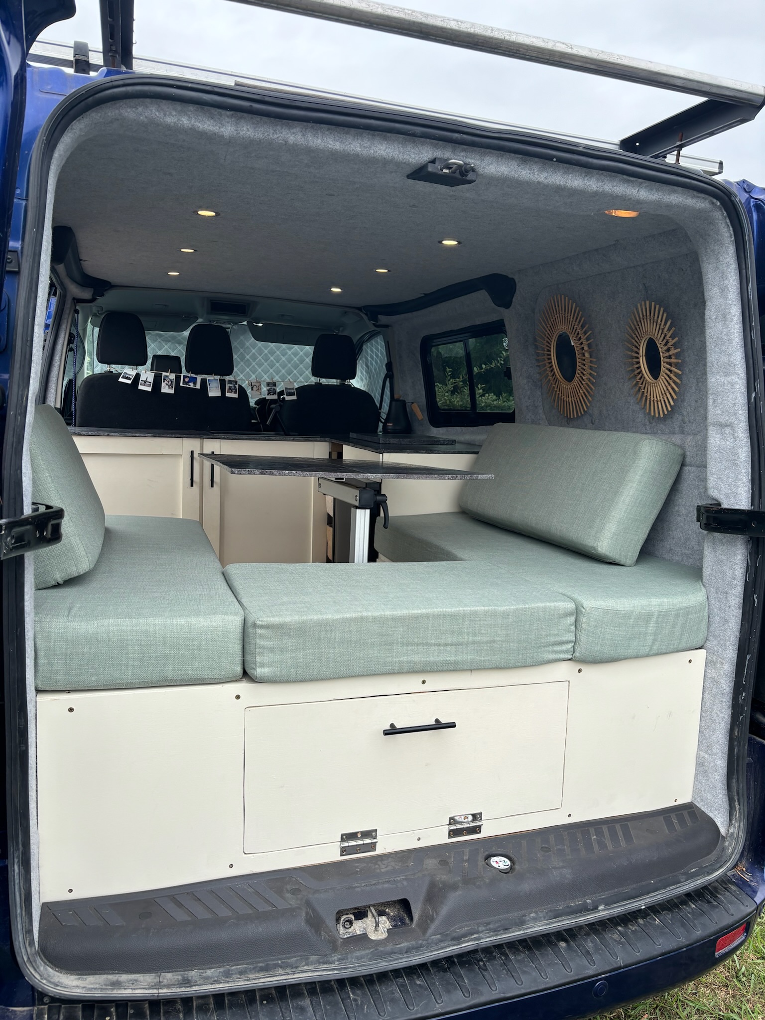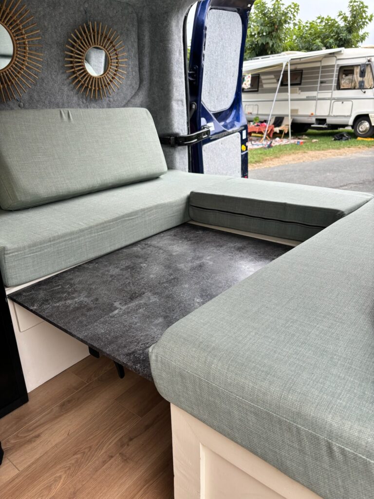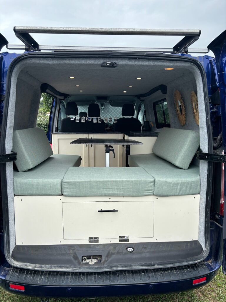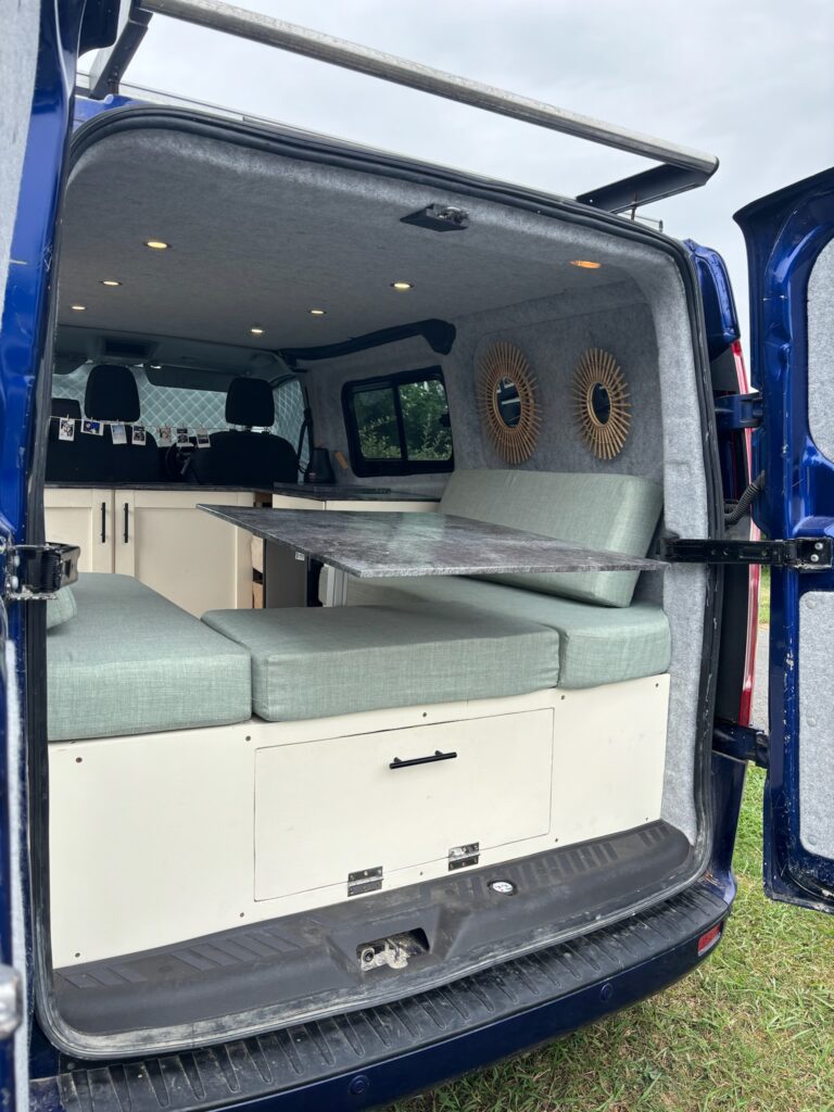 Bed for 2 adults sleeps horizontally with the van. Built so the middle comes up to become a table with U shaped benches plenty a under bed storage.