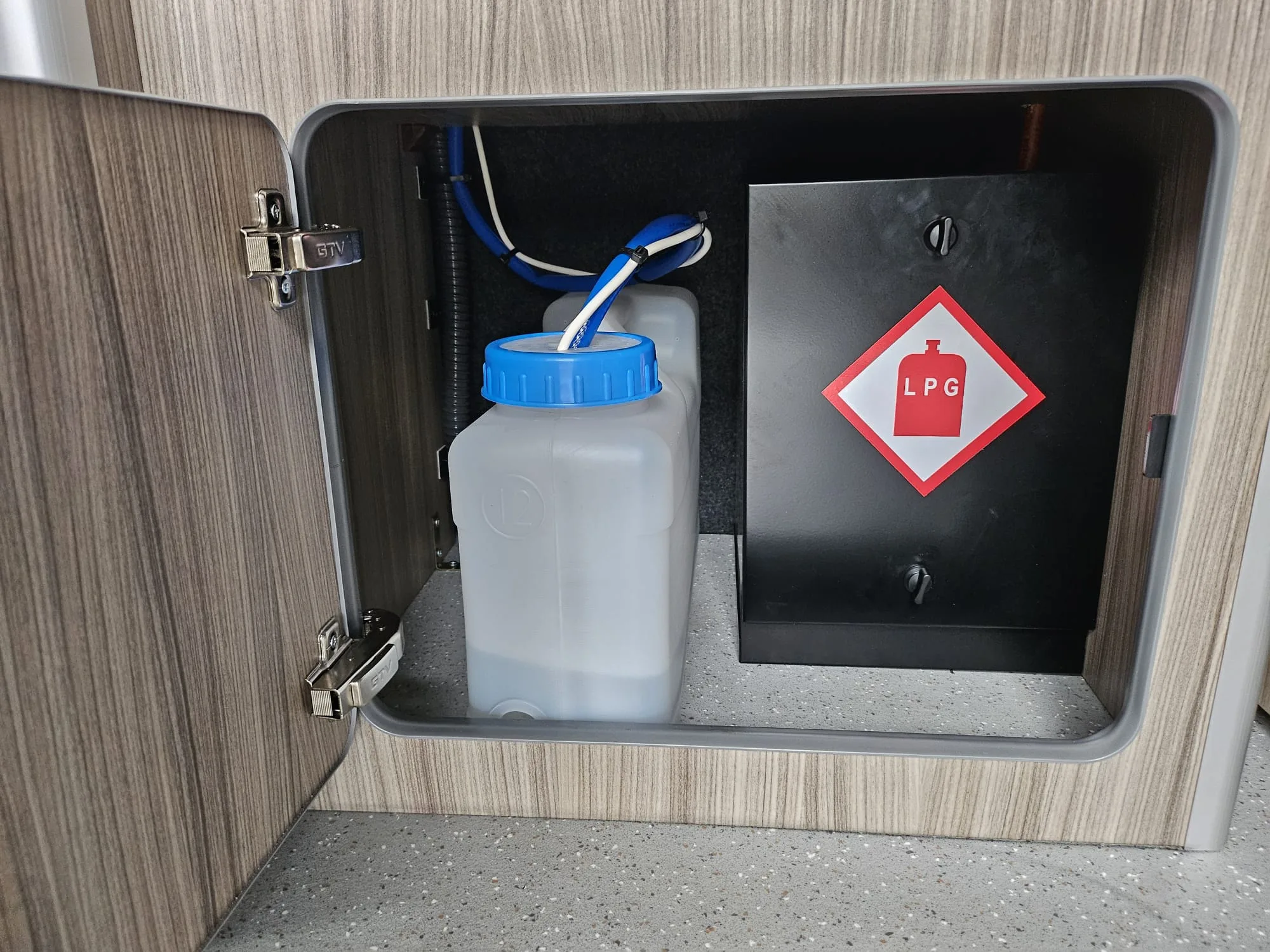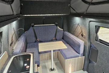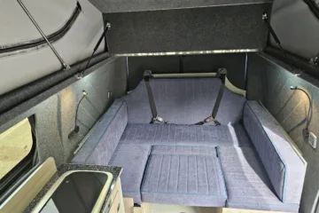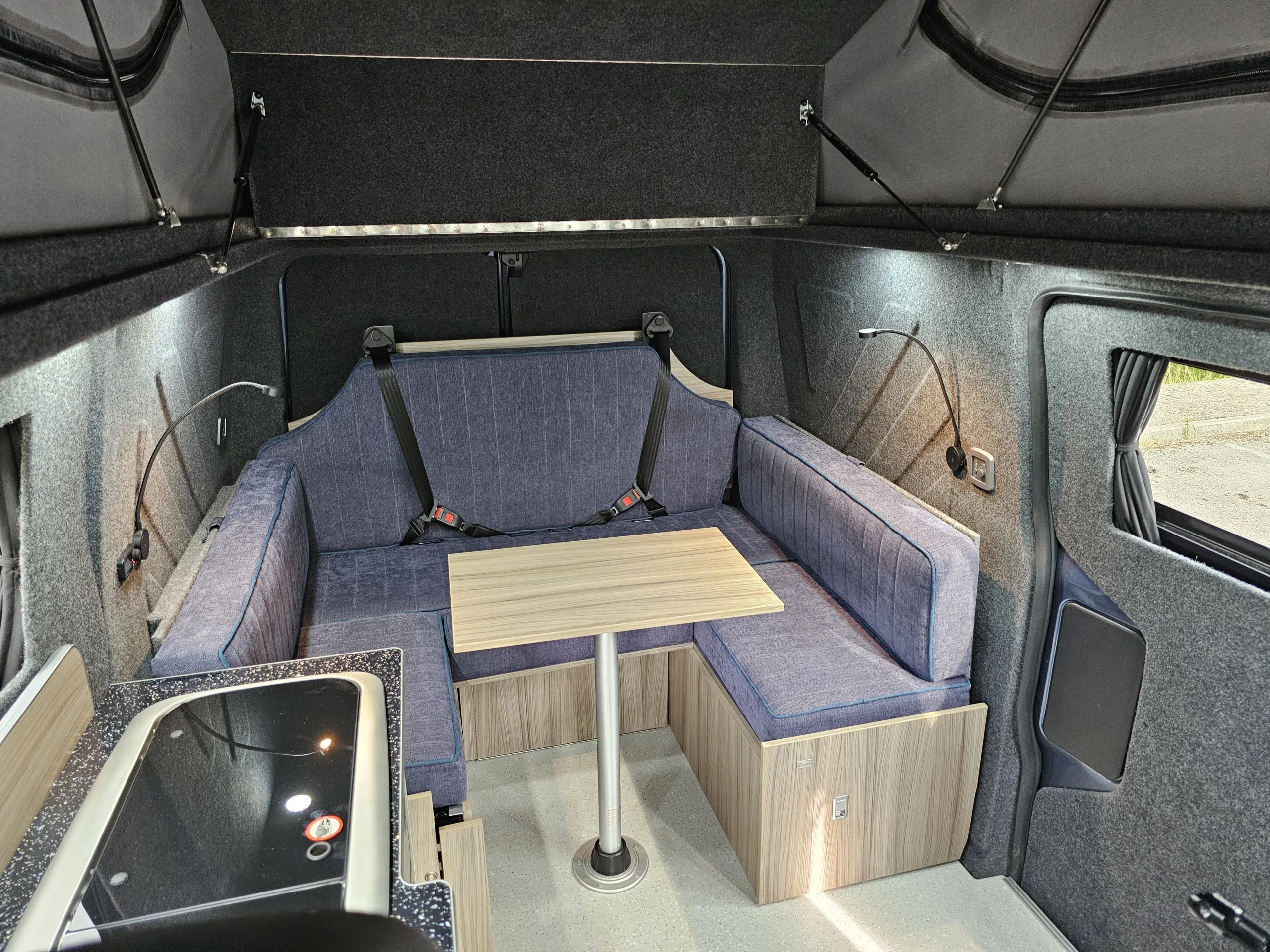 U shaped seating with crash test certificate, 2 seat belts with Iso fix points. Loads of room for storage under the seats, seats can be configured in multiple ways to suits your sitting/sleeping requirements