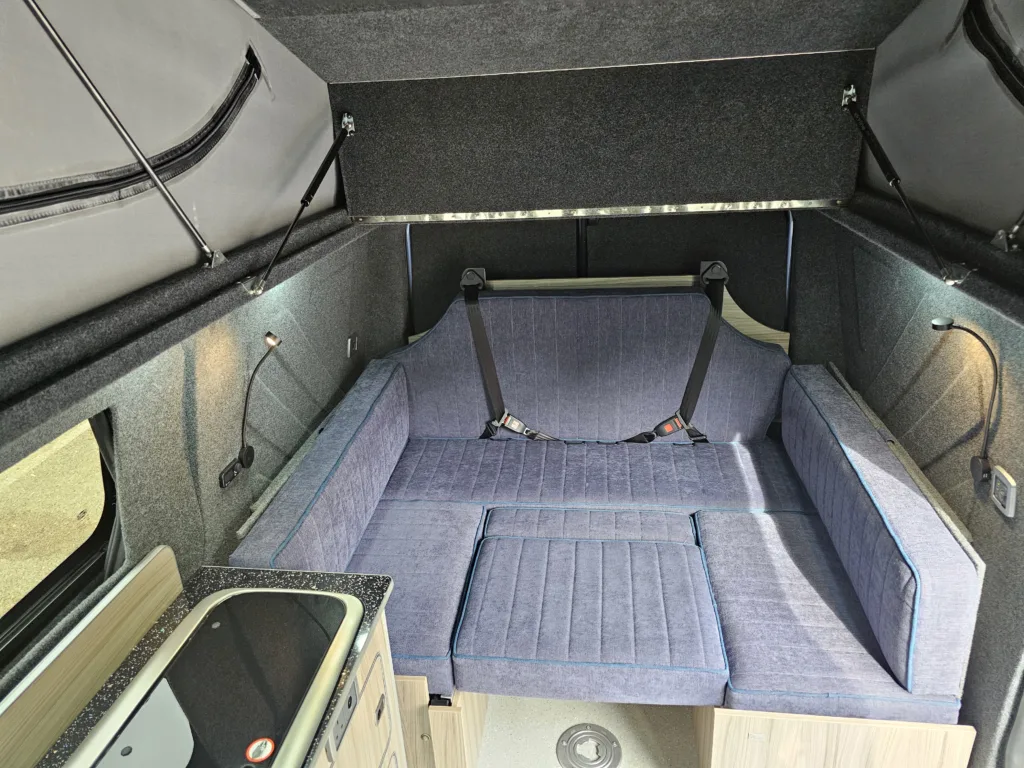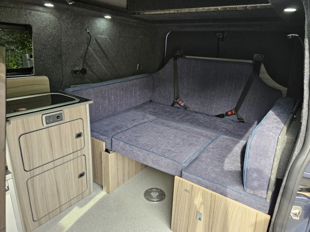 U shaped seating with crash test certificate, 2 seat belts with Iso fix points. Loads of room for storage under the seats, seats can be configured in multiple ways to suits your sitting/sleeping requirements