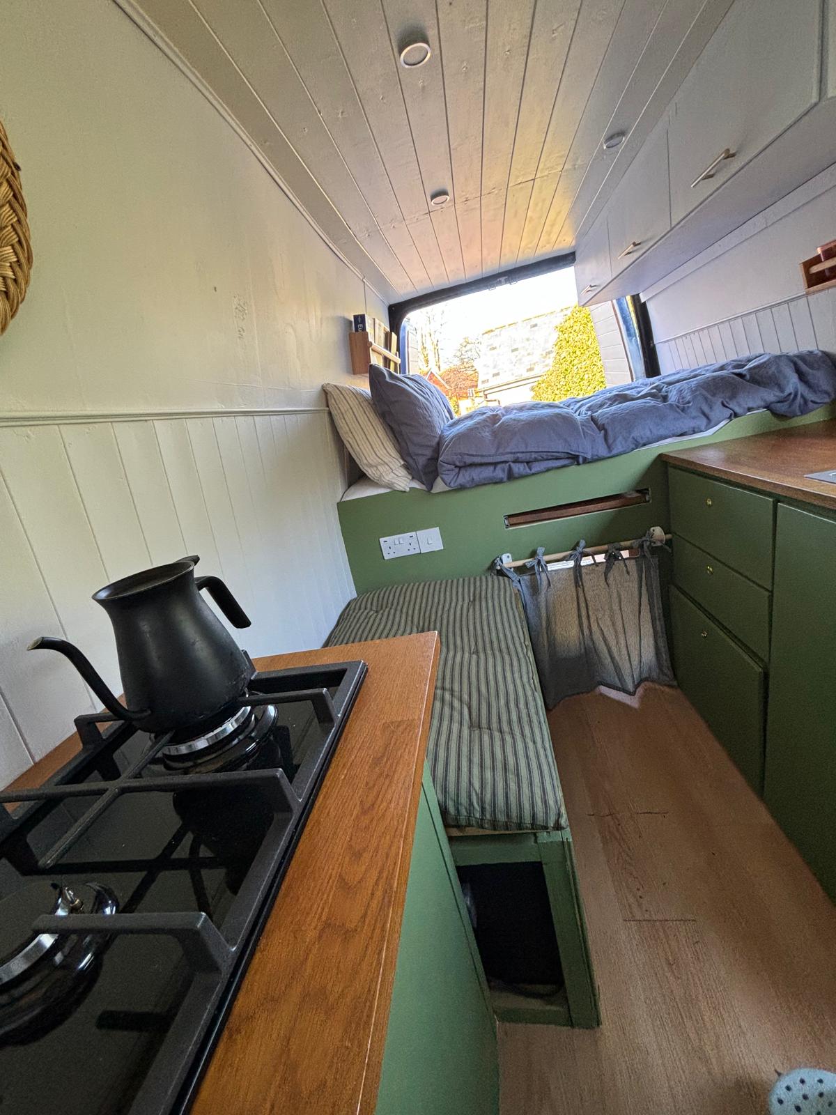 Camper renovation includes a new foam mattress purchased March 2024, a Β£1500 Dometic fridge freezer which is fitted beneath the seating area, a pull out table, two units one beneath the stove, and one beneath the sink which includes counter space, 3 drawers, and a double door cupboard. There is an additional small counter which pulls up and down on the end of the cabinet. Above the bed are three over head cupboards. The van has two double plug socket ports as shown, inclusive of USB ports for charging devices, and has working spot lights on the ceiling. A shoe cupboard sits beneath the seats. The bulkhead also provides a large amount of extra storage. There is a shower tray and curtain hooks installed into the entrance of the van, great for summer months/when abroad, the sink tap extends to create a shower either within this shower space or turns outside. Finally there is a sky light window and a side window, in working order with fly netting.