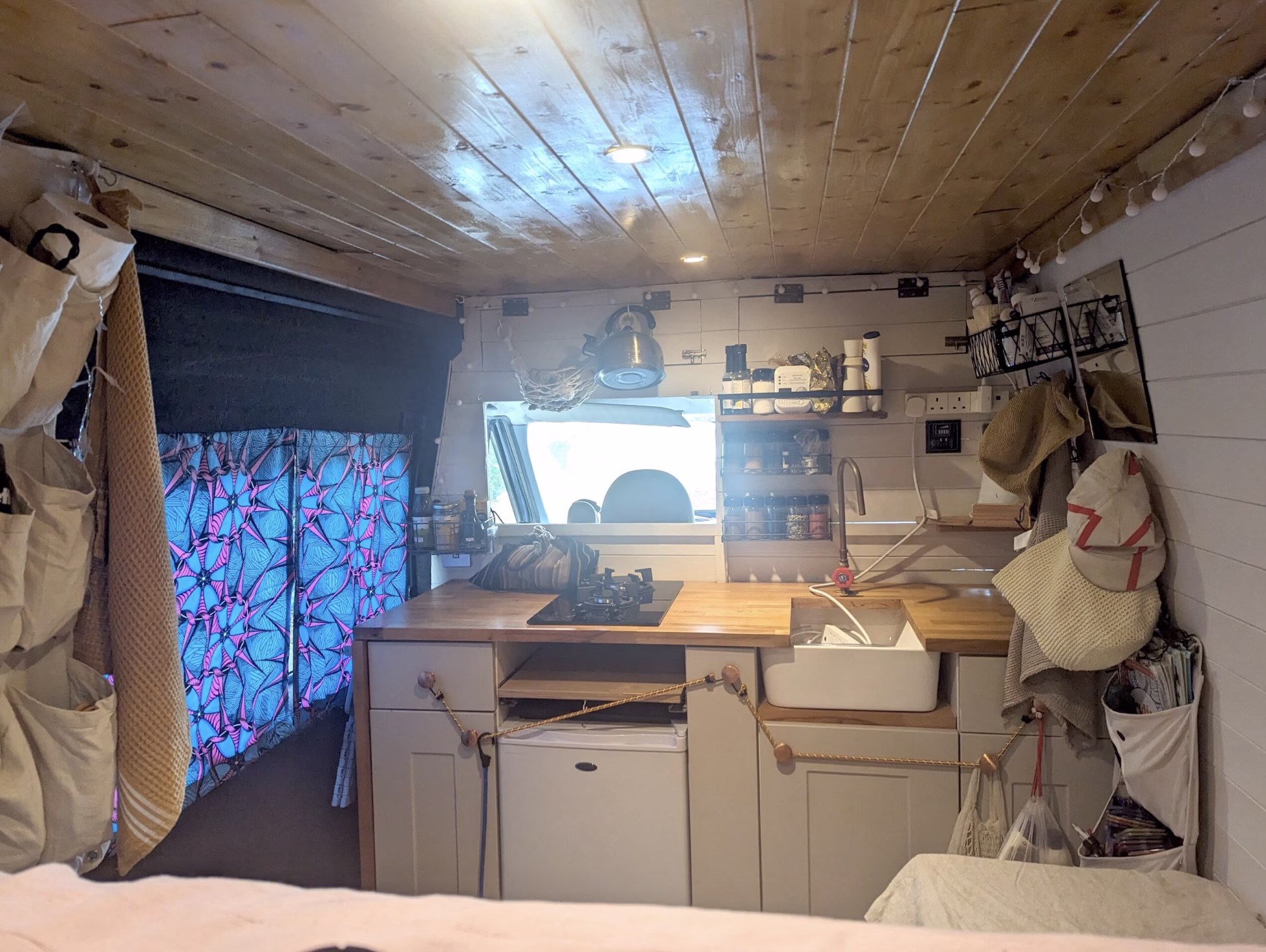 The van features a full kitchen with a worktop and pine tongue-and-groove panelling with proper insulation for warmth and comfort.