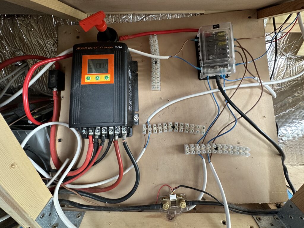 12V electrics 12V 200AH Expedition Plus Lead Carbon Gel Ultra Deep Cycle Battery, ASBO DC-DC charger and solar charge controller. 250Watt and 345W Canadian Solar Half Cell Panels.