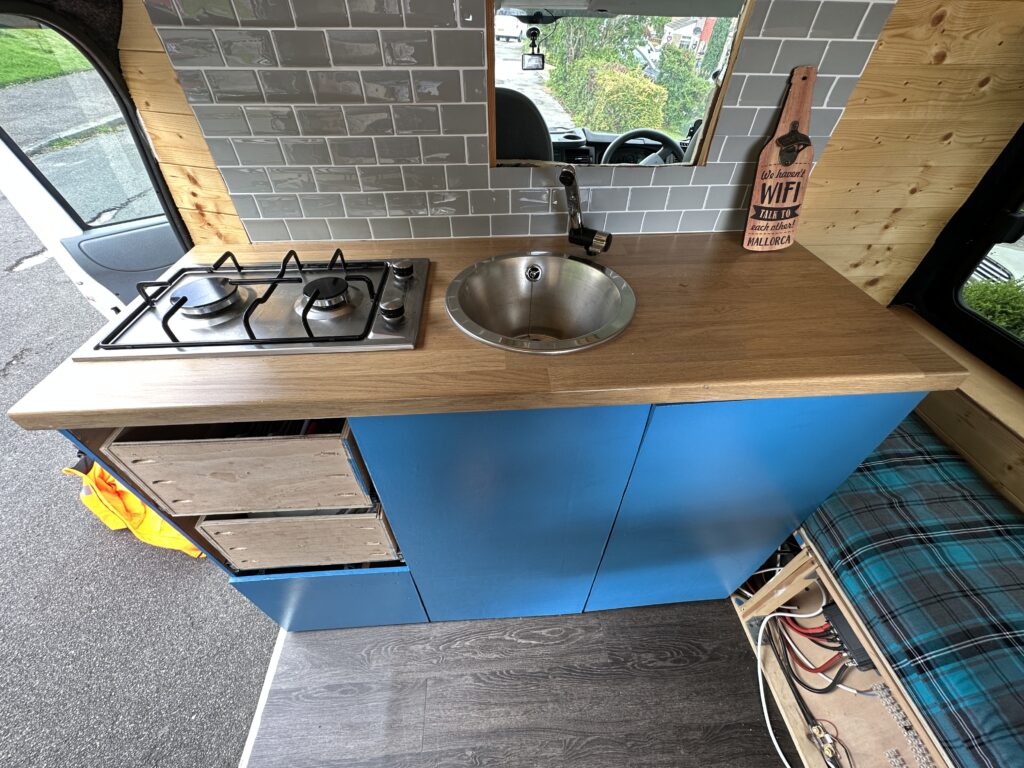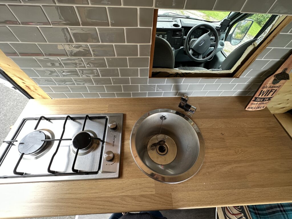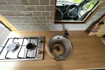 Kitchen unit and bench seat, two burner stove, Sink, two 25l containers, Calor gas bottle.