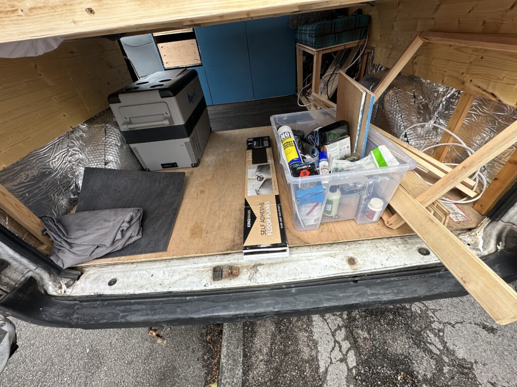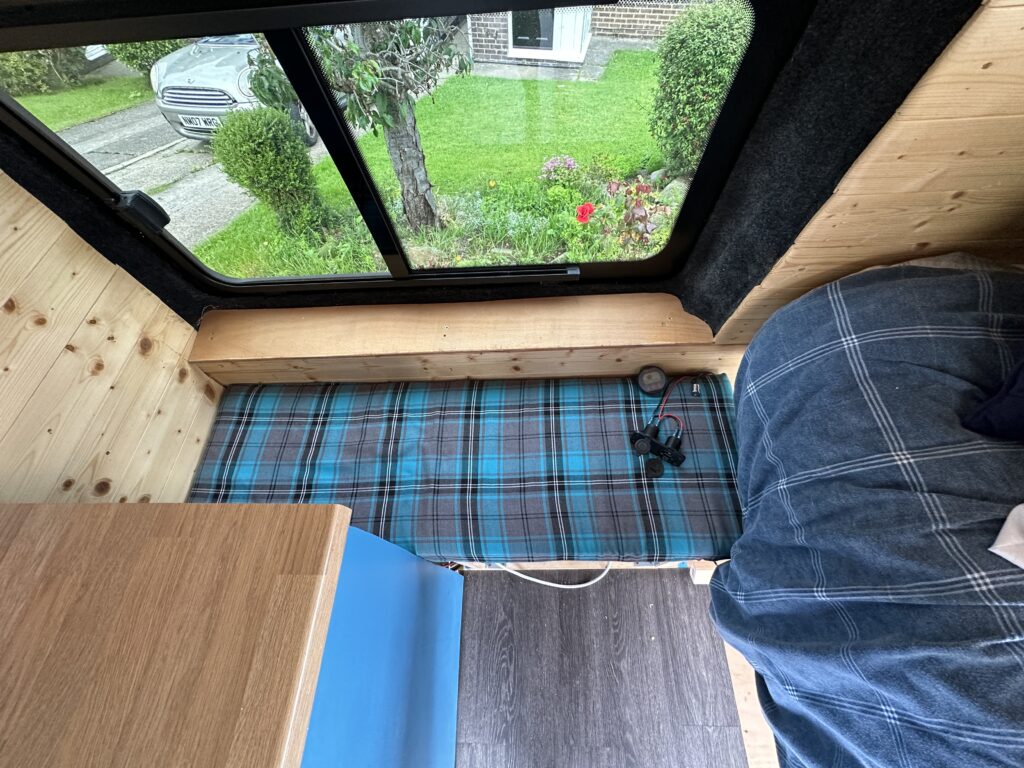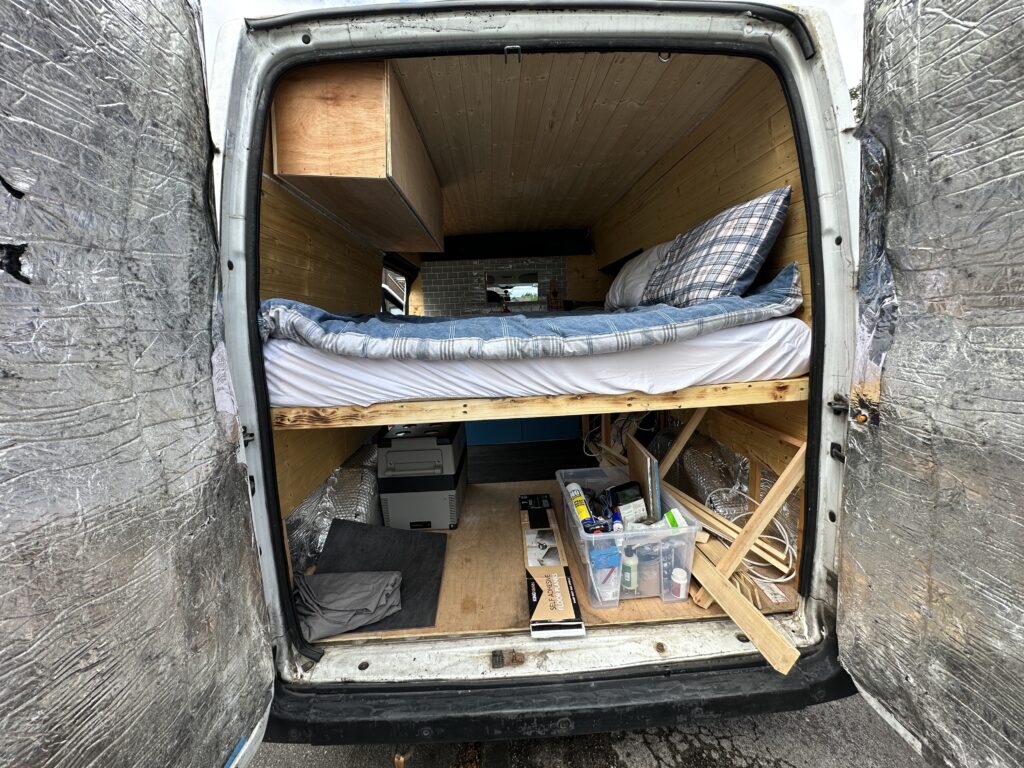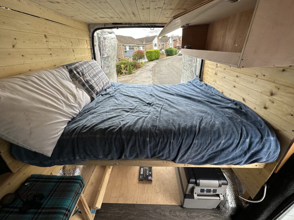 fixed bed, just short of double, 12V alpicool compressor fridge.