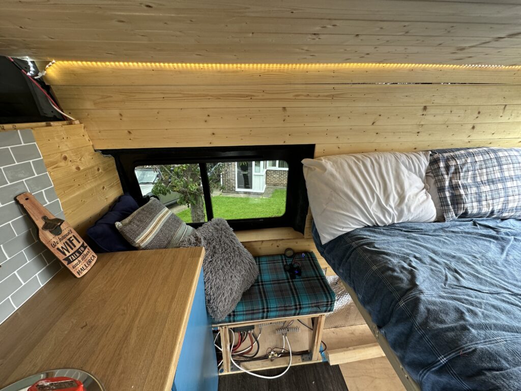 Fast charge USB sockets, cigarette lighter style sockets, 12v LED warm light strip with touch sensitive dimmer switch. Cables around the van for other accessories.