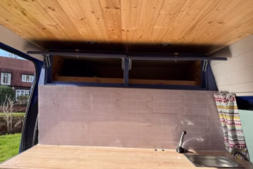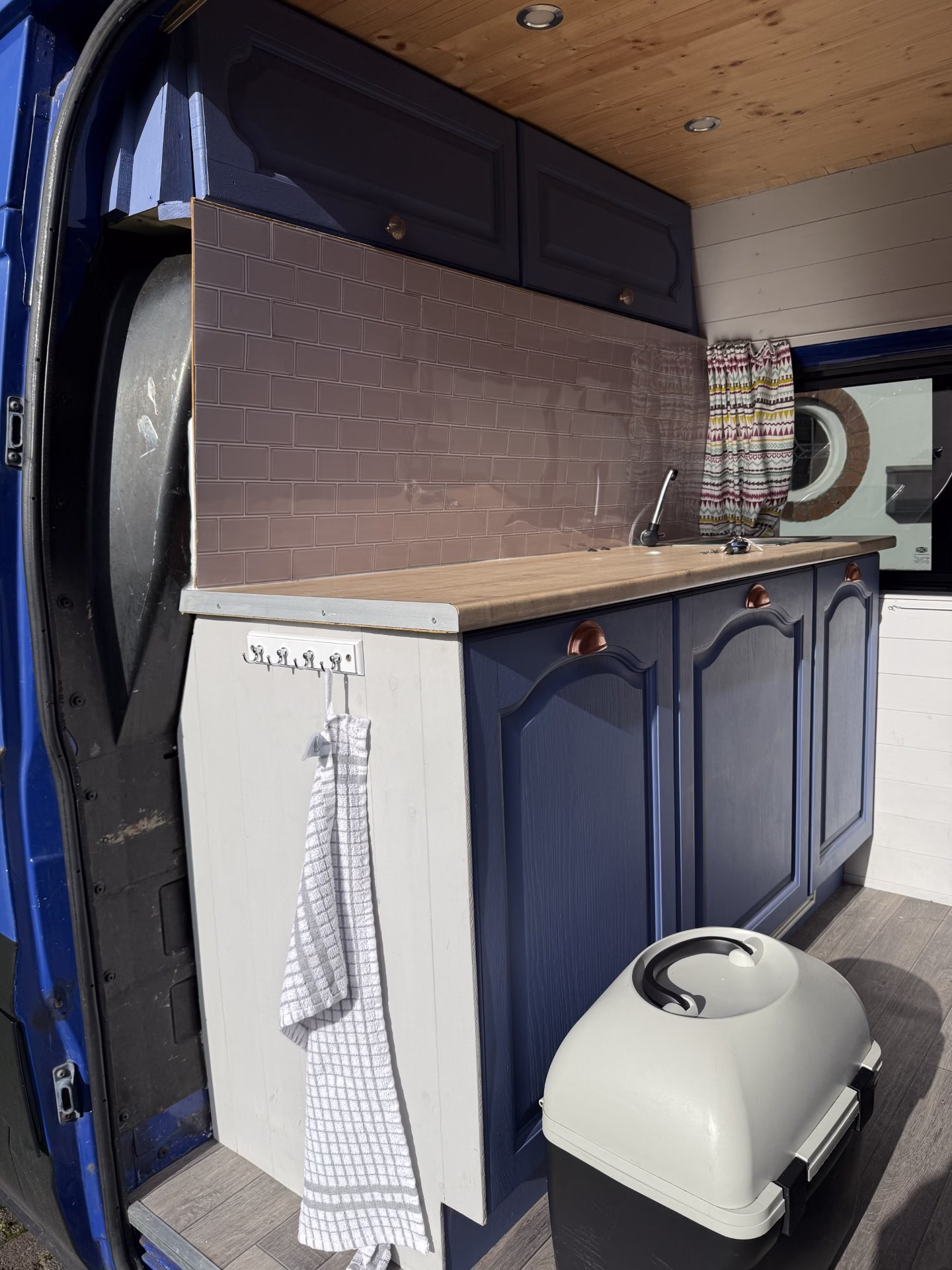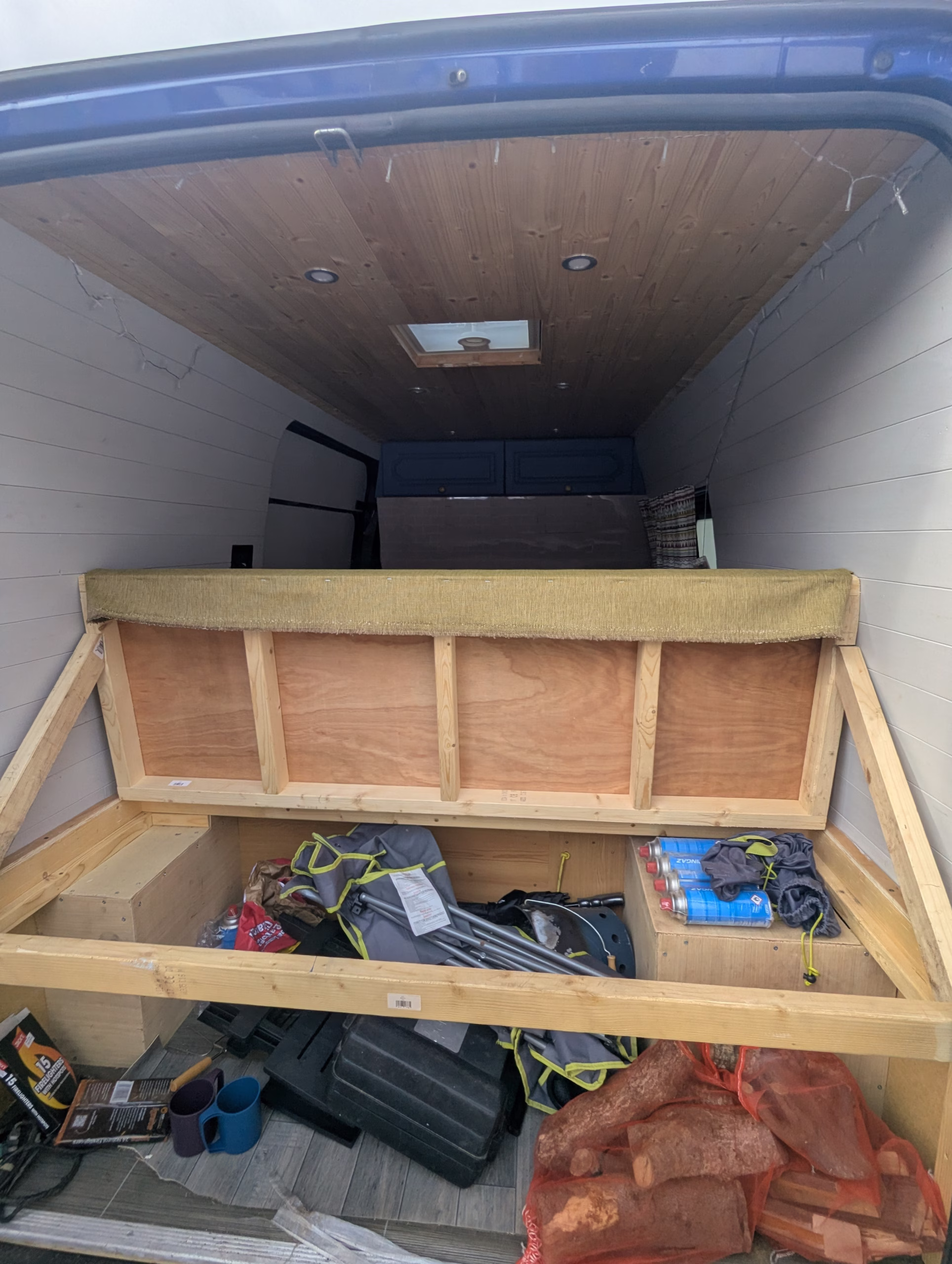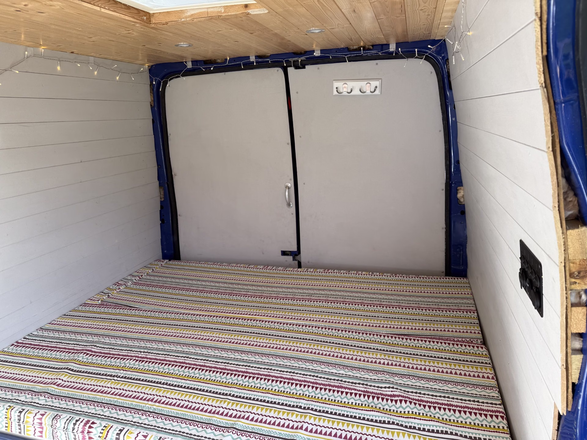 The van was bare when we bought it, the walls and ceiling have been foil lined, insulated with rockwool and panelled with tongue and grove wood. The floor just has 18mm ply to keep as much internal height possible. Electrics wise; it has a leisure battery in the boot that charges when driven and provides power for the internal spot lights and the usb port. There’s a basin with pumped cold water and storage for waste water, portable toilet (brand new), small fridge (that runs off the leisure battery) It has a sliding window with a curtain, a ceiling vent with fly screen and loads of storage! The bed also folds up into a seated position if required.