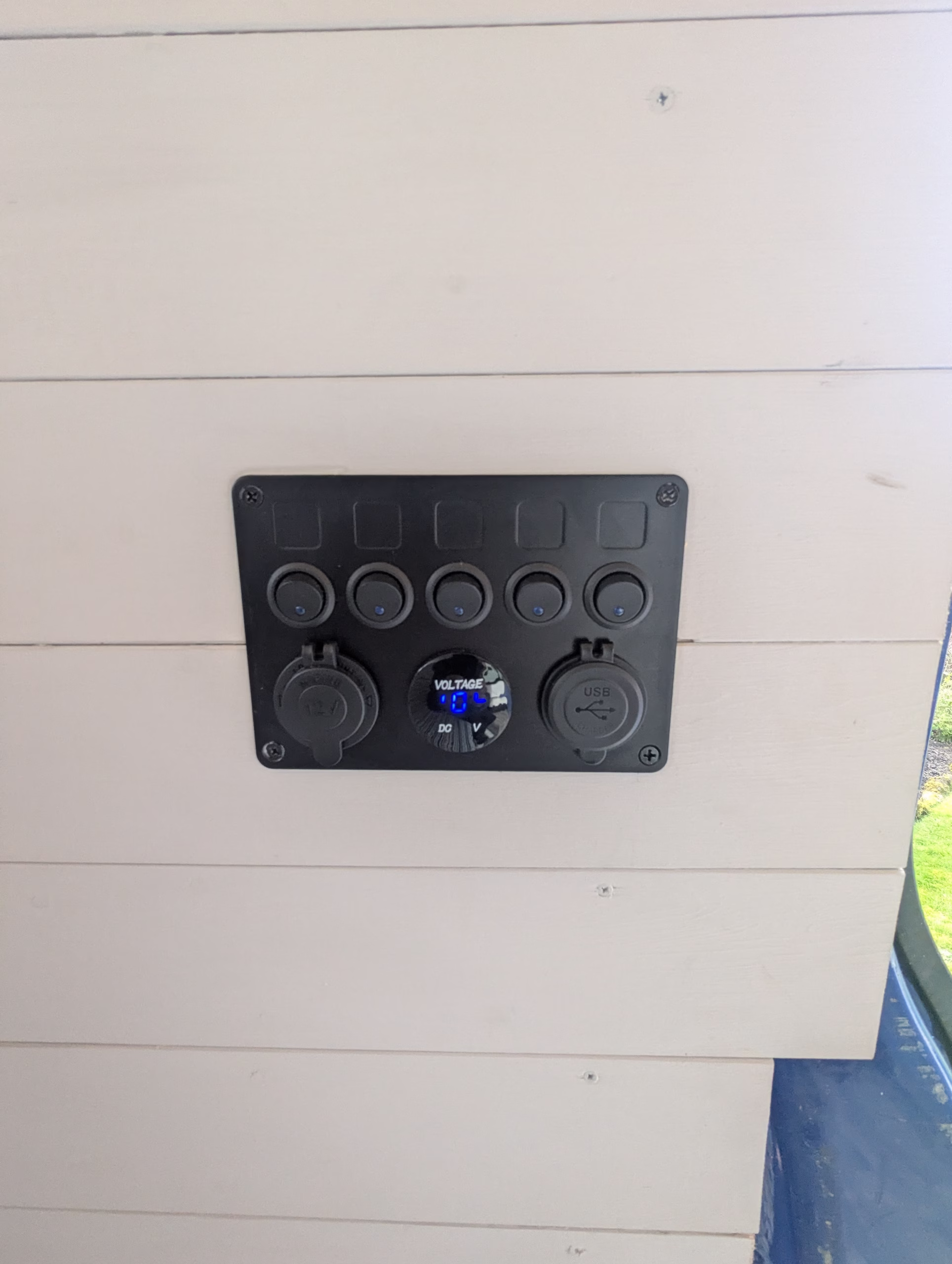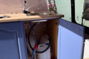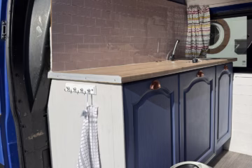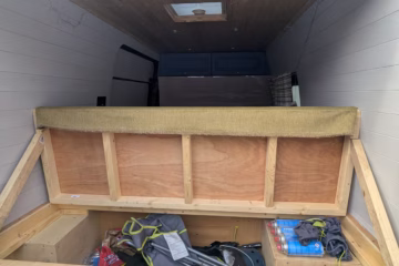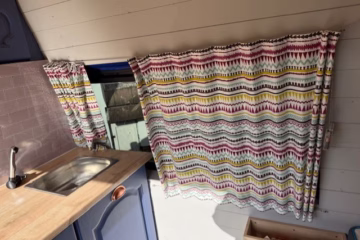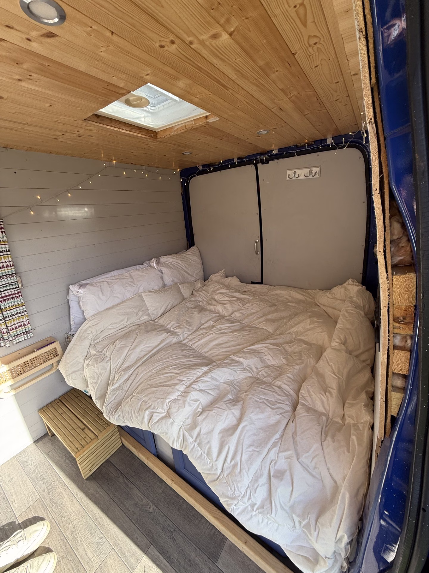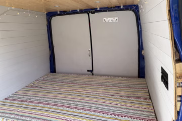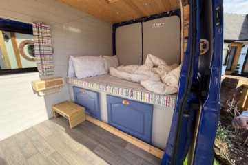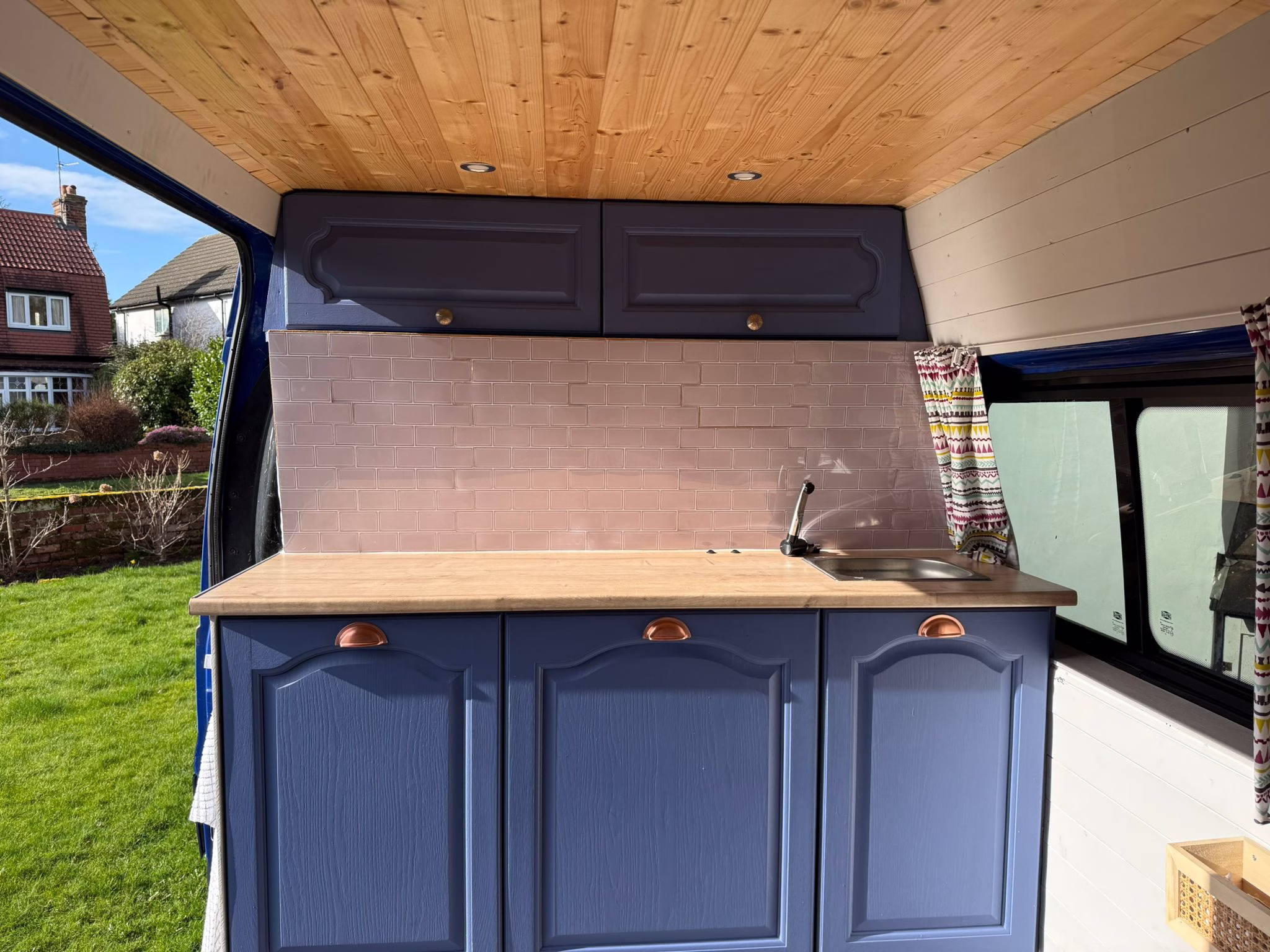 The van was bare when we bought it, the walls and ceiling have been foil lined, insulated with rockwool and panelled with tongue and grove wood. The floor just has 18mm ply to keep as much internal height possible. Electrics wise; it has a leisure battery in the boot that charges when driven and provides power for the internal spot lights and the usb port. There’s a basin with pumped cold water and storage for waste water, portable toilet (brand new), small fridge (that runs off the leisure battery) It has a sliding window with a curtain, a ceiling vent with fly screen and loads of storage! The bed also folds up into a seated position if required.