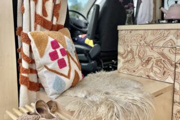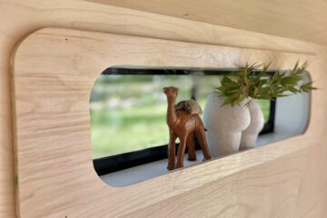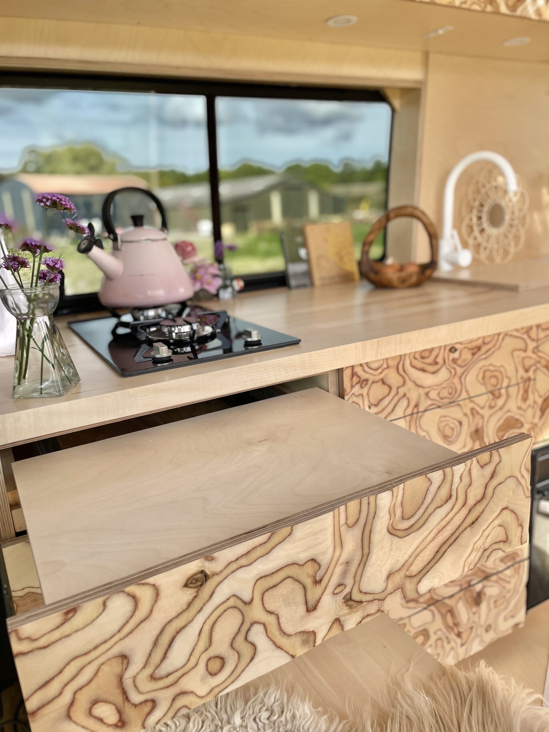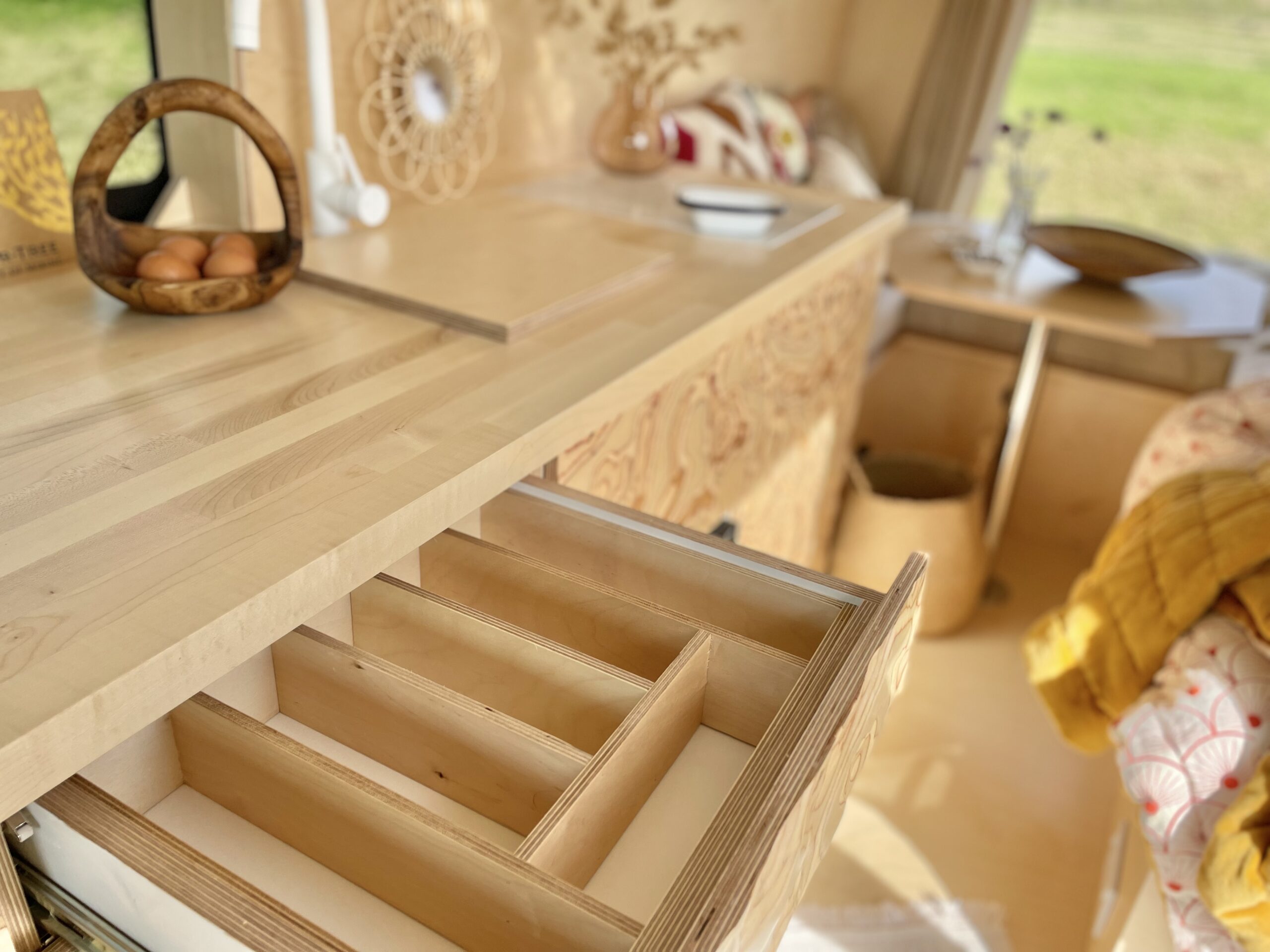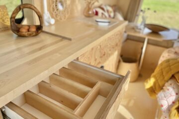 As you enter the van there is a beautiful hand crafted shoe rack with leather loops above to tuck away shoes and coats to keep the space clutter free. A couple of nooks, above the cab and beneath the kitchen window, provide space for spices and all things nice. We believe that within a small space functionality is important but that doesn’t mean it can’t all be beautiful too. Hidden away in the bench seat is the battery and toilet. The cupboard next door hides everything electrical and is wonderfully accessible in this location. Above this cupboard is a pull out extra bit of worktop, you know, just in case! Next door are three roomy drawers, one with a custom birch ply cutlery tray.