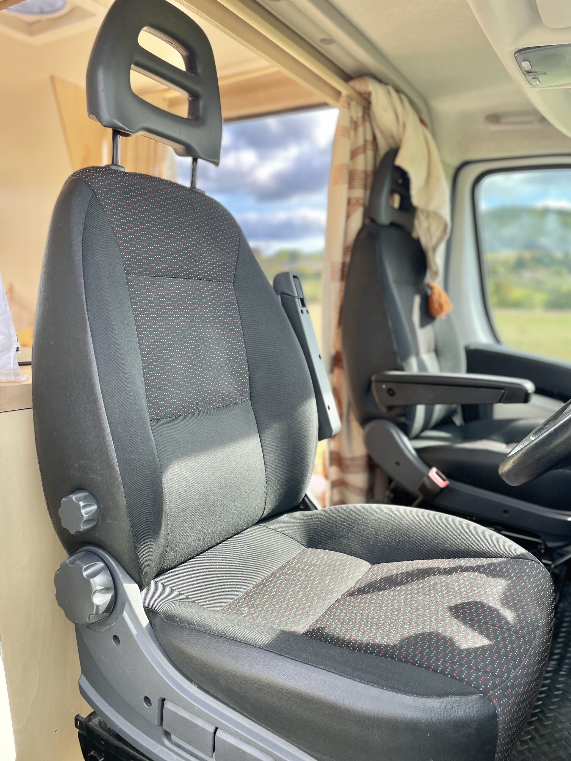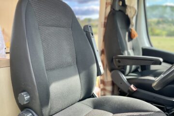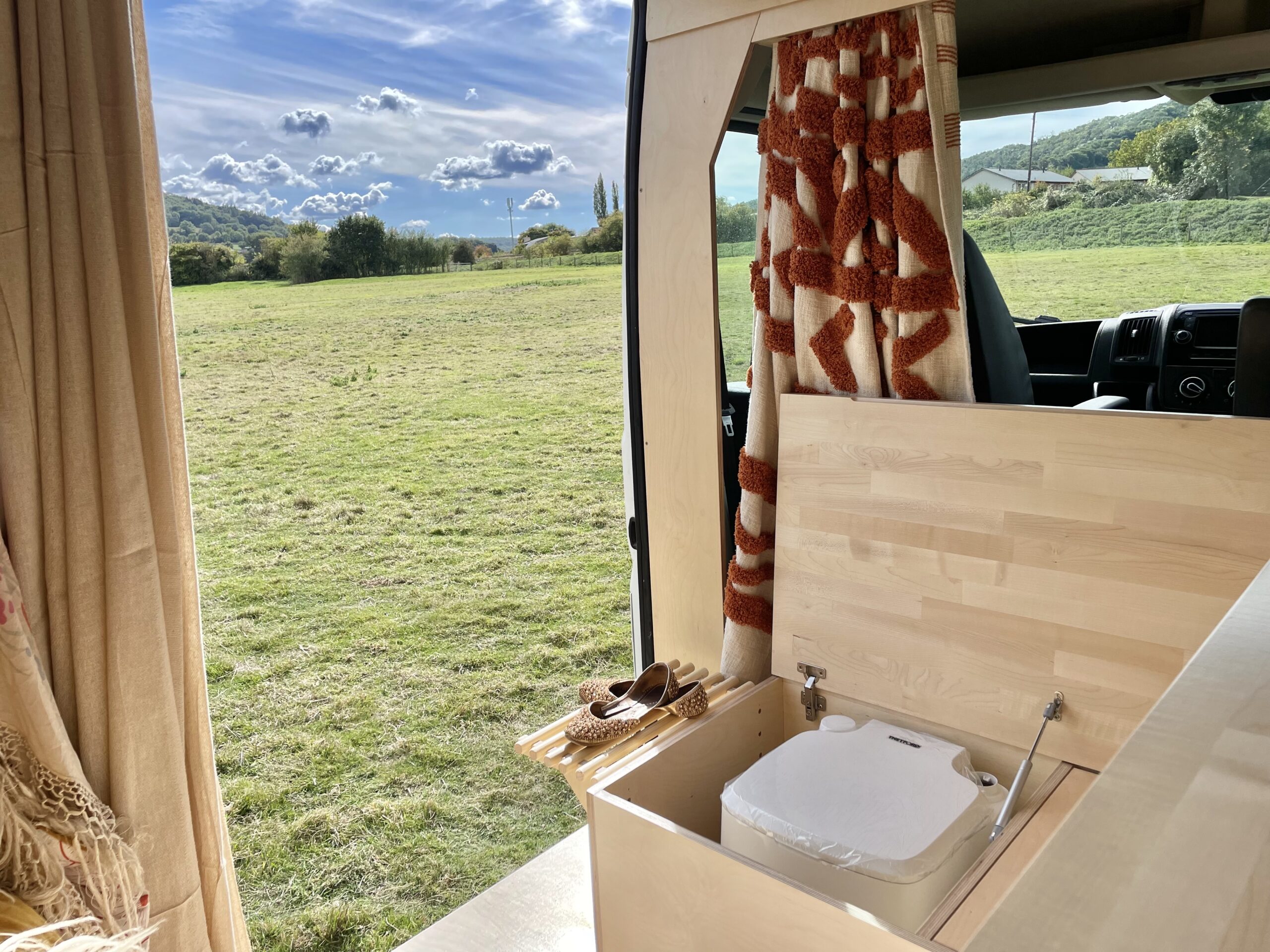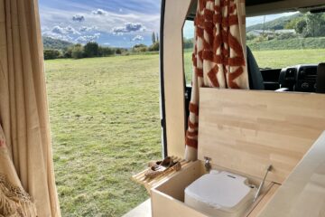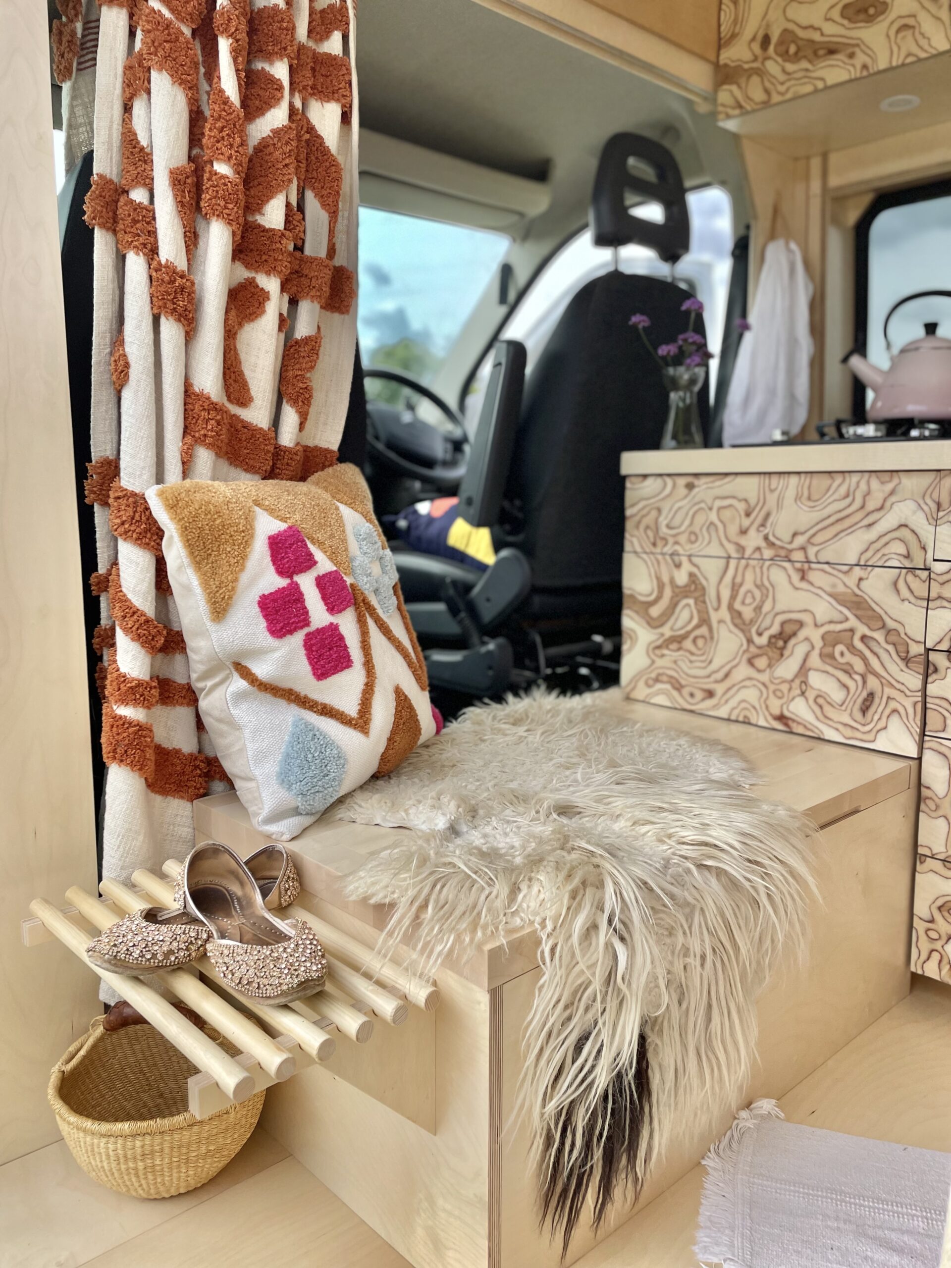 As you enter the van there is a beautiful hand crafted shoe rack with leather loops above to tuck away shoes and coats to keep the space clutter free. A couple of nooks, above the cab and beneath the kitchen window, provide space for spices and all things nice. We believe that within a small space functionality is important but that doesn’t mean it can’t all be beautiful too. Hidden away in the bench seat is the battery and toilet. The cupboard next door hides everything electrical and is wonderfully accessible in this location. Above this cupboard is a pull out extra bit of worktop, you know, just in case! Next door are three roomy drawers, one with a custom birch ply cutlery tray.