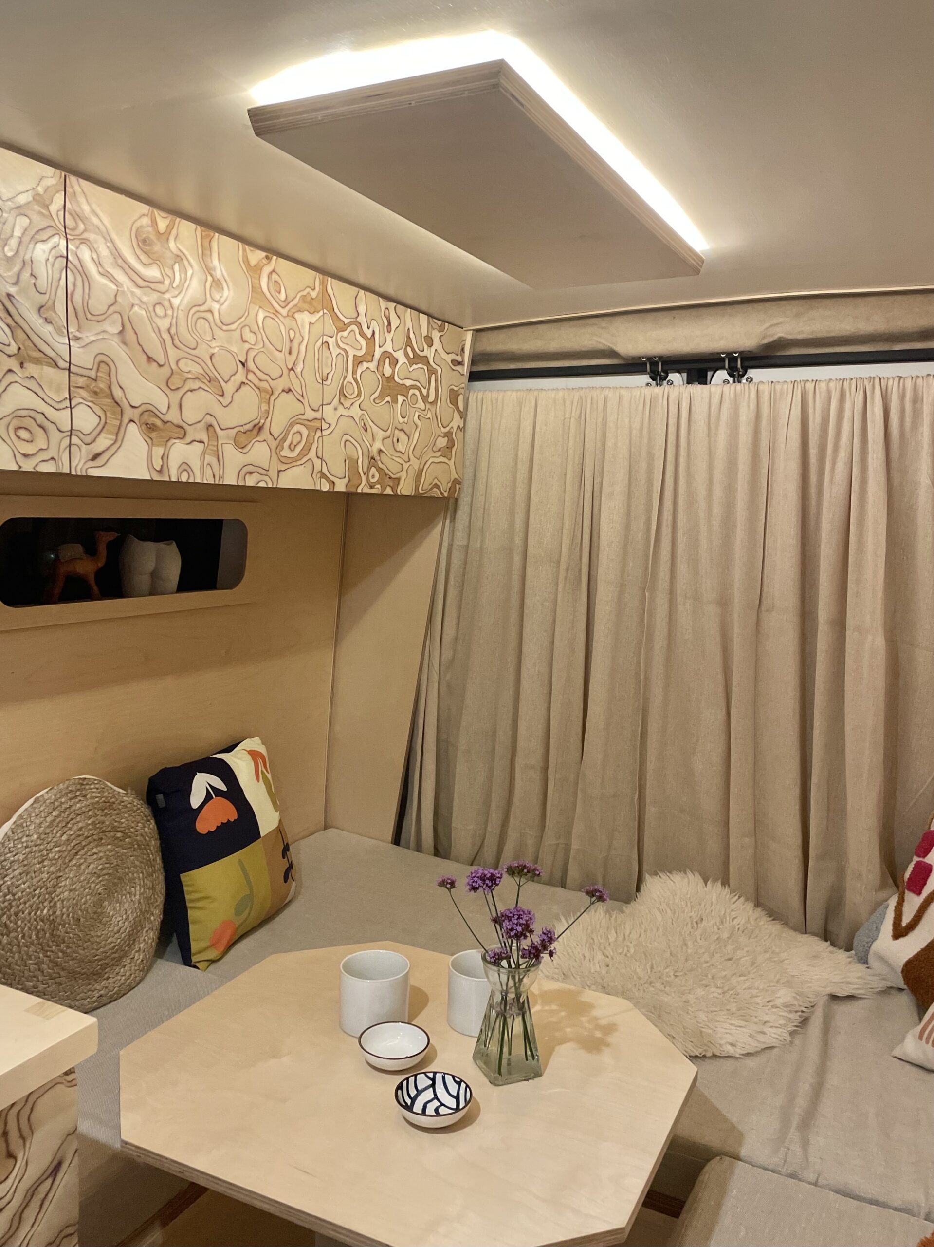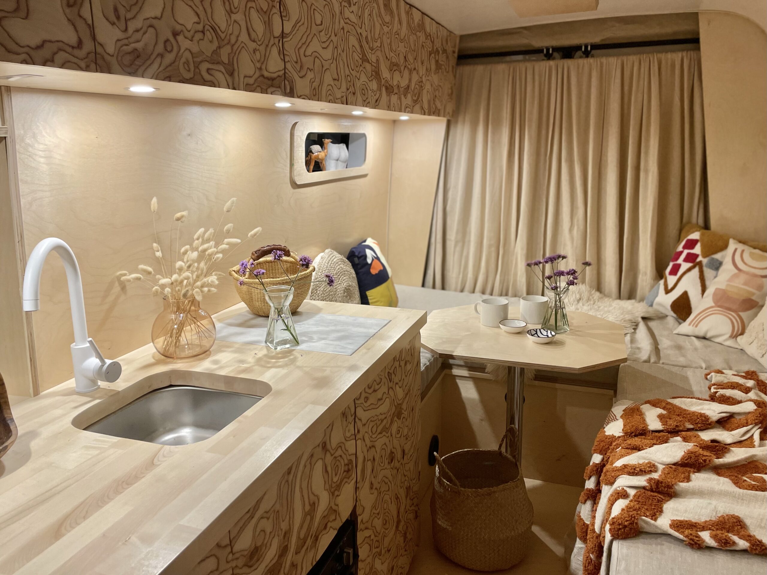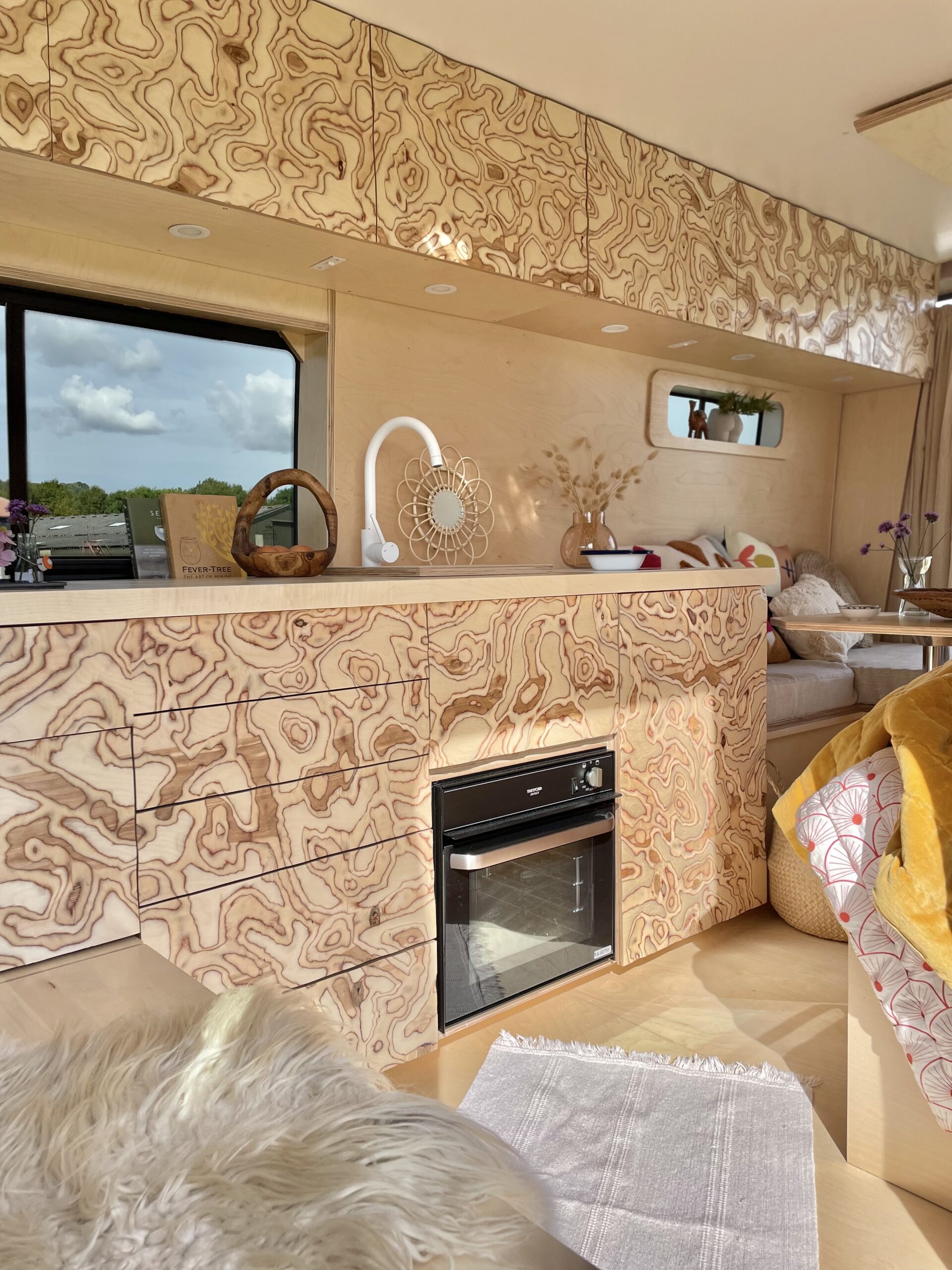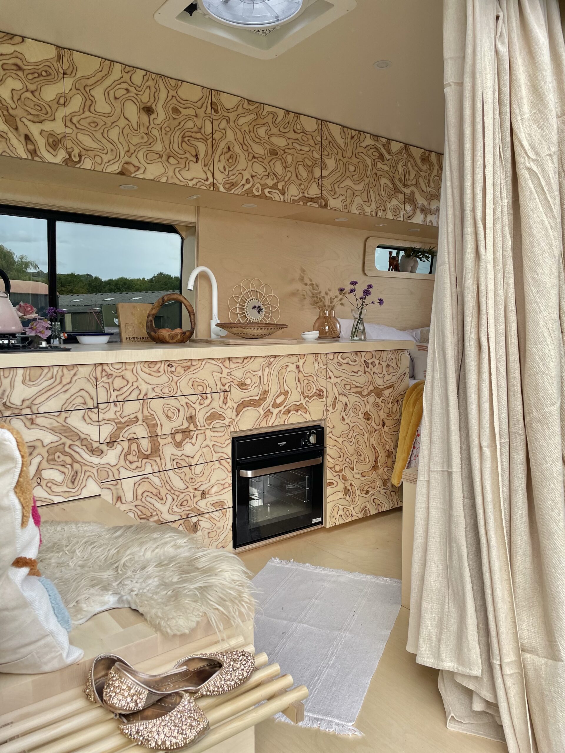 Almost entirely crafted from birch ply with a natural lacquer, where possible we’ve chosen organic material which is mirrored by the soft furnishings; natural stonewashed twill linen seating and cotton curtains. We’ve used a sweet technique on the cupboard faces to create texture both visually and to the touch which is very rarely seen. We love it, and hope you do too!