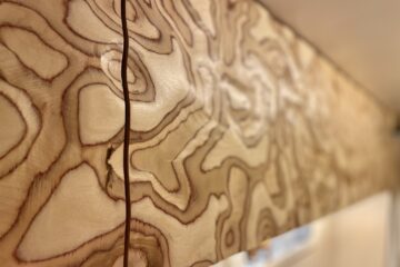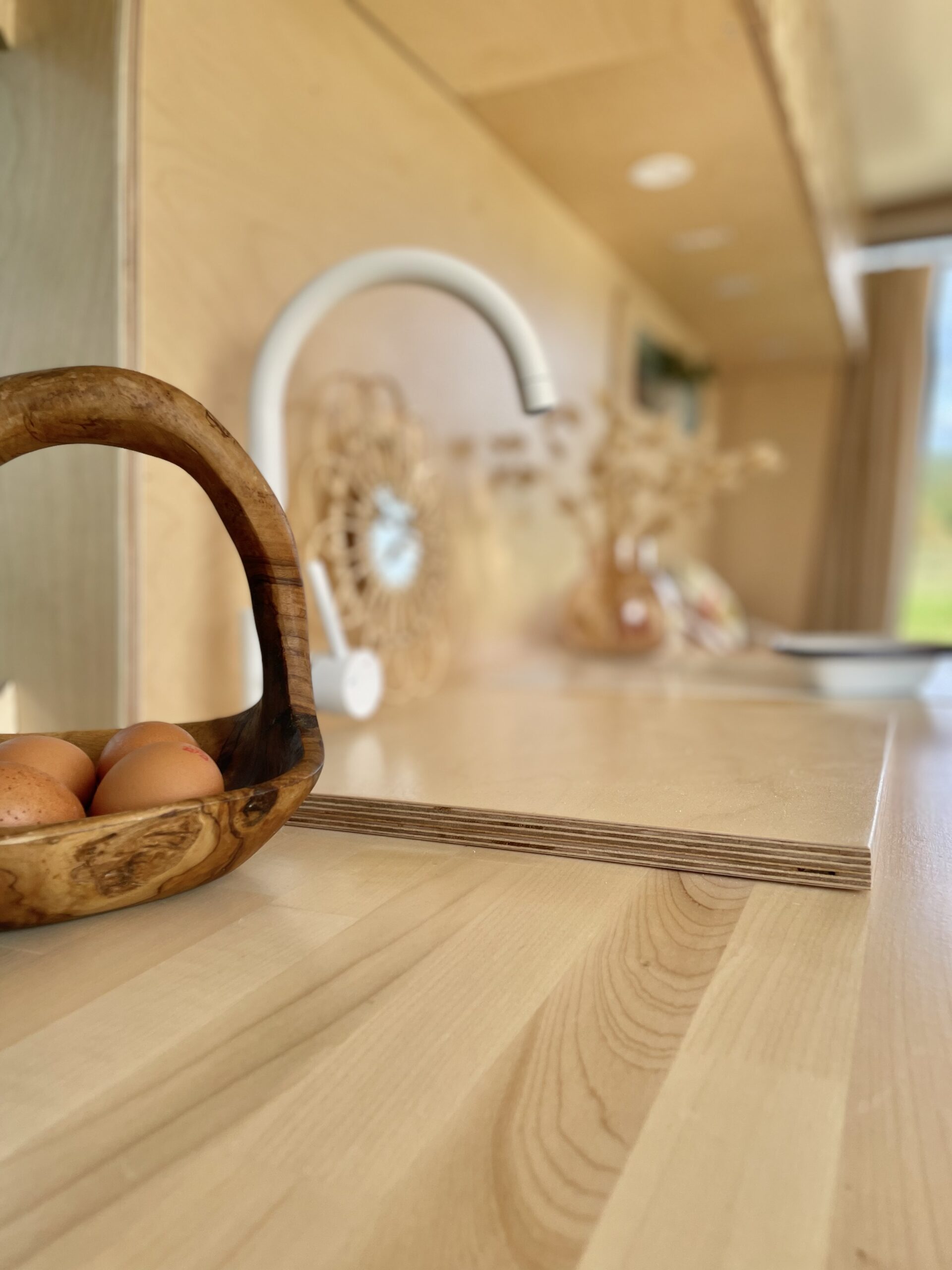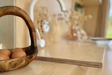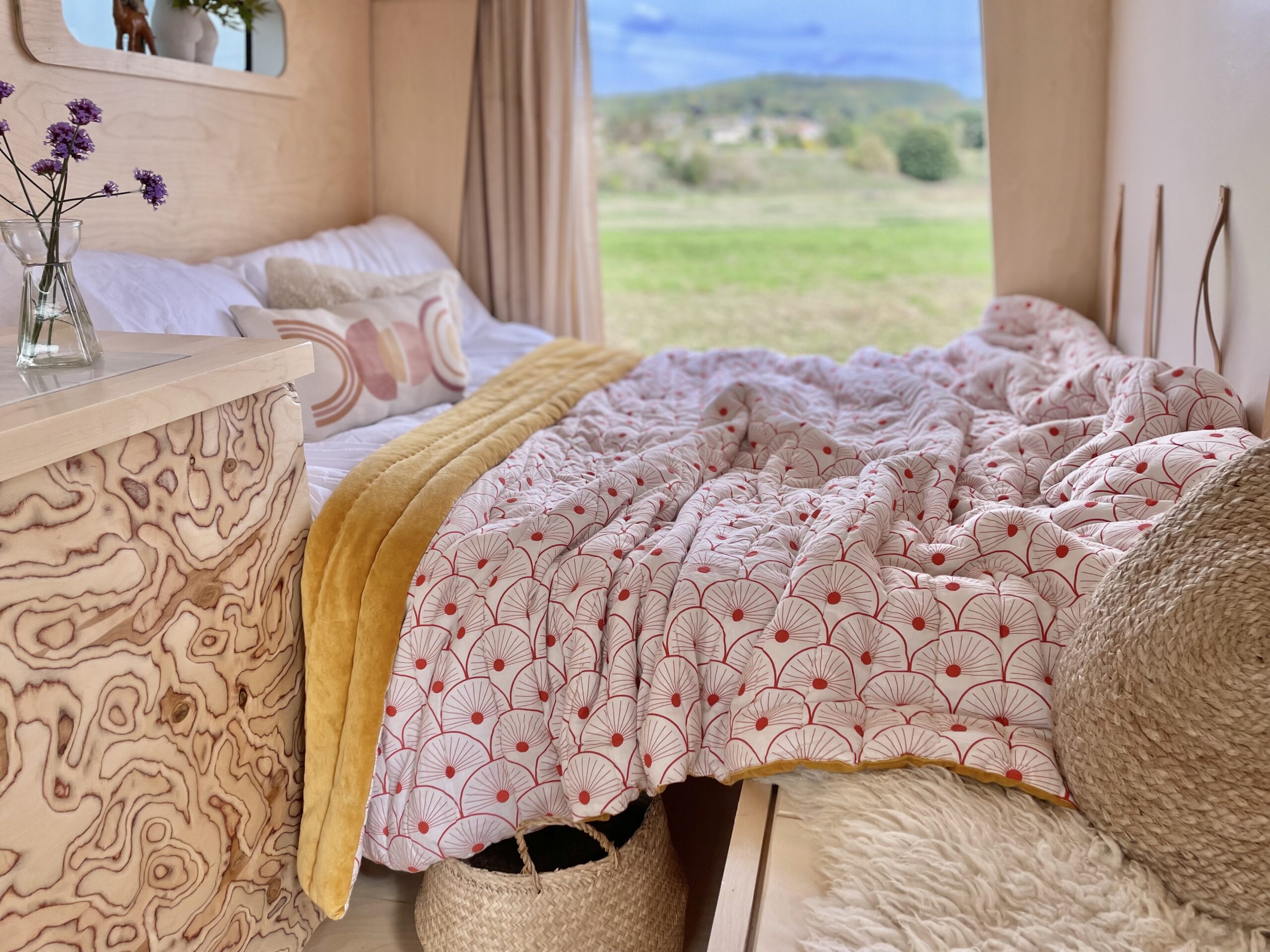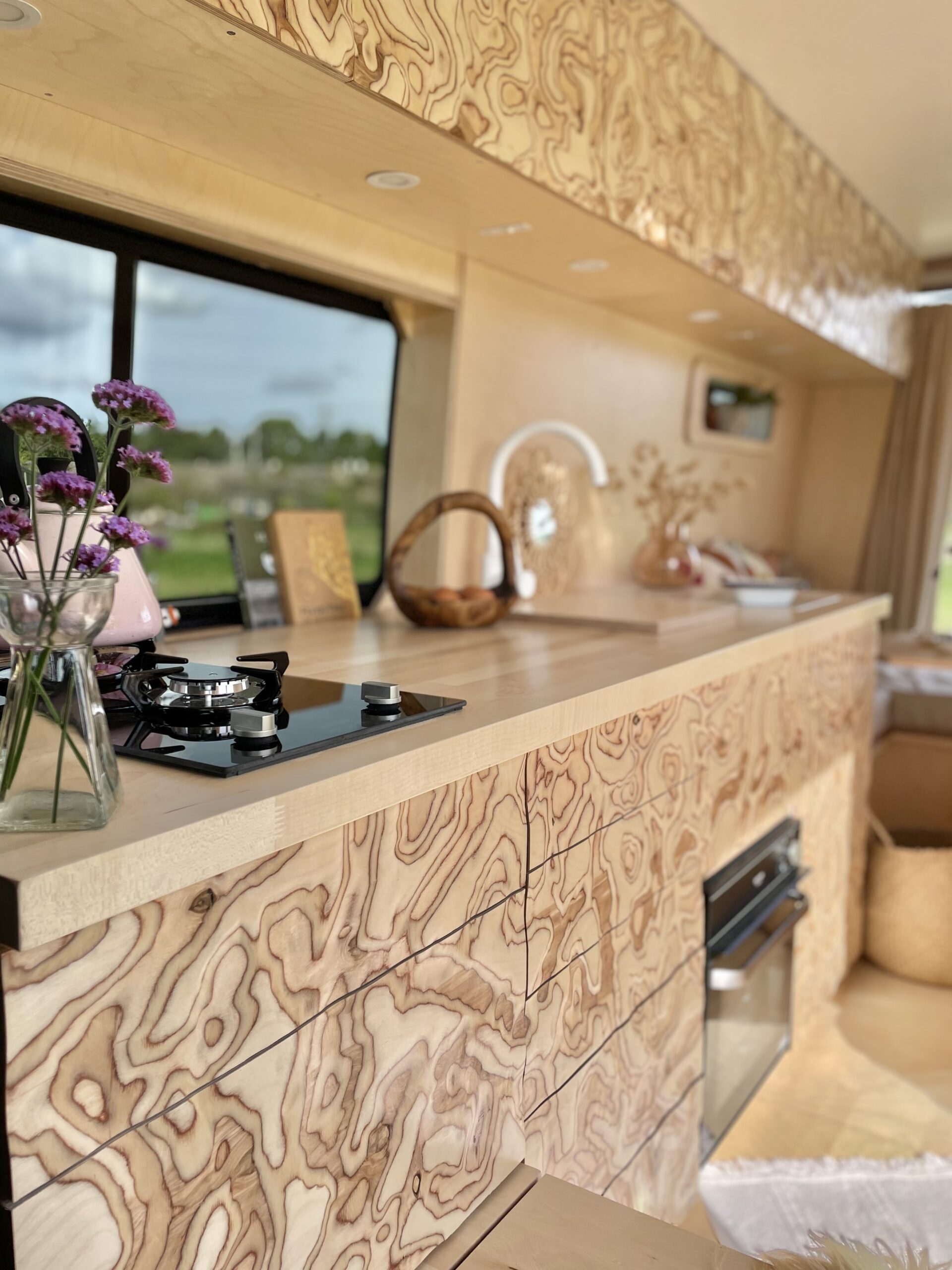 Almost entirely crafted from birch ply with a natural lacquer, where possible we’ve chosen organic material which is mirrored by the soft furnishings; natural stonewashed twill linen seating and cotton curtains. We’ve used a sweet technique on the cupboard faces to create texture both visually and to the touch which is very rarely seen. We love it, and hope you do too!